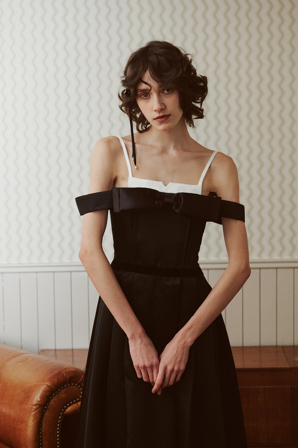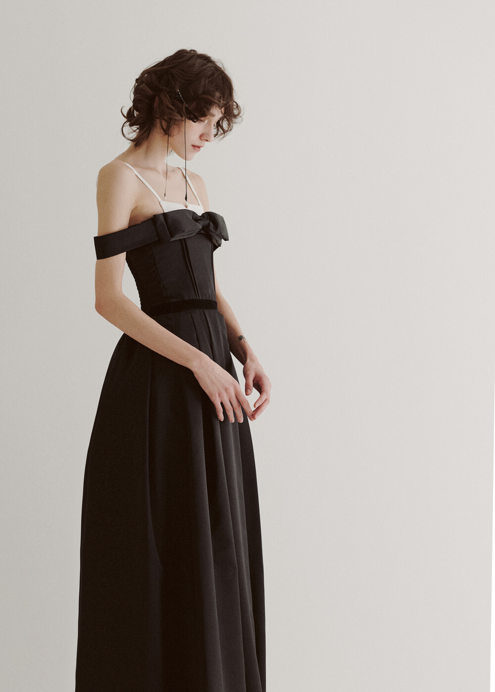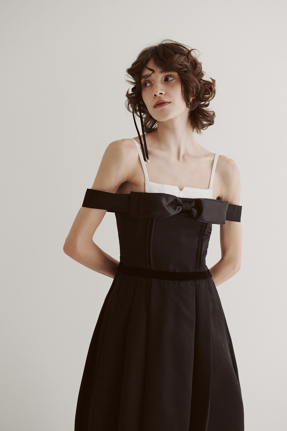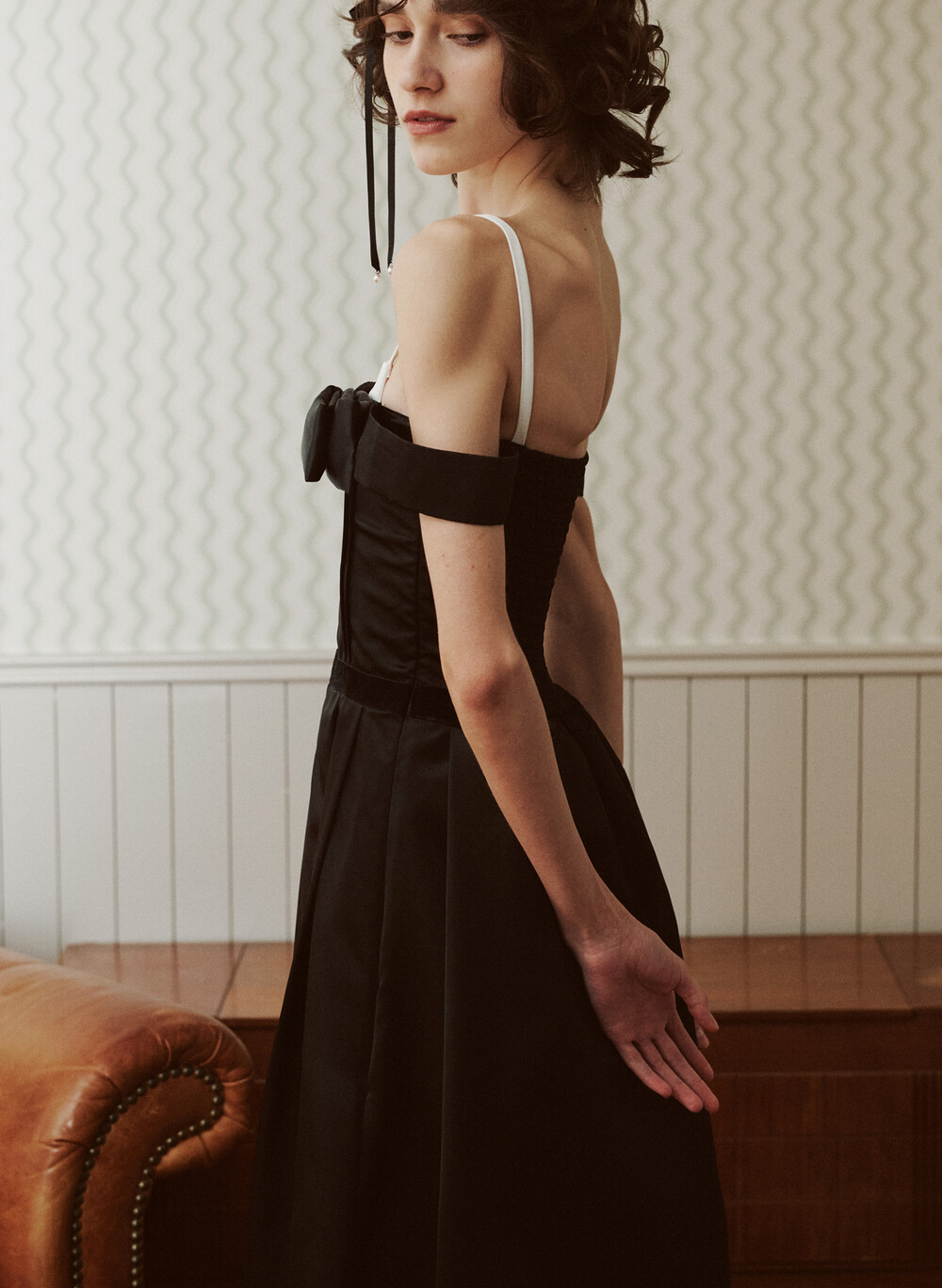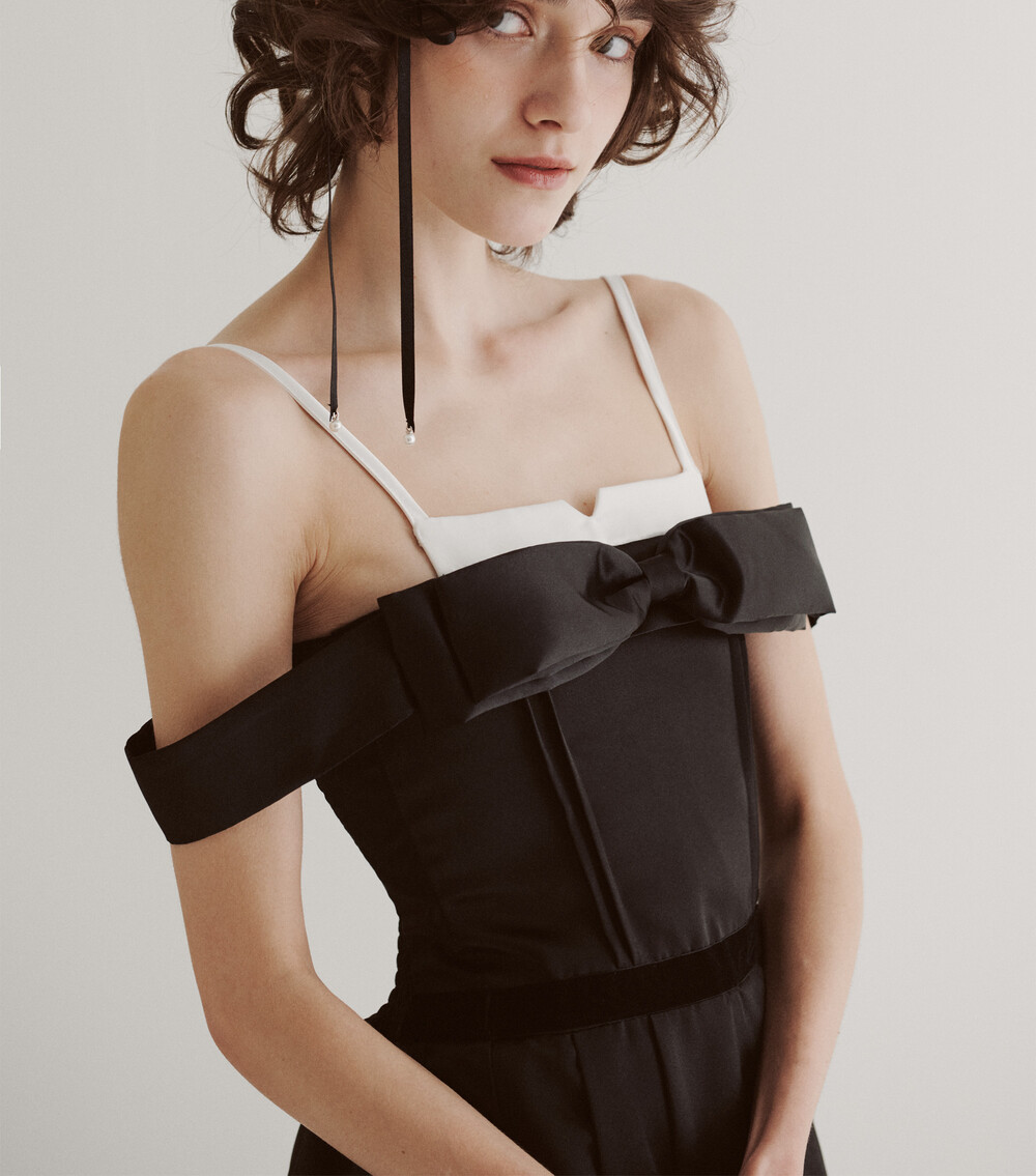 리본이 얹어진 견고한 밴드가 가슴선에서부터 어깨까지 반듯하게 이어져있어 우아하고 여리여리한 무드를 연출합니다. 특히 가슴선에 2개의 리본을 얹어 볼륨감을 더했습니다.