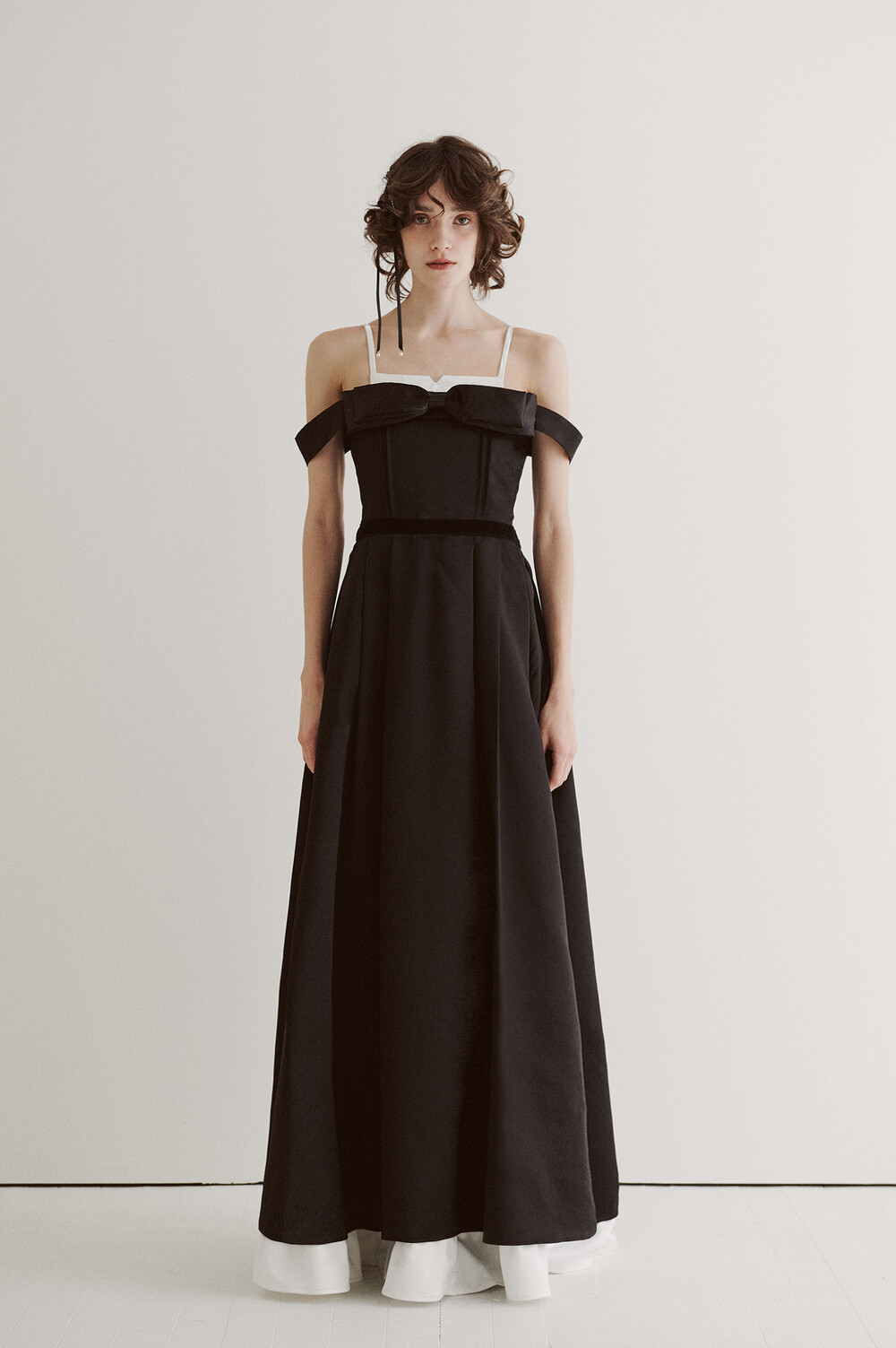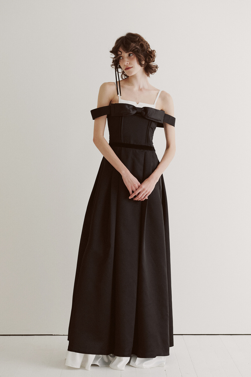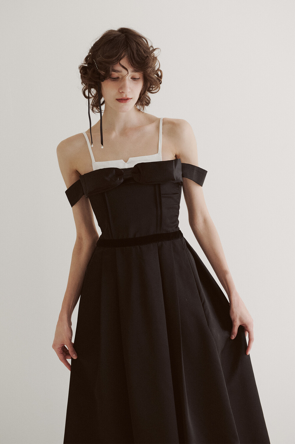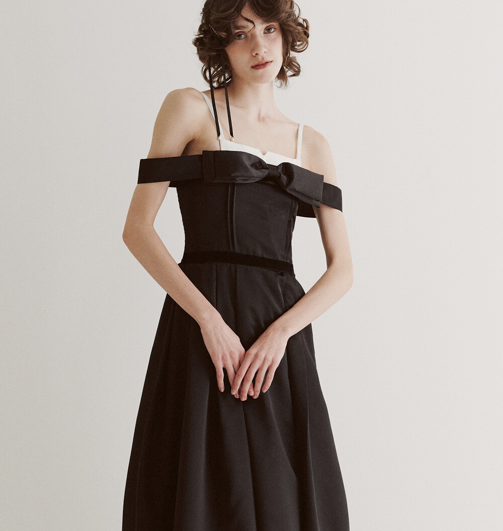 리본이 얹어진 견고한 밴드가 가슴선에서부터 어깨까지 반듯하게 이어져있어 우아하고 여리여리한 무드를 연출합니다. 특히 가슴선에 2개의 리본을 얹어 볼륨감을 더했습니다.