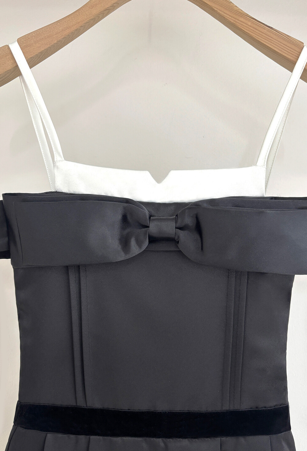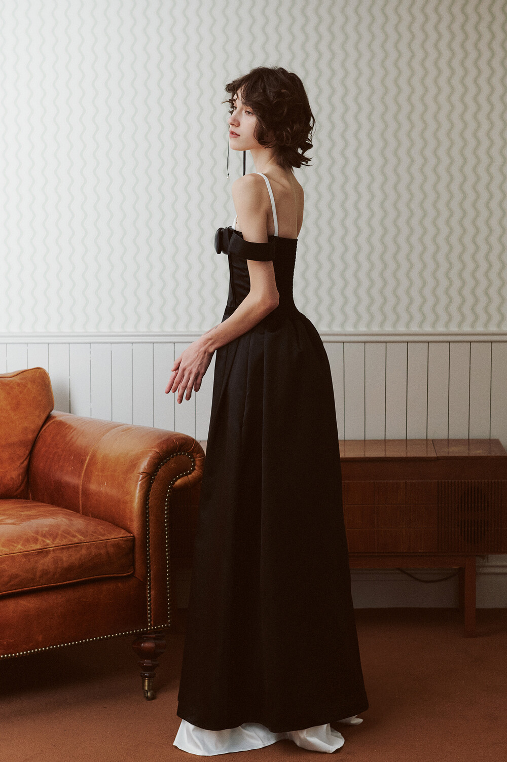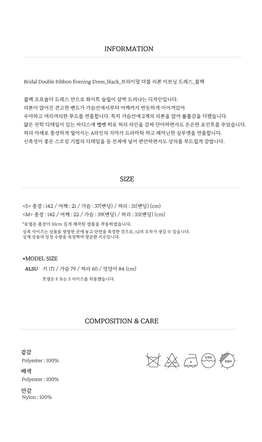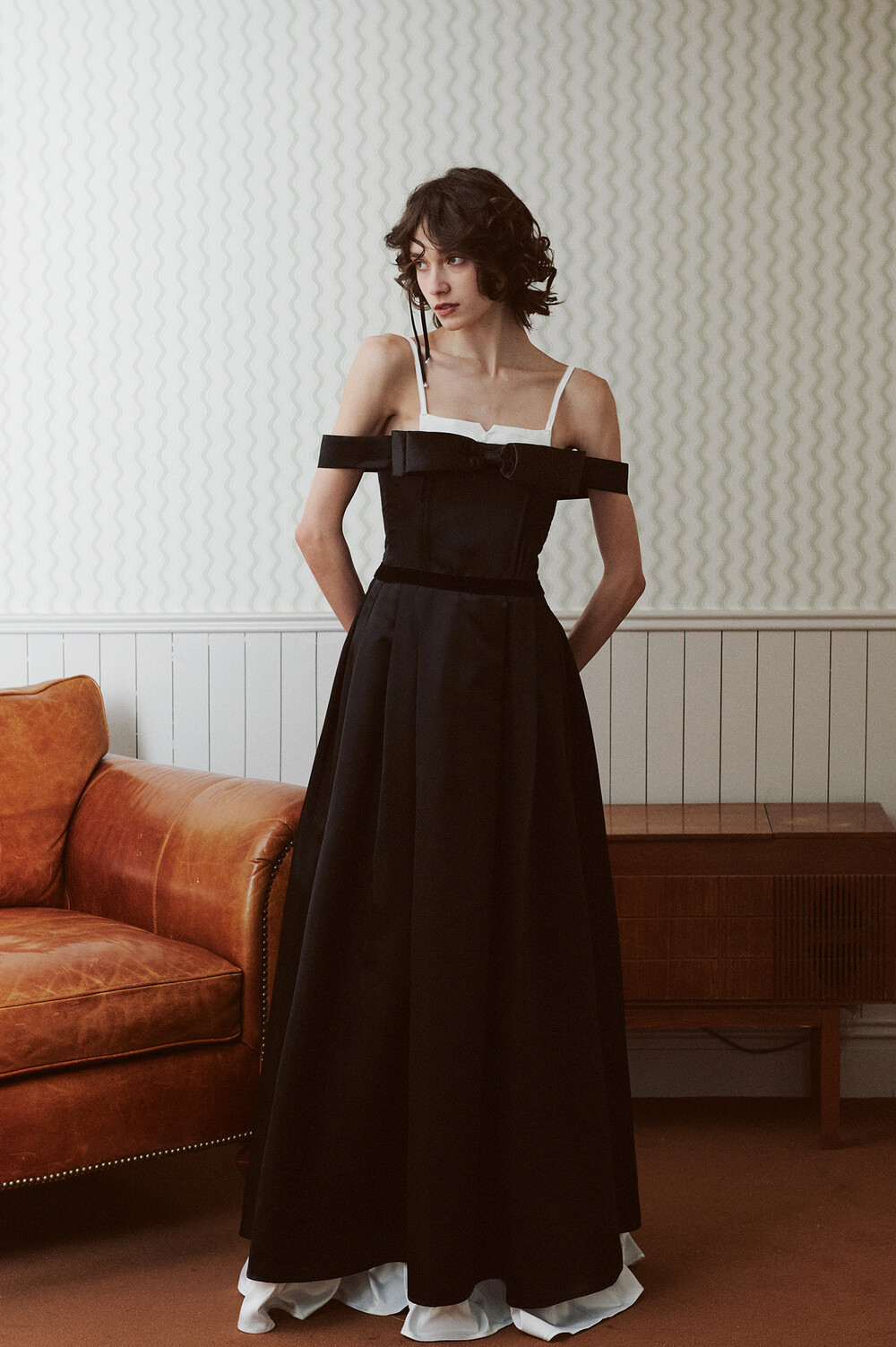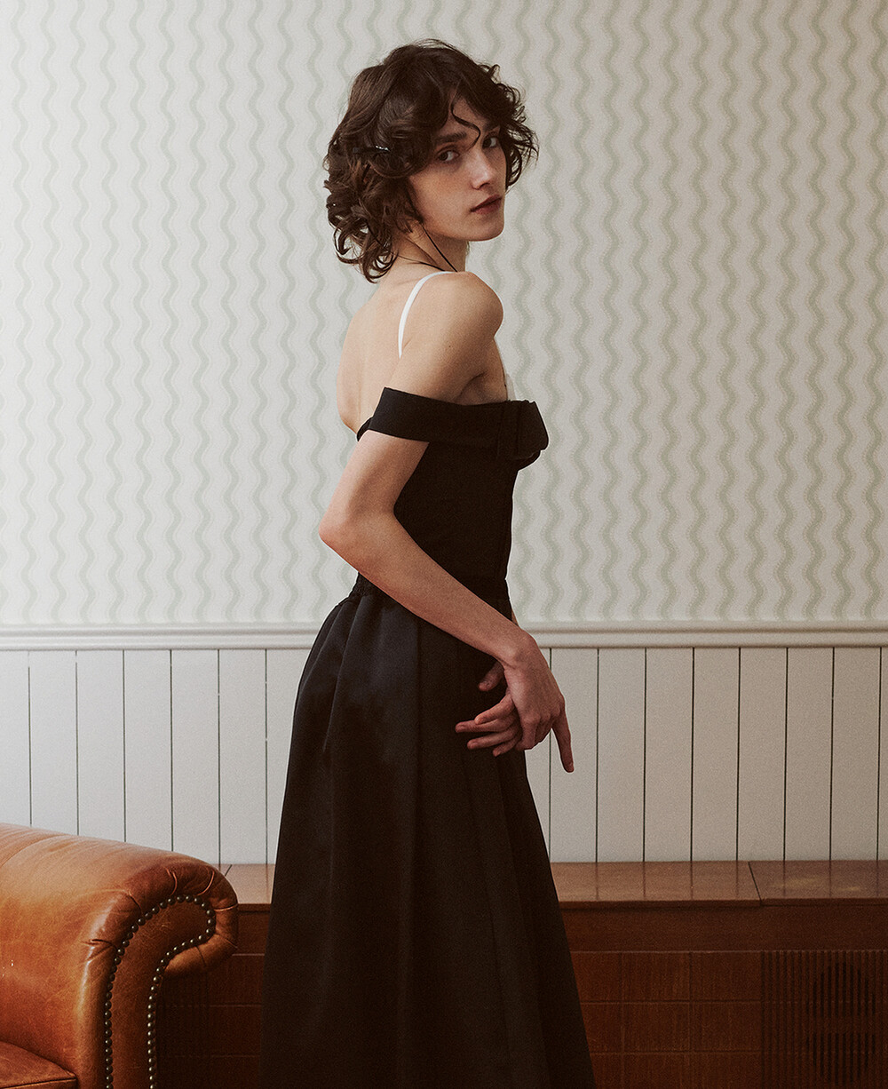 리본이 얹어진 견고한 밴드가 가슴선에서부터 어깨까지 반듯하게 이어져있어 우아하고 여리여리한 무드를 연출합니다. 특히 가슴선에 2개의 리본을 얹어 볼륨감을 더했습니다.