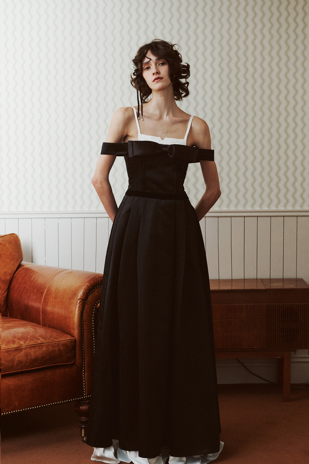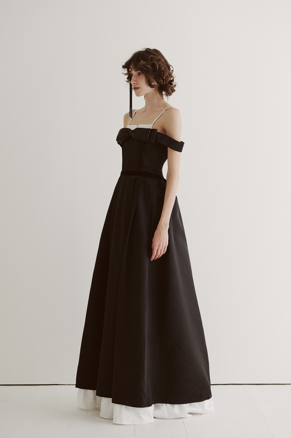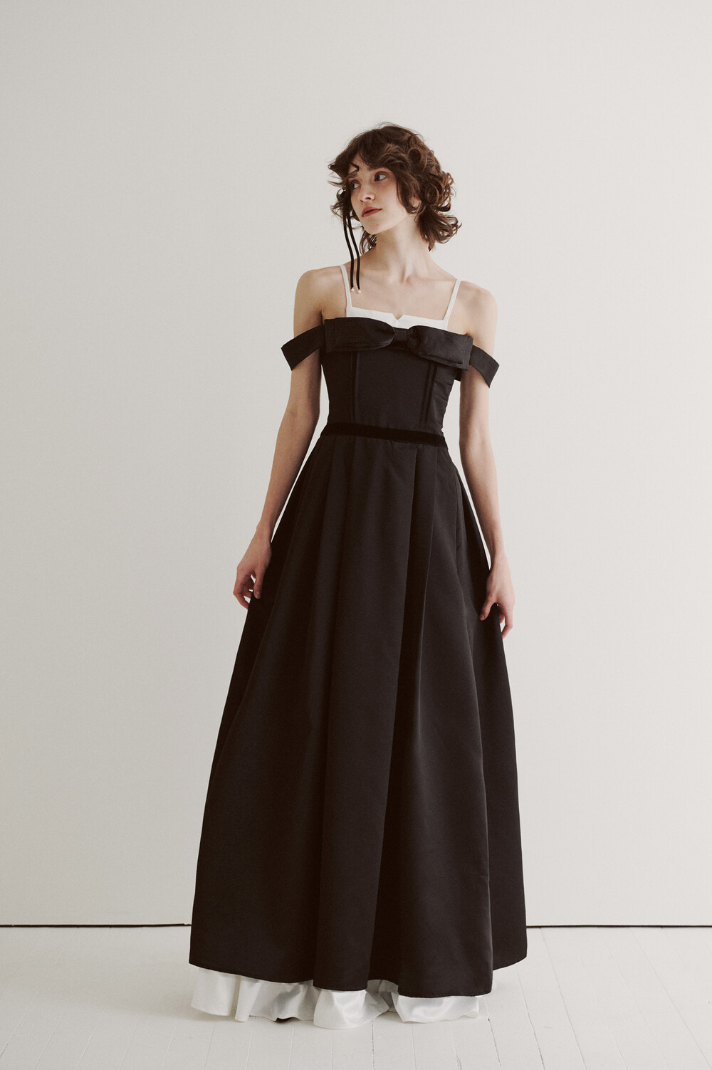 얇은 핀턱 디테일이 있는 바디스에 벨벳 띠로 허리 라인을 감싸 단아하면서도 은은한 포인트를 주었습니다.