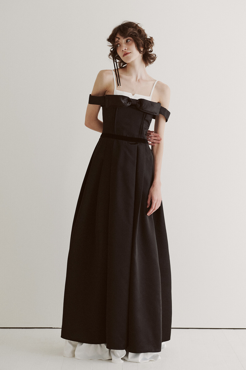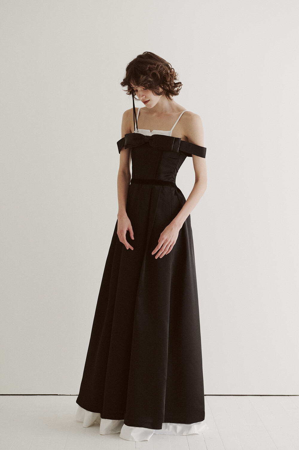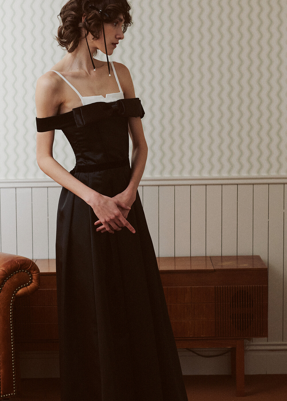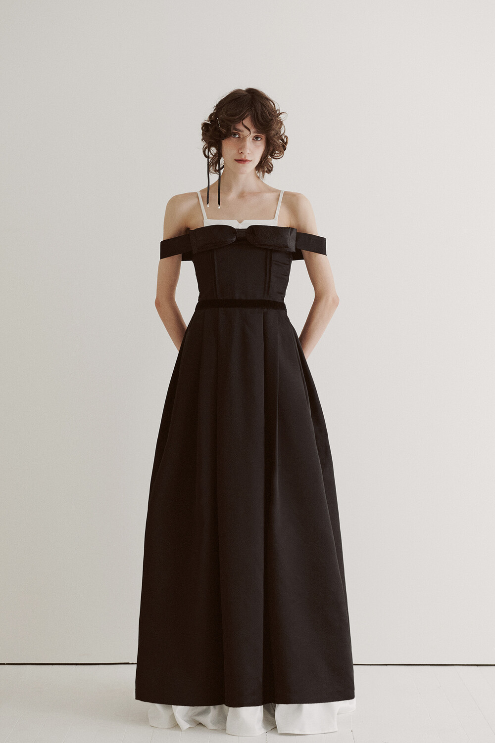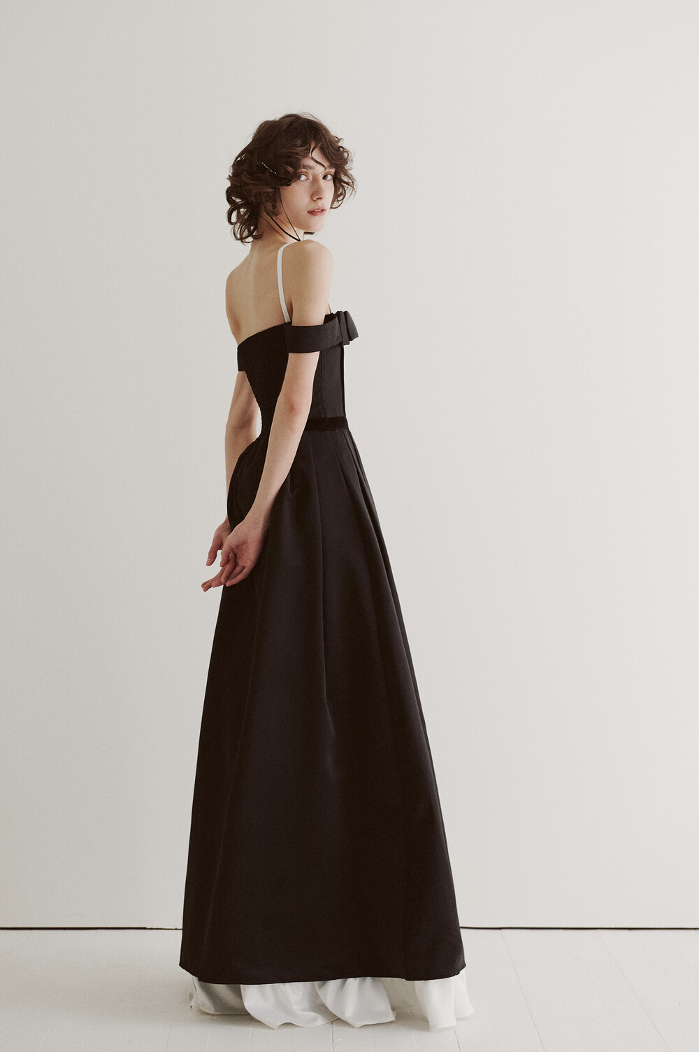 블랙 오프숄더 드레스 안으로 화이트 슬립이 살짝 드러나는 디자인입니다.