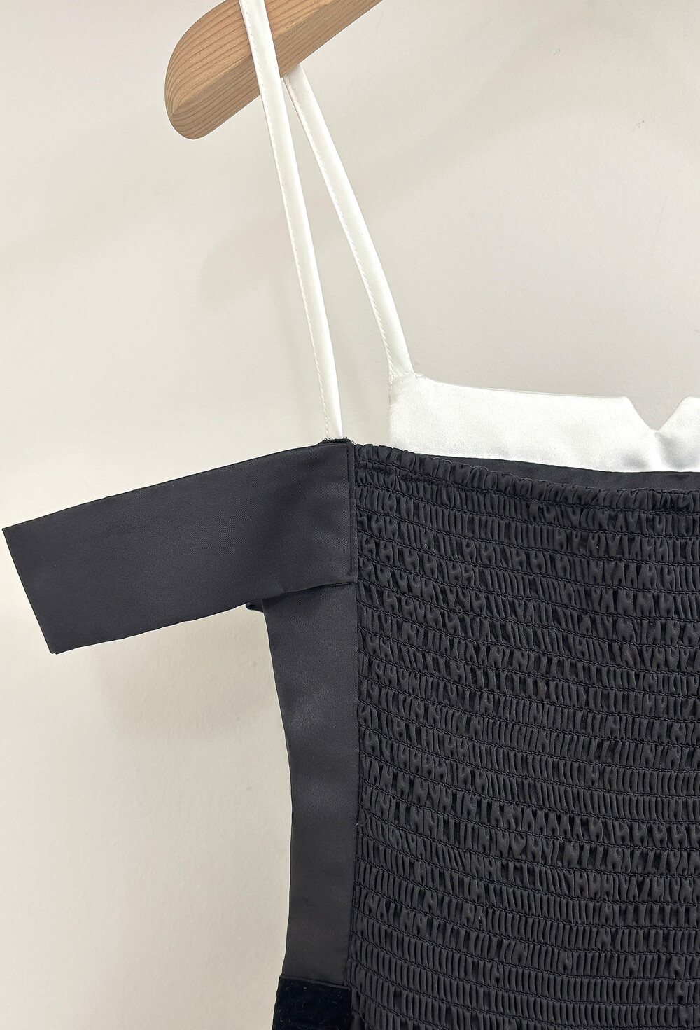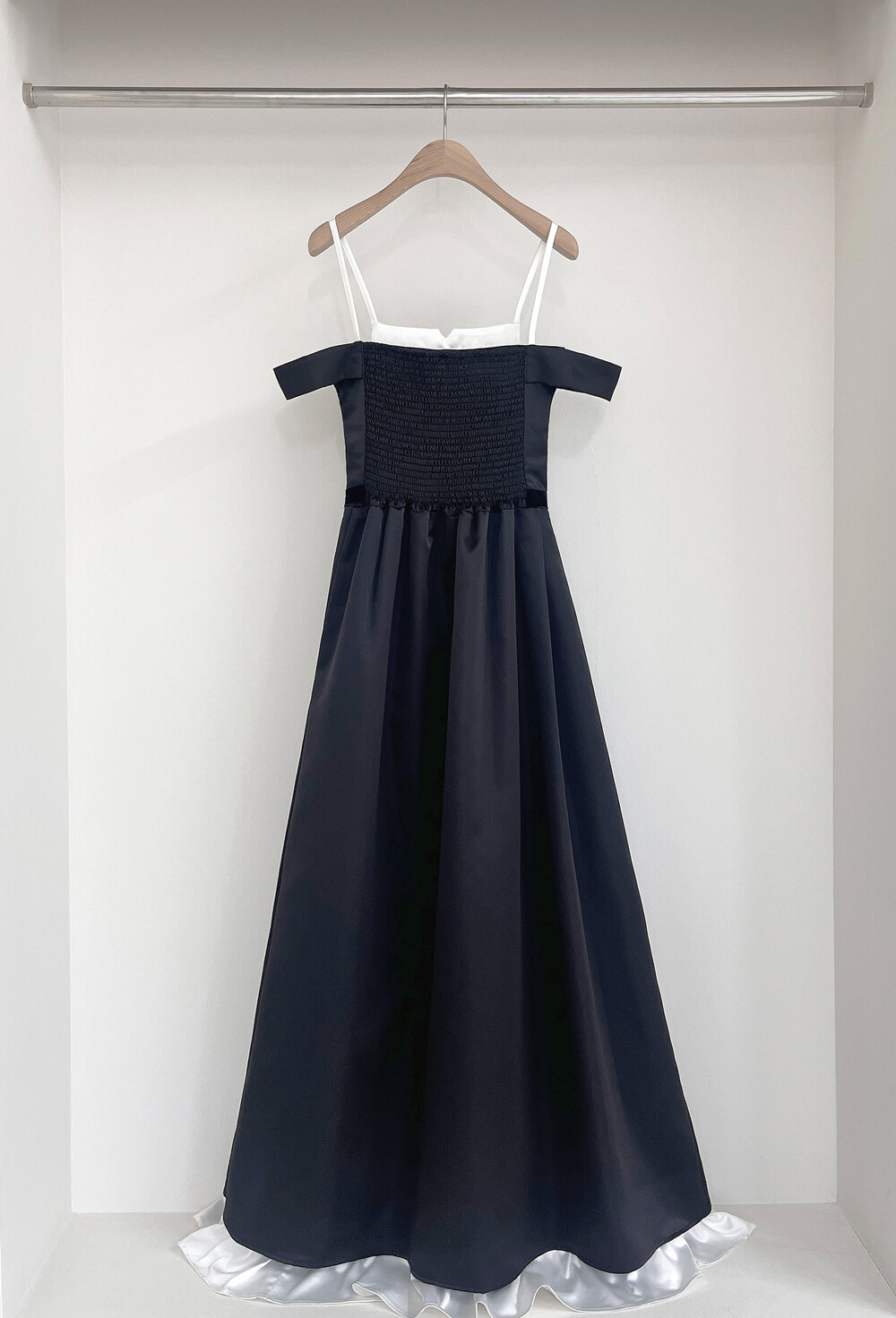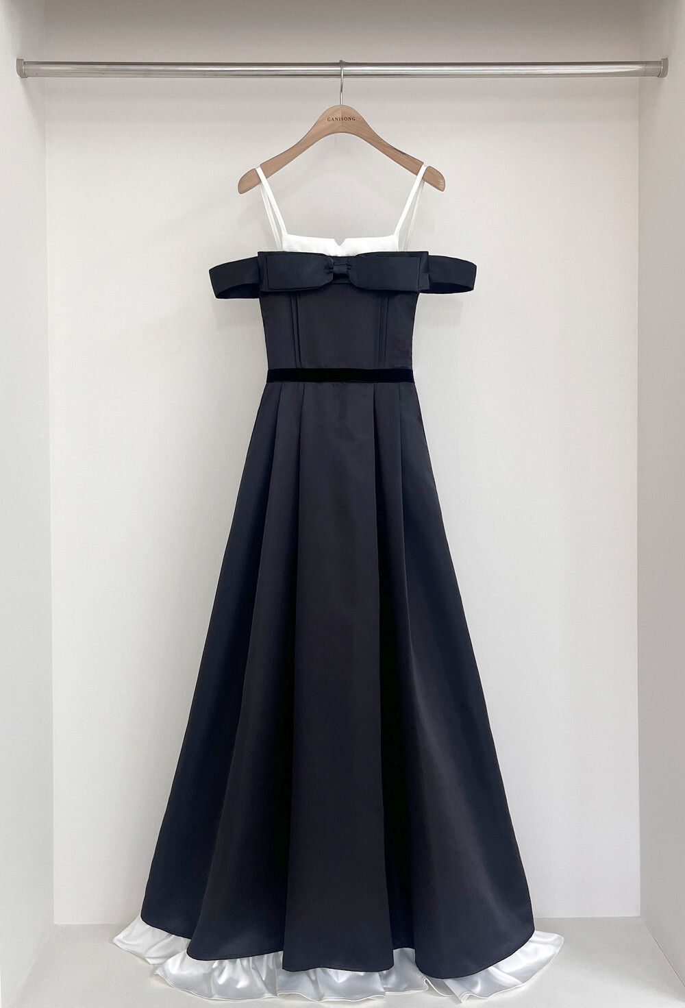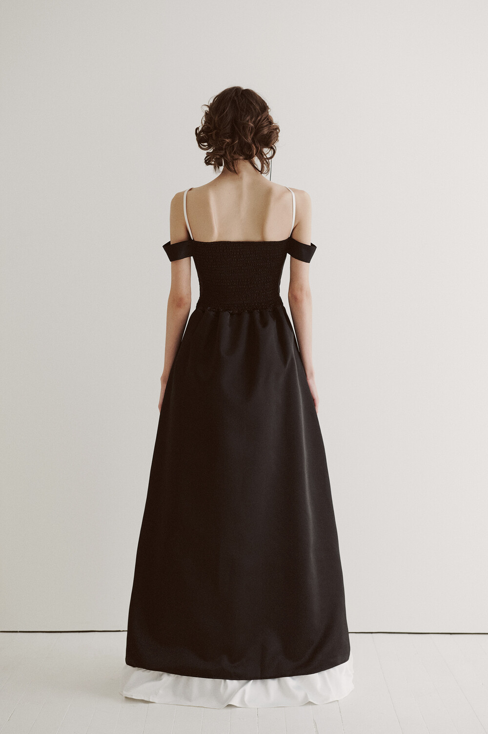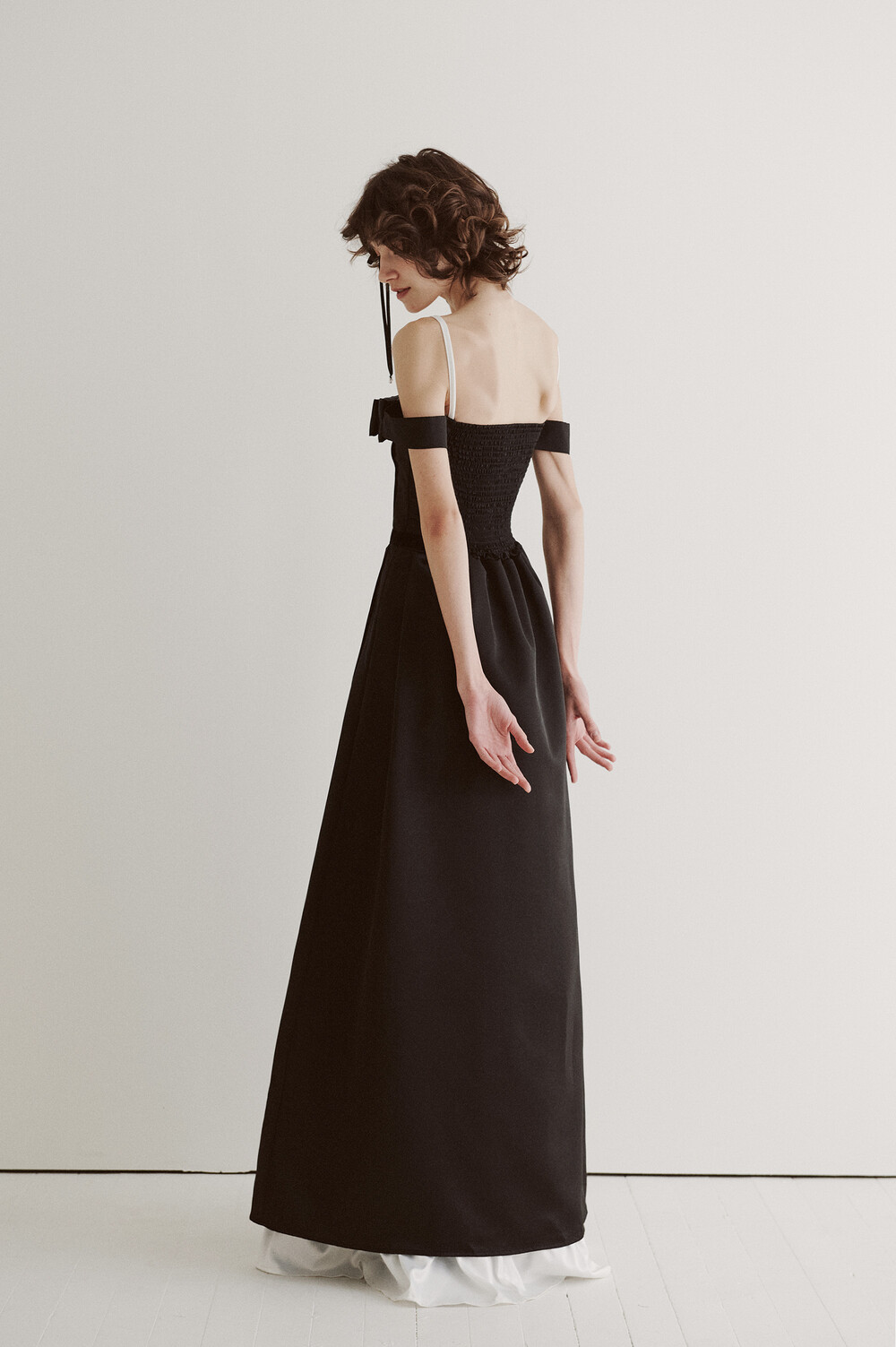 블랙 오프숄더 드레스 안으로 화이트 슬립이 살짝 드러나는 디자인입니다.