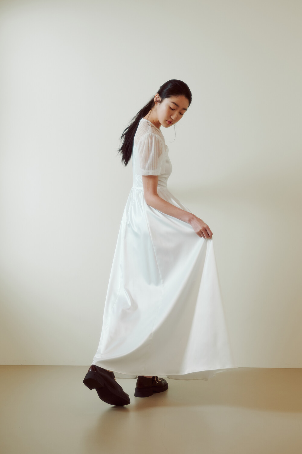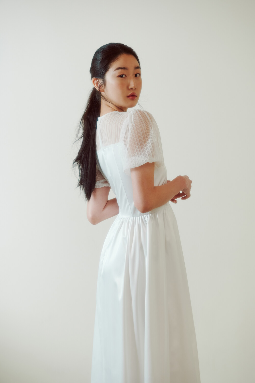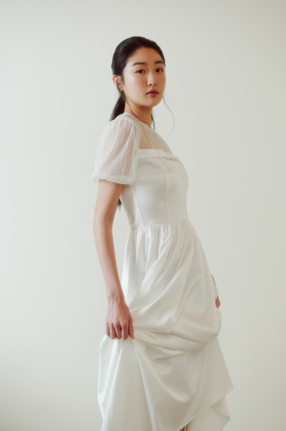 하의 부분은 풍성한 분량의 셔링을 잡아 넓게 퍼지는 실루엣입니다.