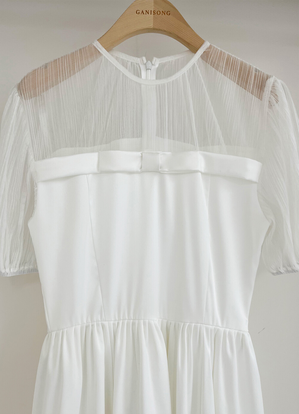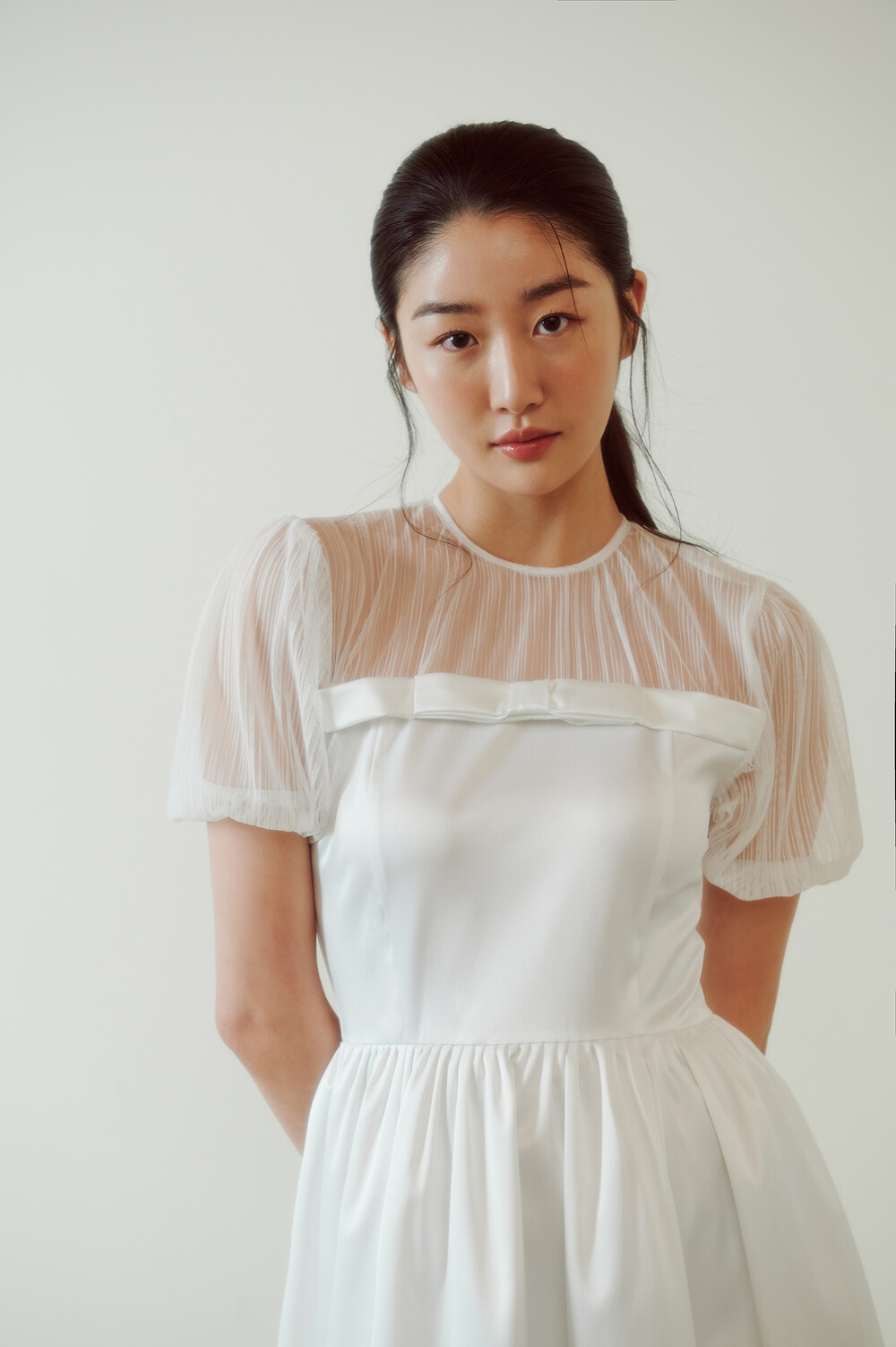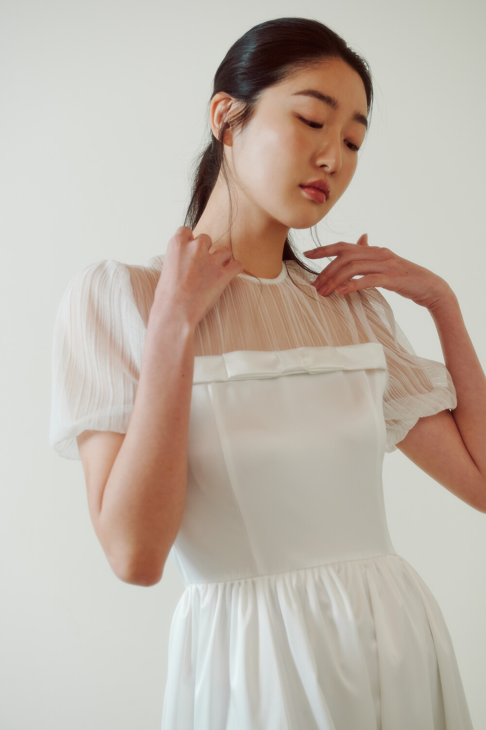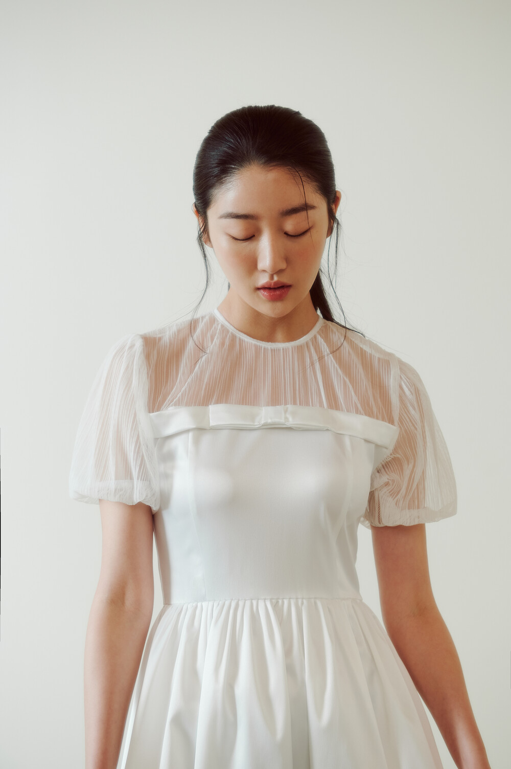 어깨 라인에 조밀하게 잡힌 망사 원단을 배색하였으며,