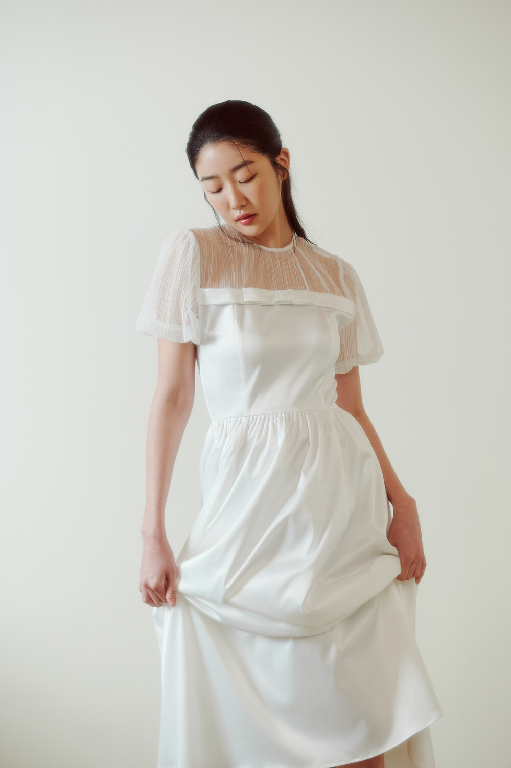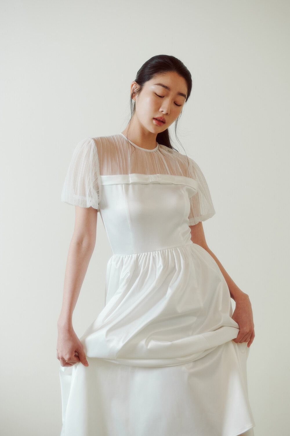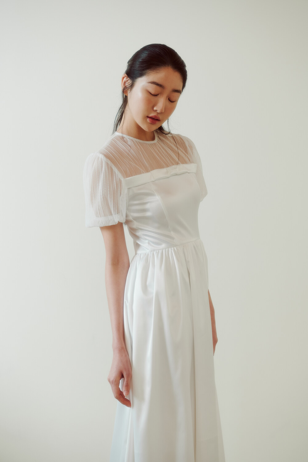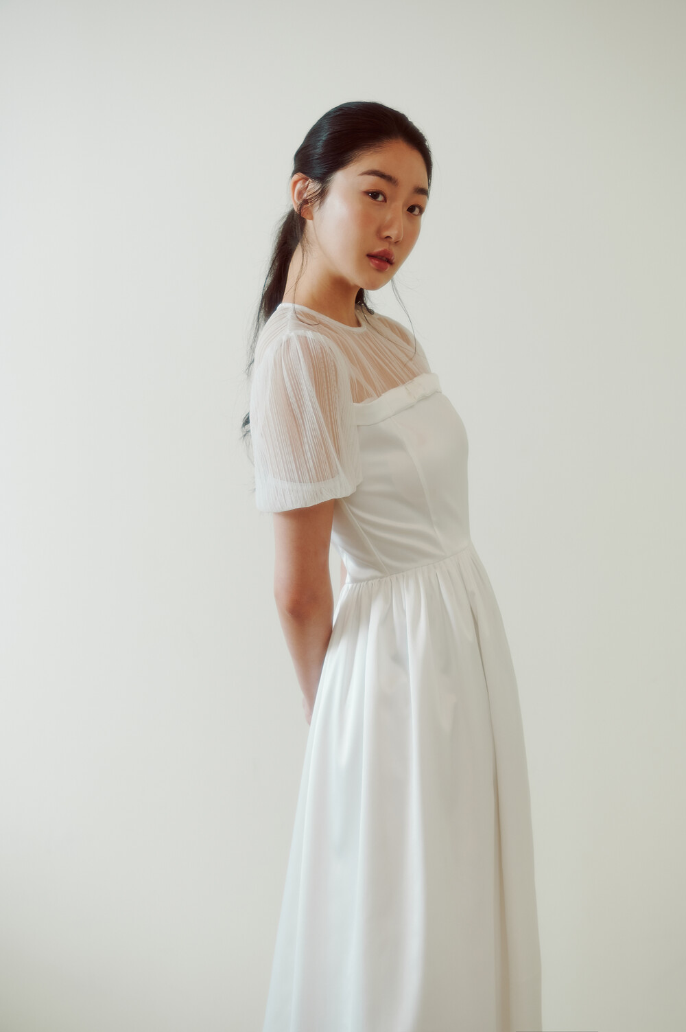 어깨 라인에 조밀하게 잡힌 망사 원단을 배색하였으며,