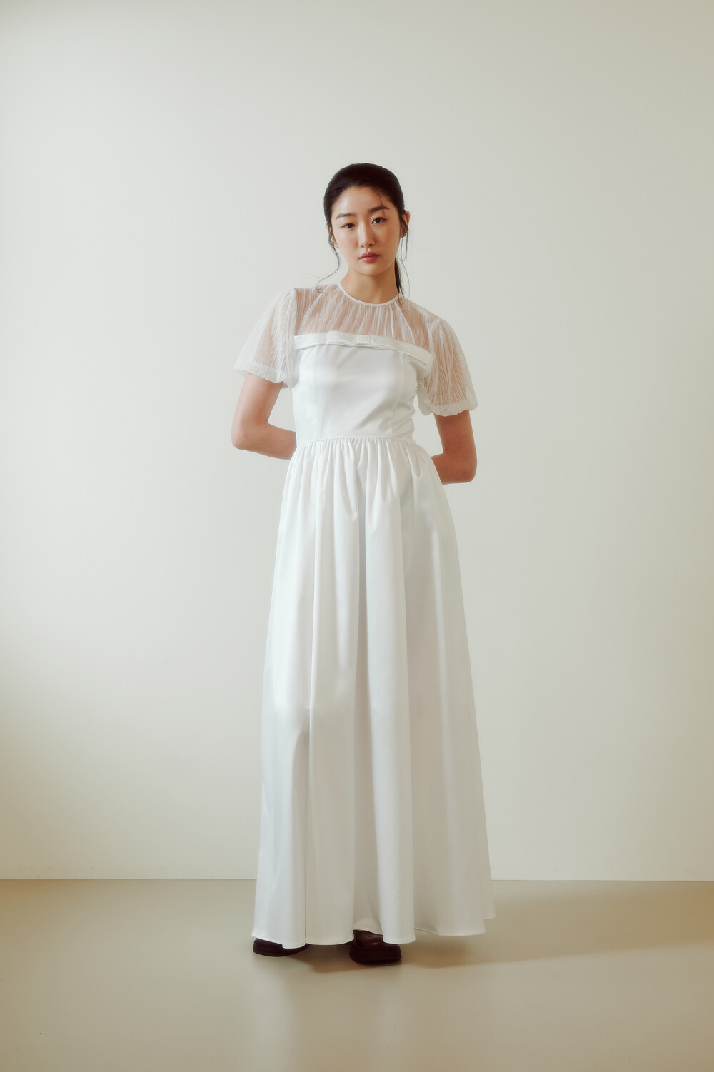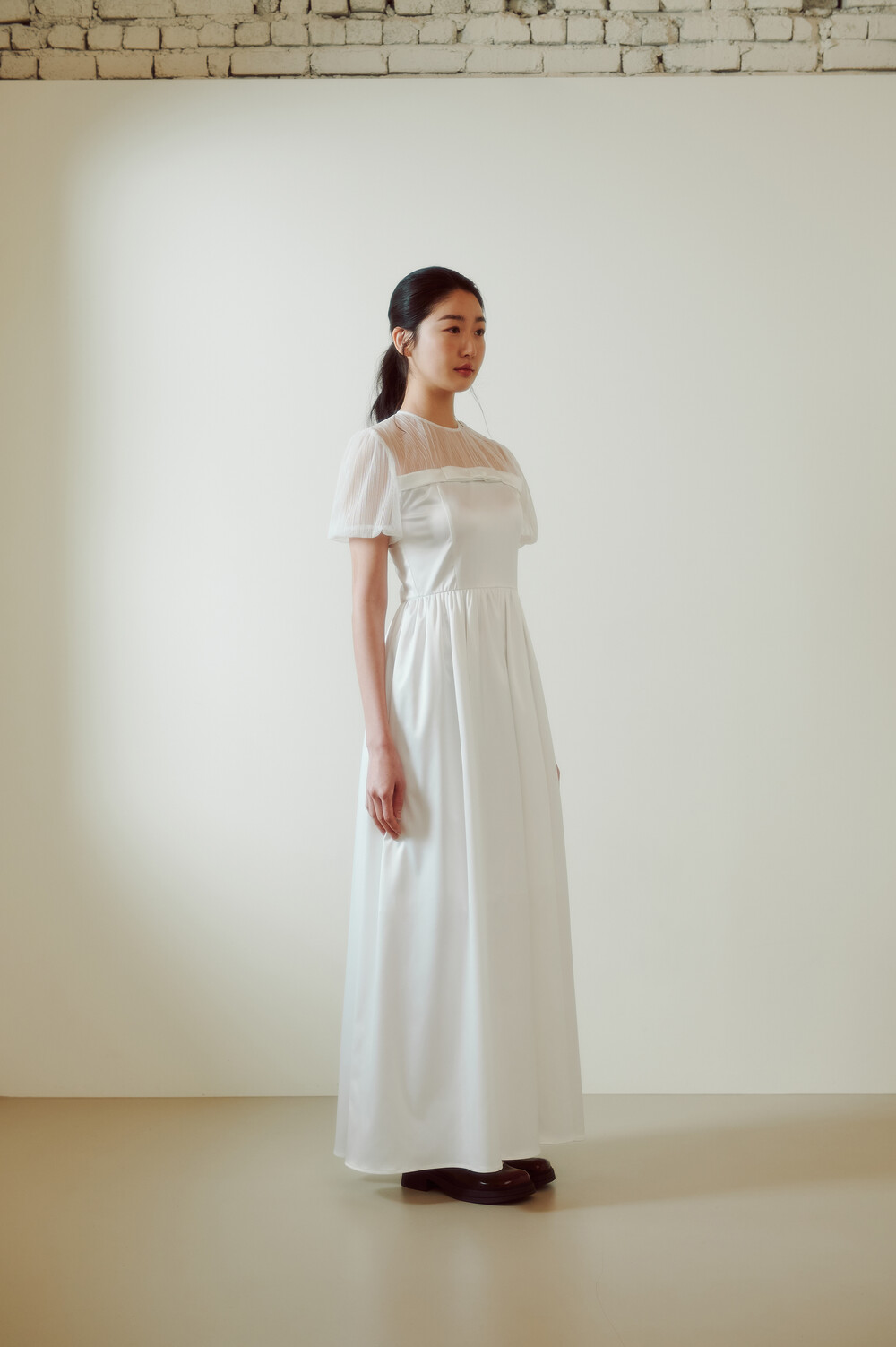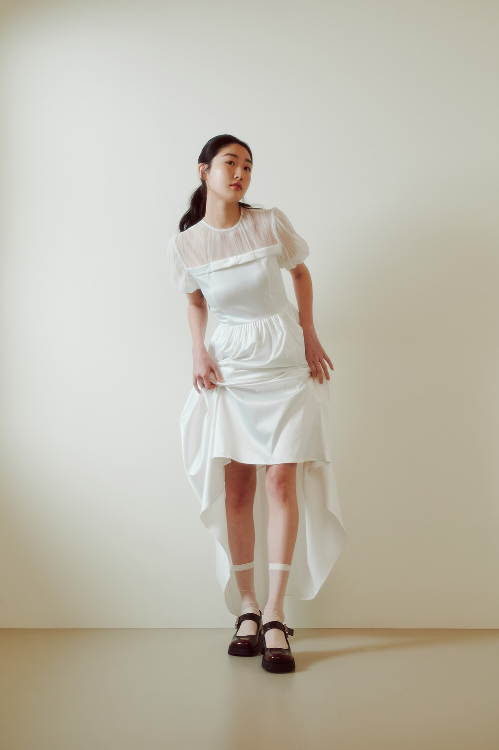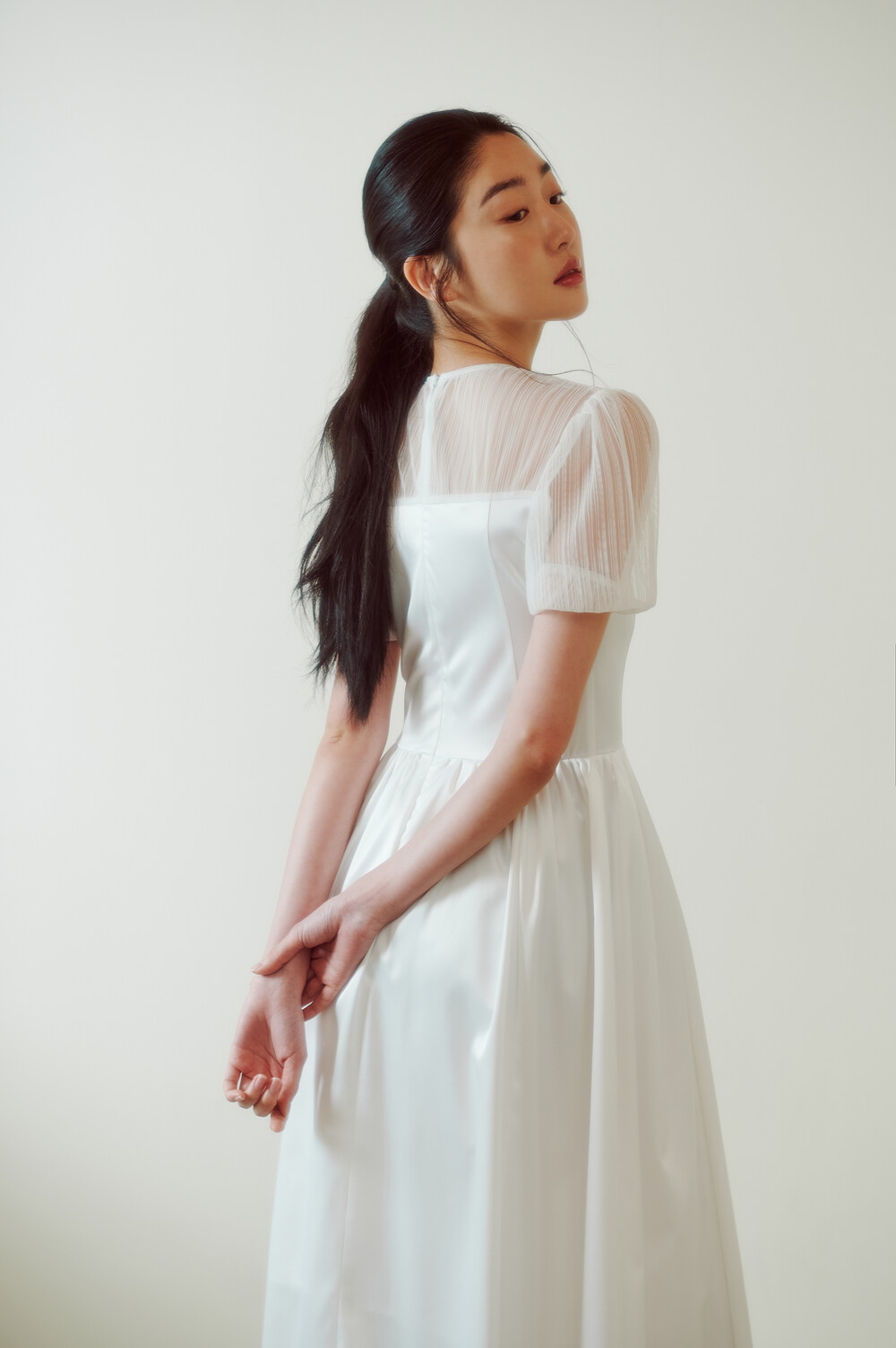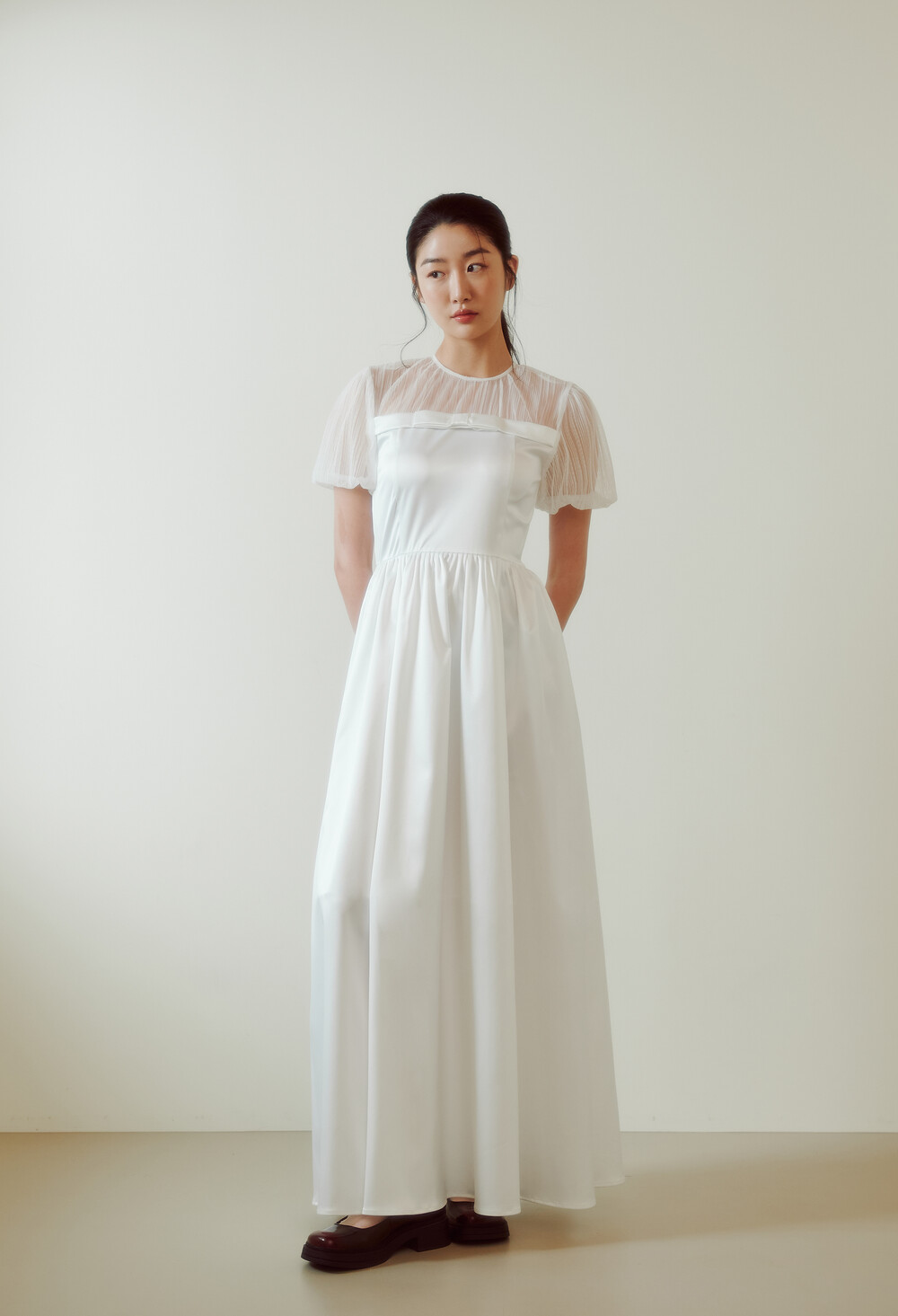 어깨 라인에 조밀하게 잡힌 망사 원단을 배색하였으며,