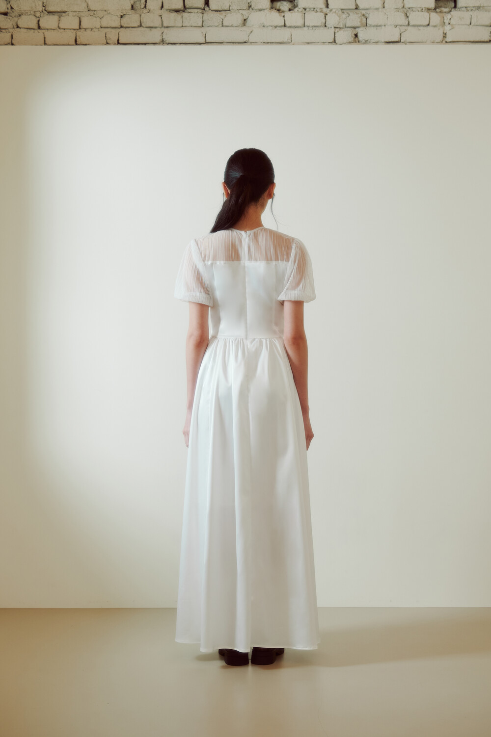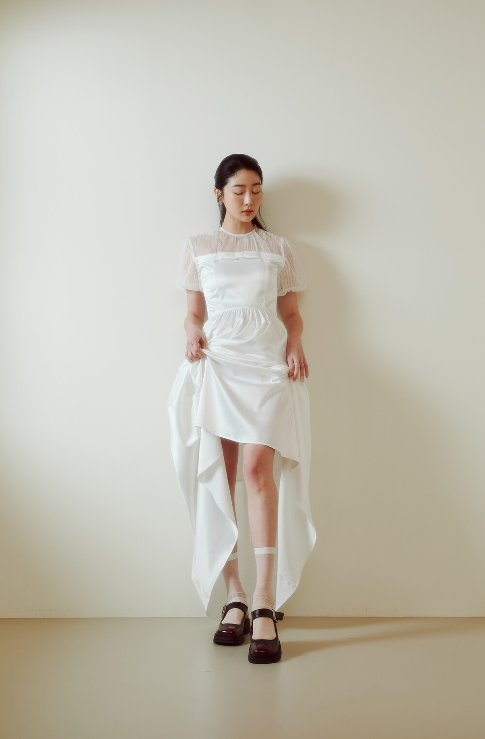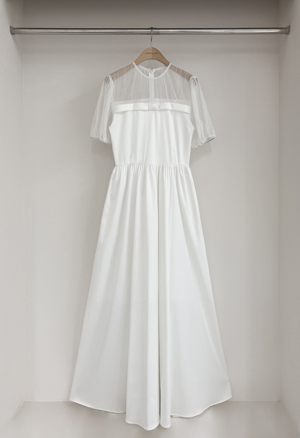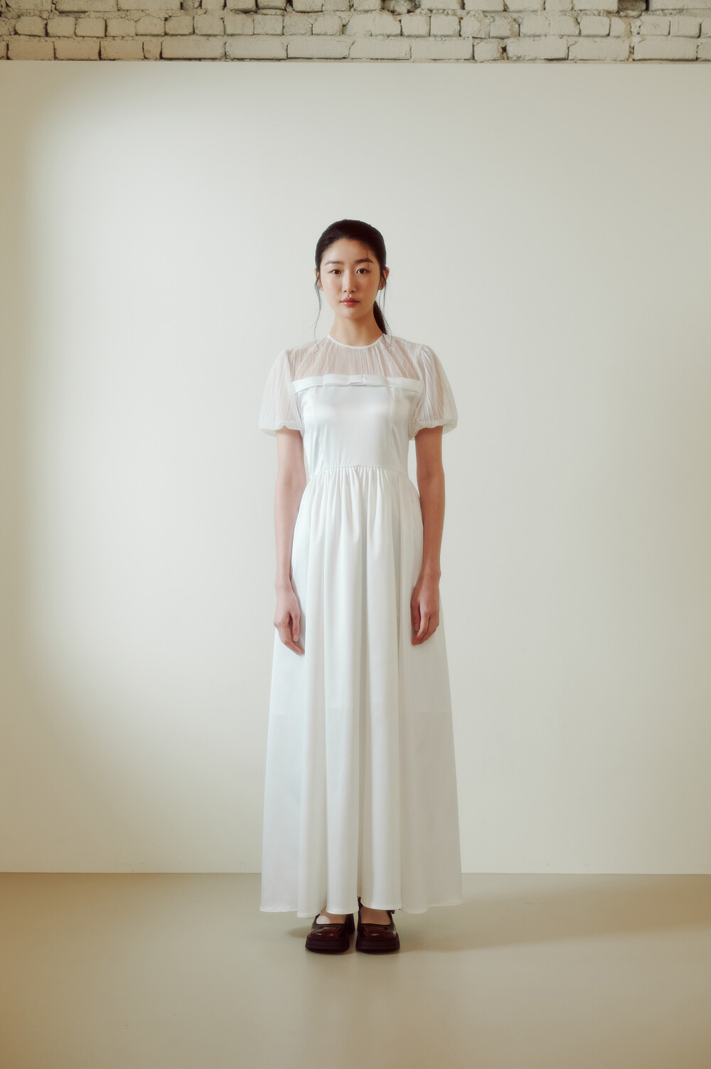 어깨 라인에 조밀하게 잡힌 망사 원단을 배색하였으며,