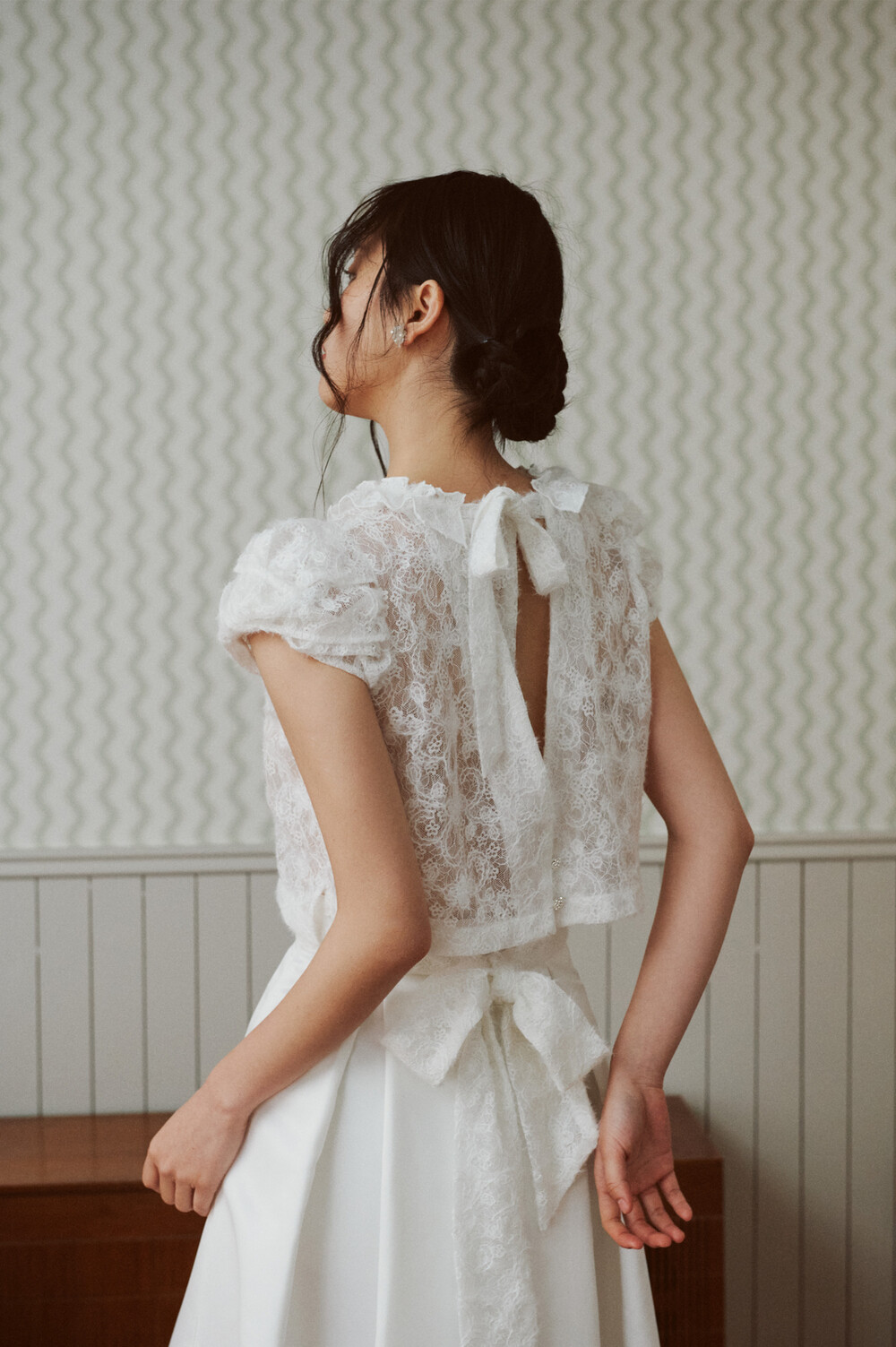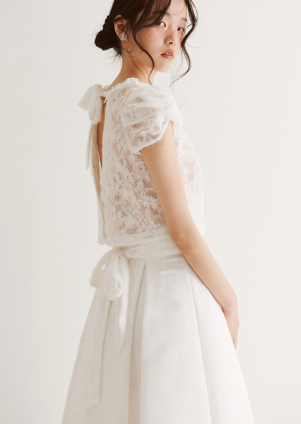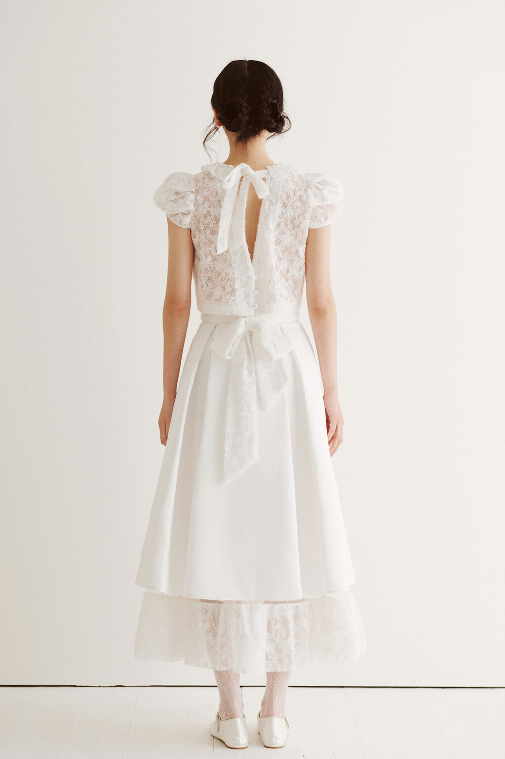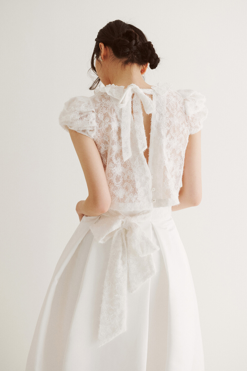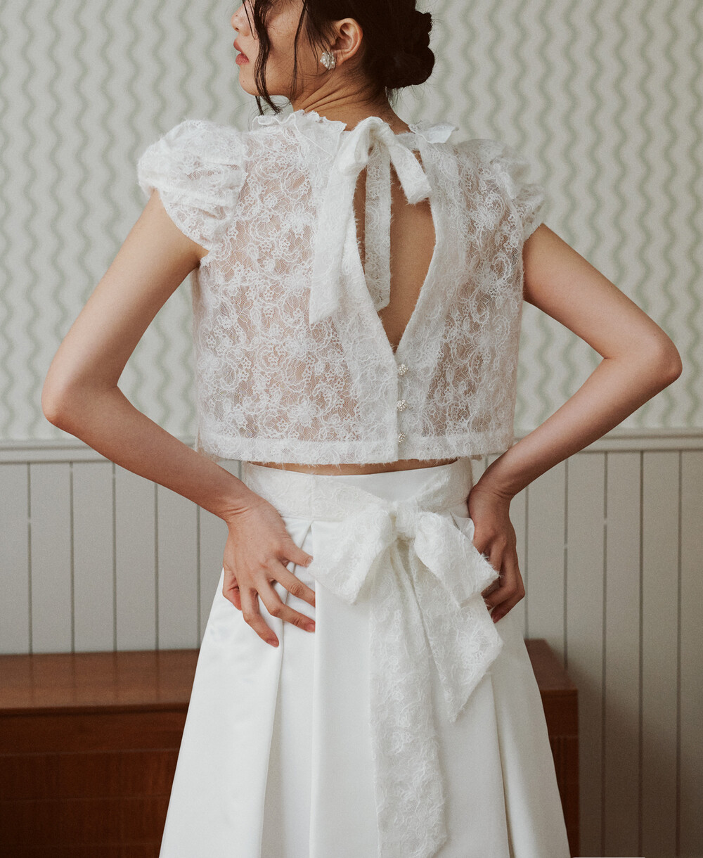 여러 줄의 끈이 교차되어 완성되는 봉긋한 퍼프 소매와 등 뒤로 깊게 파진 삼각라인에 반짝이는 보석 단추로 마무리된 사랑스러운 블라우스, 허리 뒤로 묶는 볼드한 레이스 리본 밴드가 특징인 풍성한 A라인의 스커트로 구성되어 있습니다.
