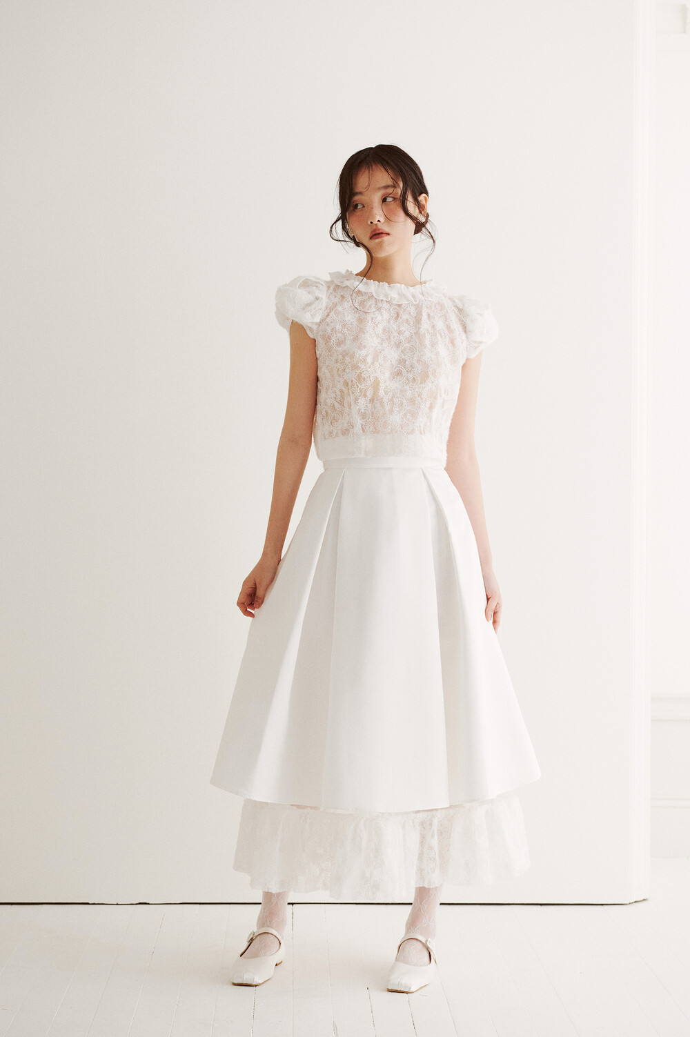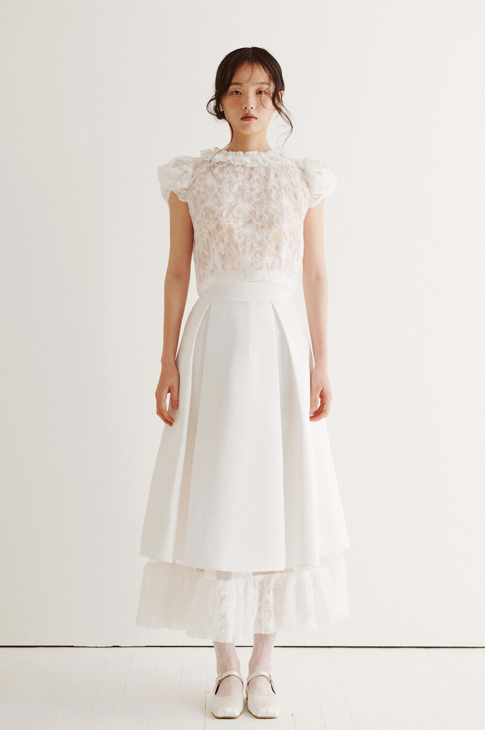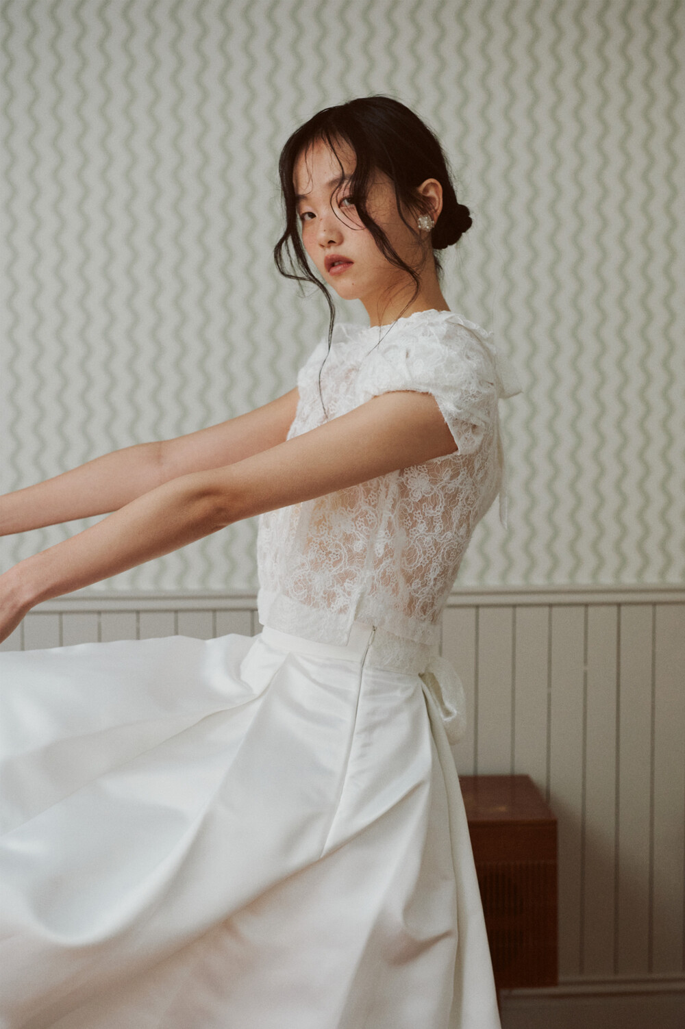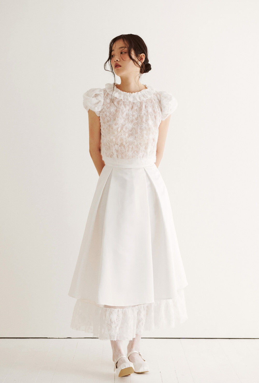 여러 줄의 끈이 교차되어 완성되는 봉긋한 퍼프 소매와 등 뒤로 깊게 파진 삼각라인에 반짝이는 보석 단추로 마무리된 사랑스러운 블라우스, 허리 뒤로 묶는 볼드한 레이스 리본 밴드가 특징인 풍성한 A라인의 스커트로 구성되어 있습니다.