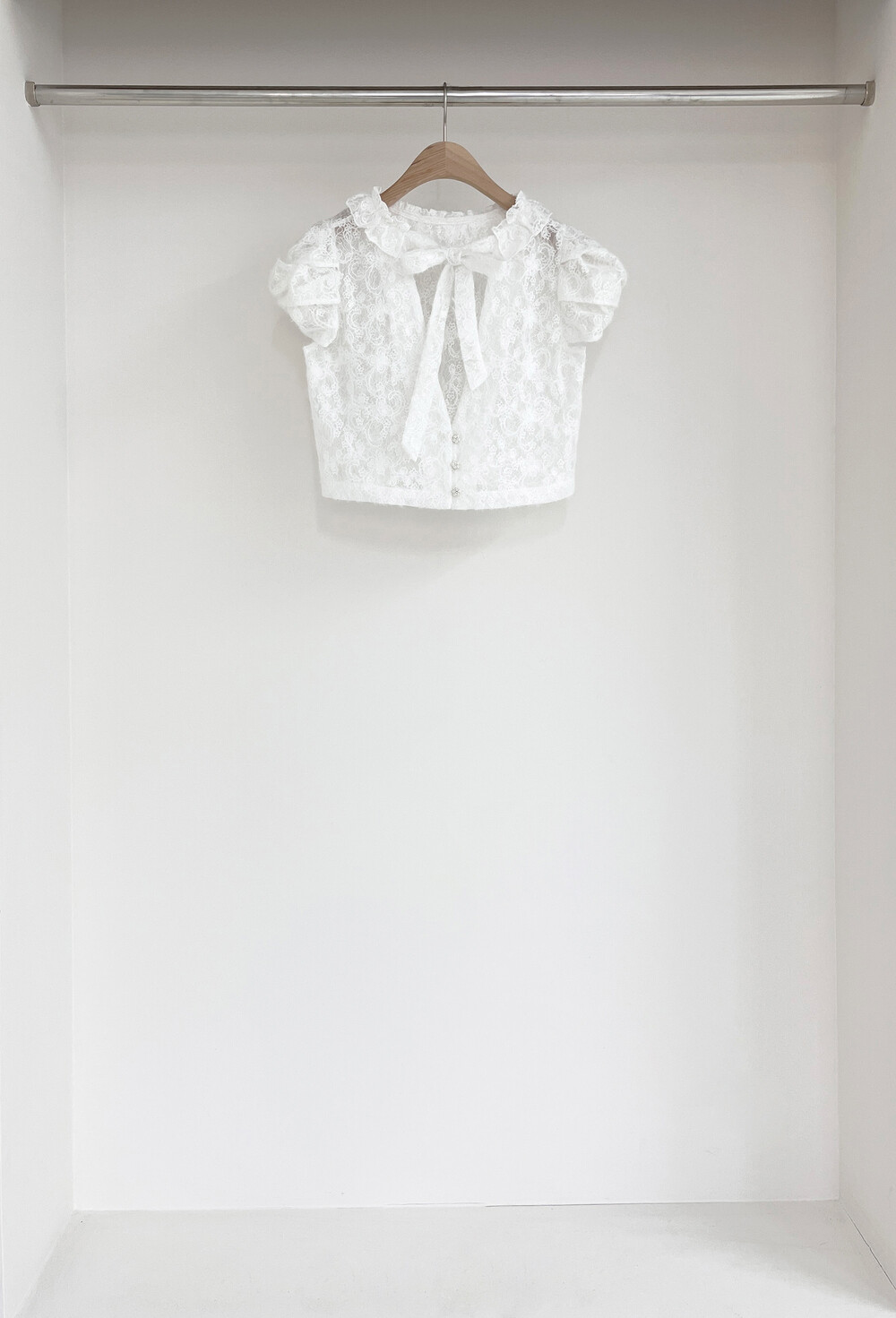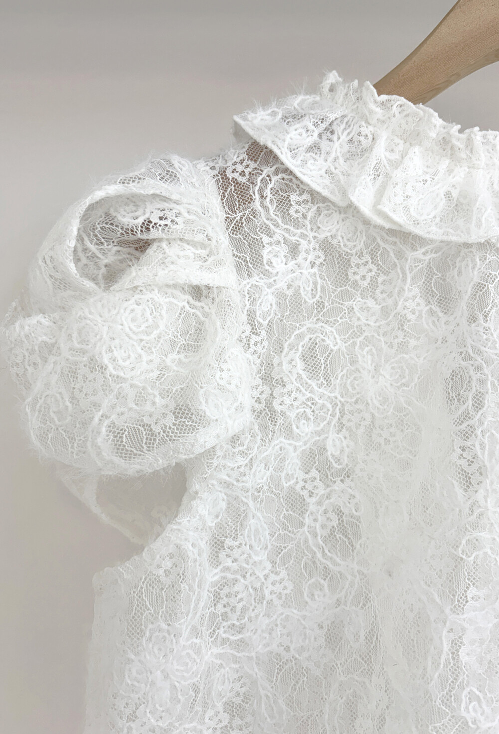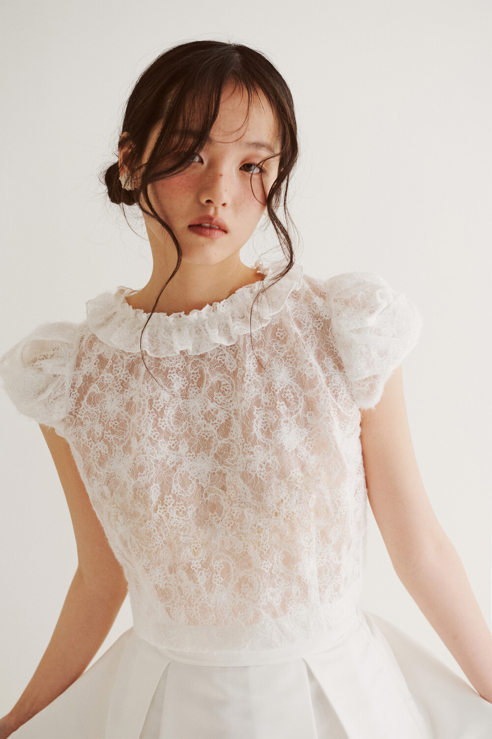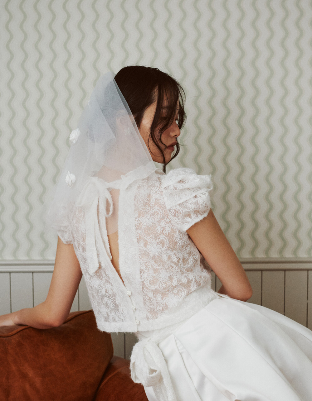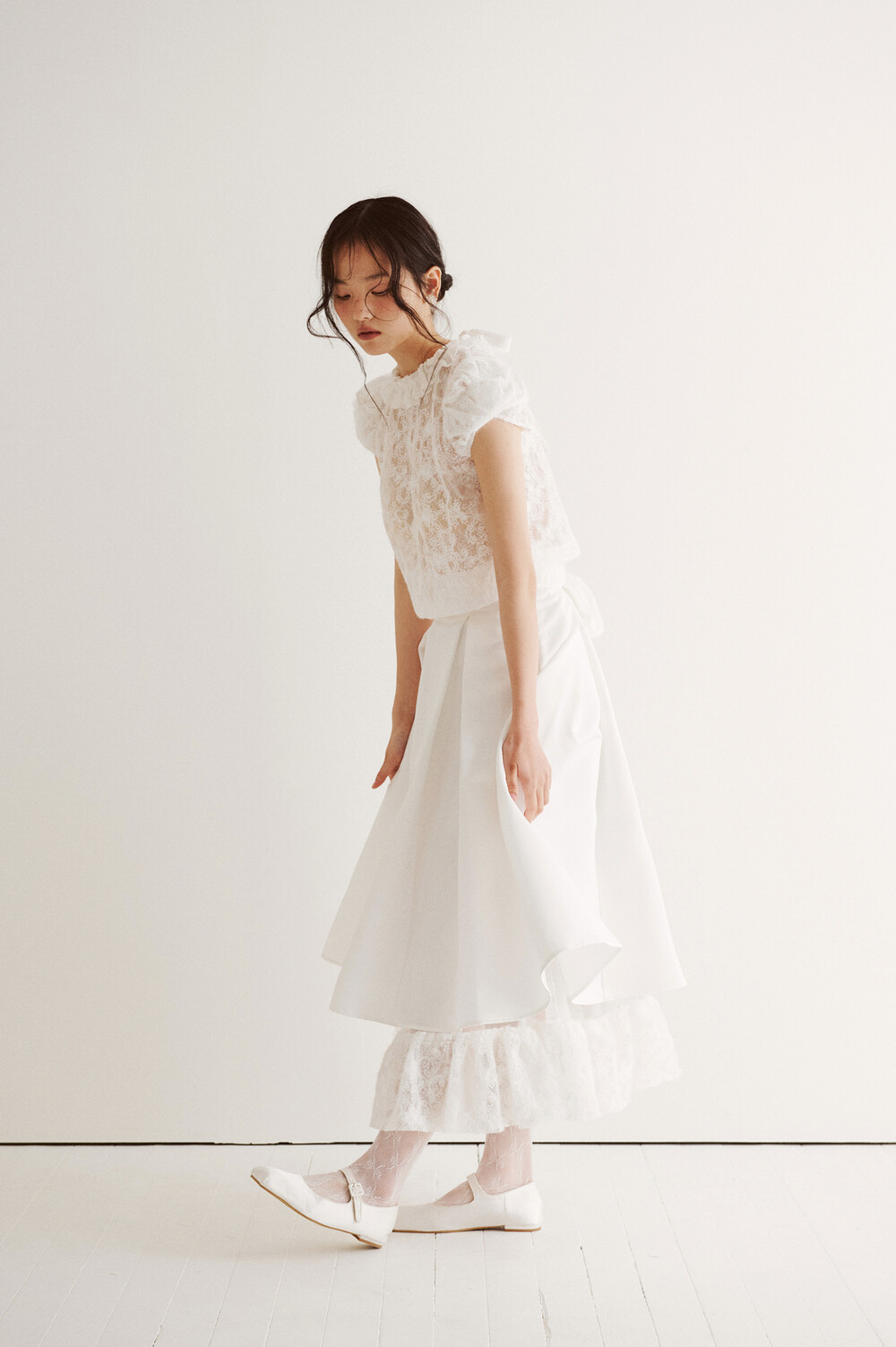 여러 줄의 끈이 교차되어 완성되는 봉긋한 퍼프 소매와 등 뒤로 깊게 파진 삼각라인에 반짝이는 보석 단추로 마무리된 사랑스러운 블라우스, 허리 뒤로 묶는 볼드한 레이스 리본 밴드가 특징인 풍성한 A라인의 스커트로 구성되어 있습니다.