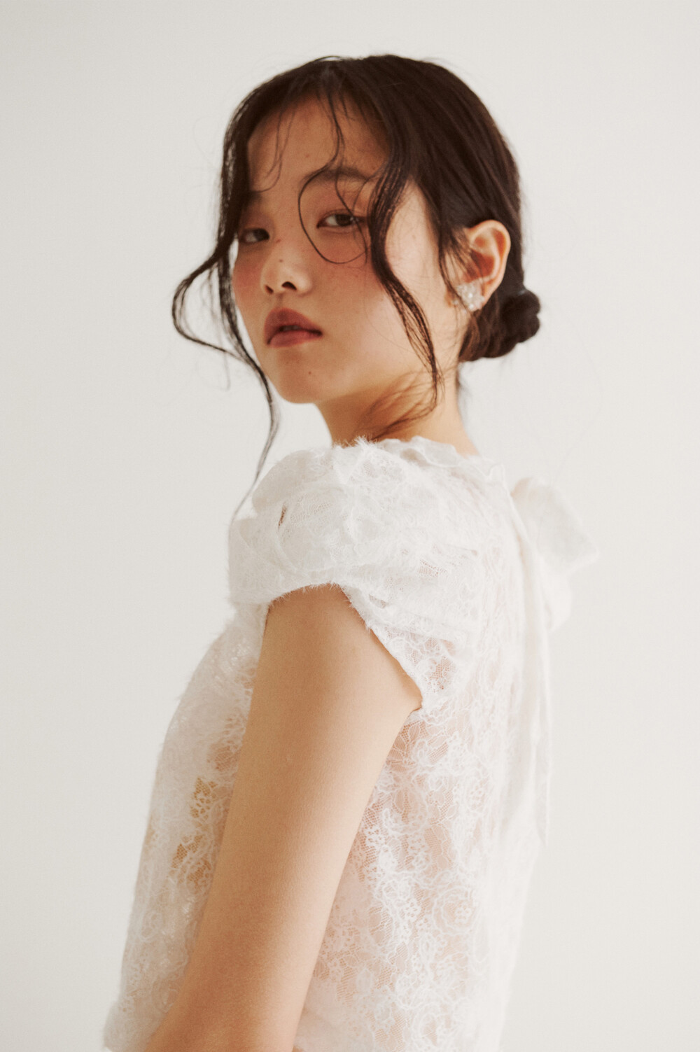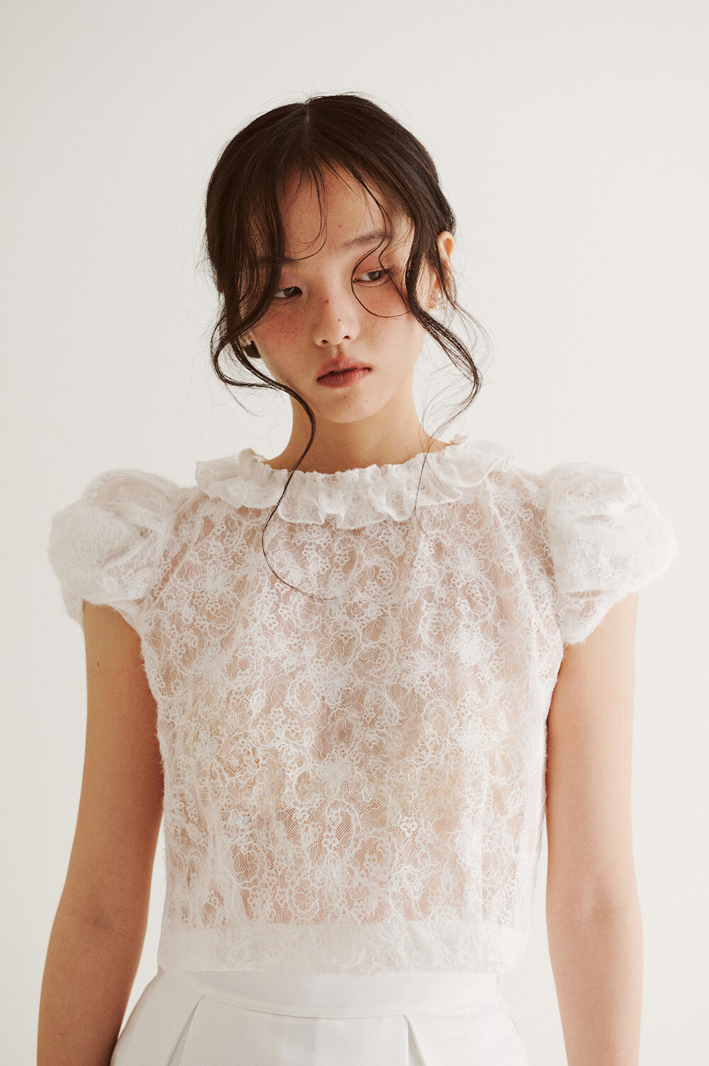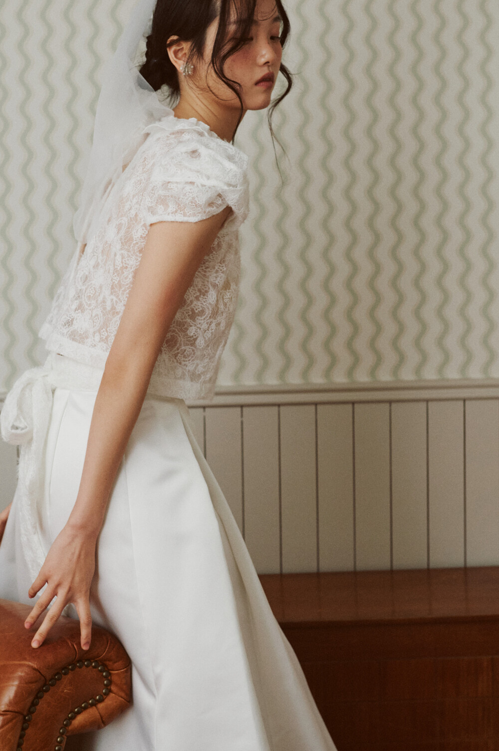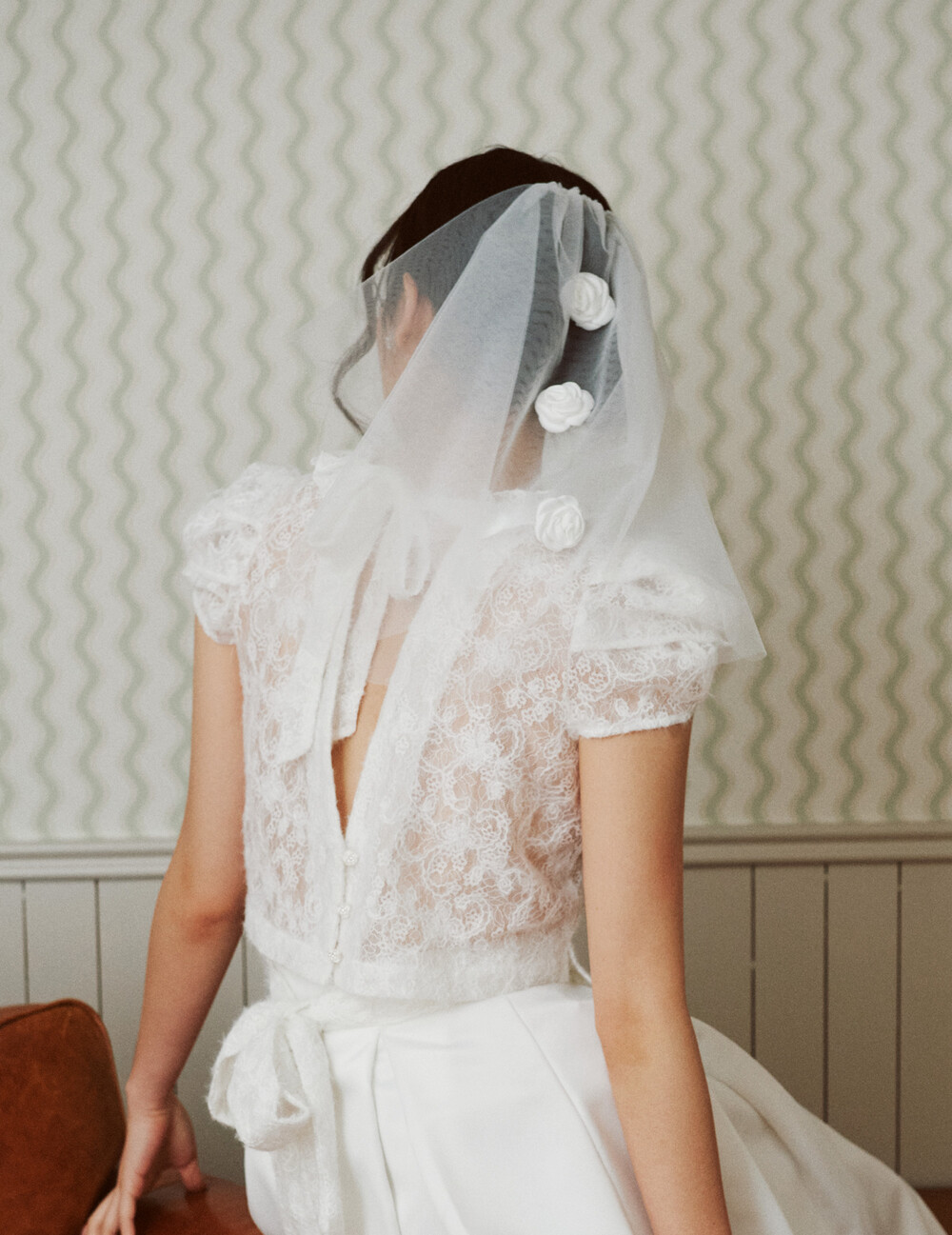 여러 줄의 끈이 교차되어 완성되는 봉긋한 퍼프 소매와 등 뒤로 깊게 파진 삼각라인에 반짝이는 보석 단추로 마무리된 사랑스러운 블라우스, 허리 뒤로 묶는 볼드한 레이스 리본 밴드가 특징인 풍성한 A라인의 스커트로 구성되어 있습니다.
