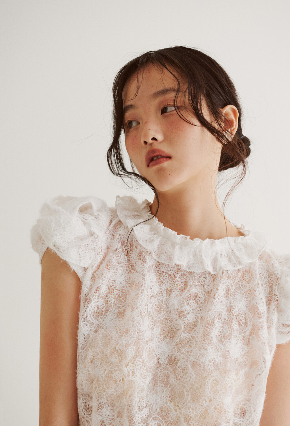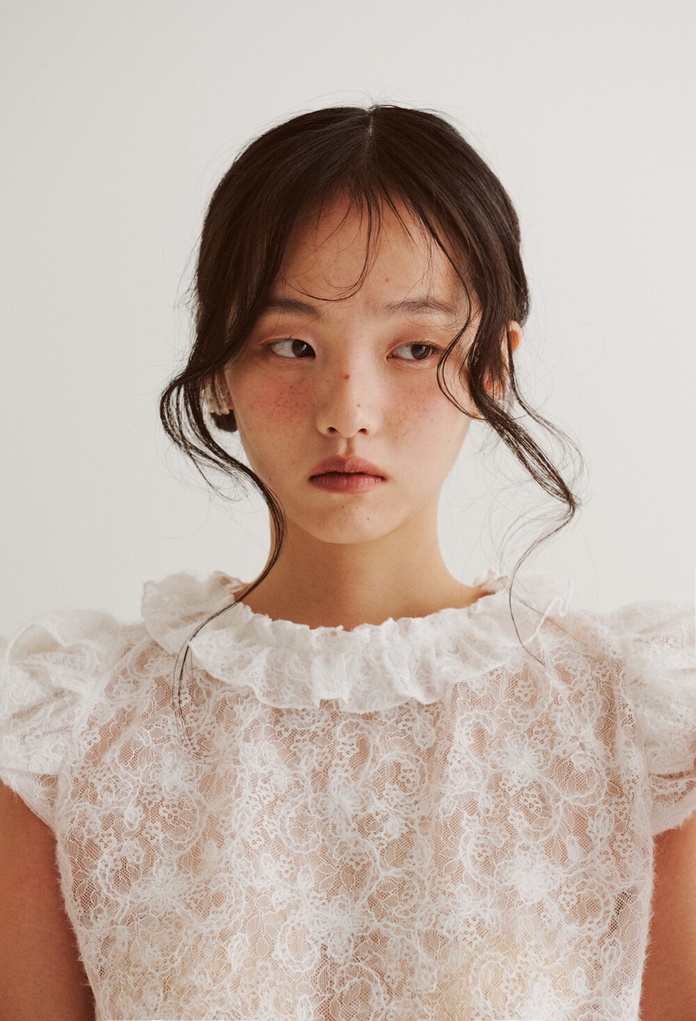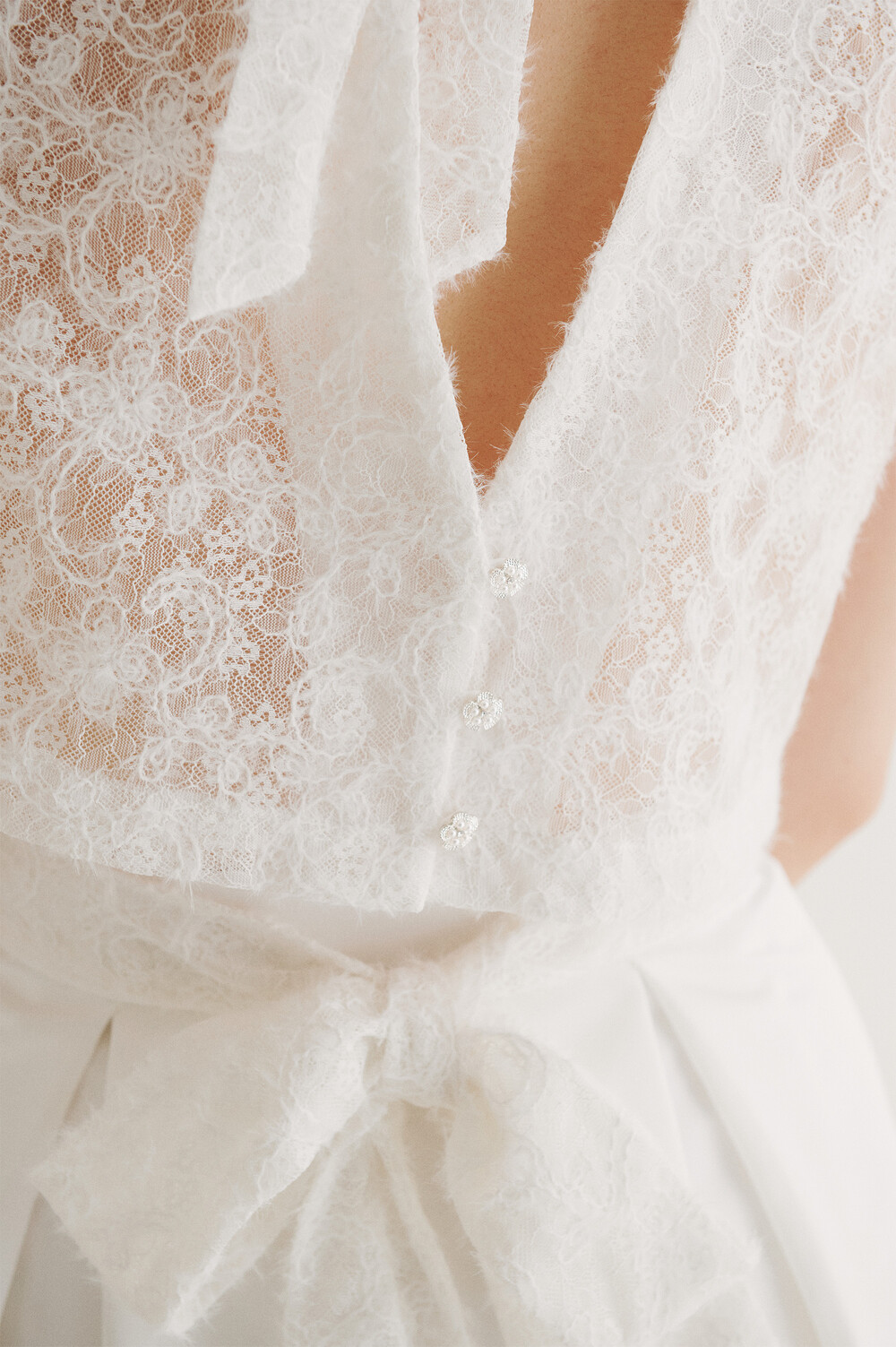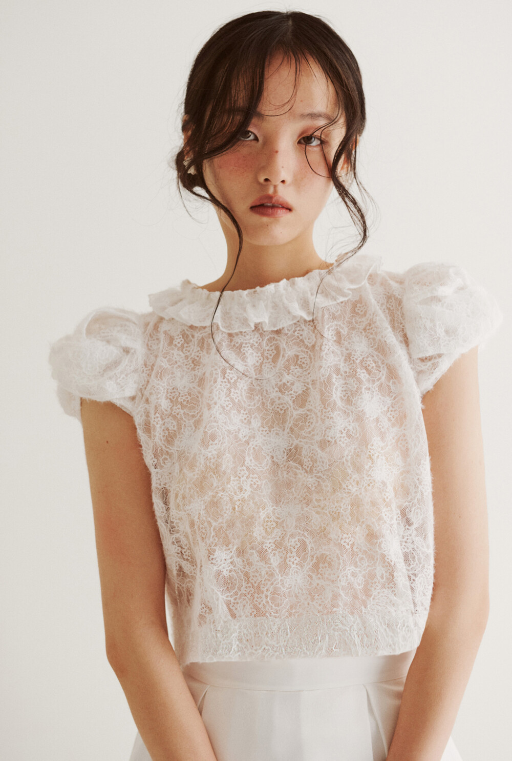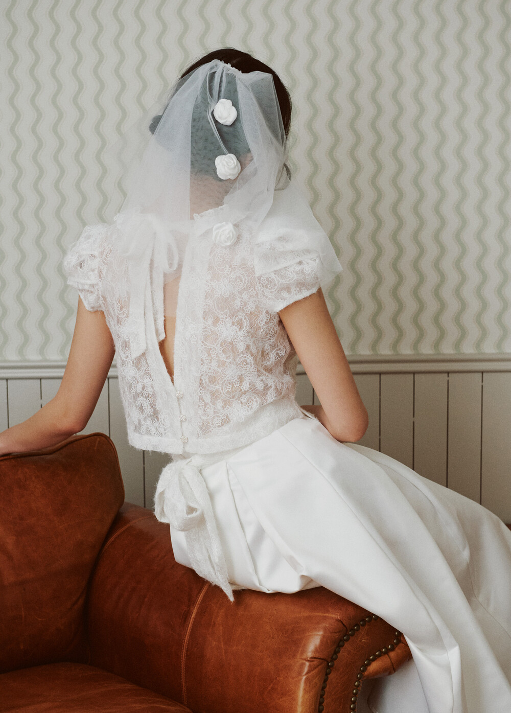 여러 줄의 끈이 교차되어 완성되는 봉긋한 퍼프 소매와 등 뒤로 깊게 파진 삼각라인에 반짝이는 보석 단추로 마무리된 사랑스러운 블라우스, 허리 뒤로 묶는 볼드한 레이스 리본 밴드가 특징인 풍성한 A라인의 스커트로 구성되어 있습니다.