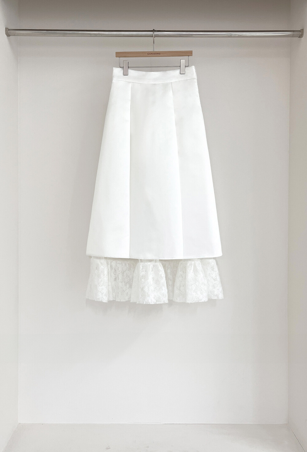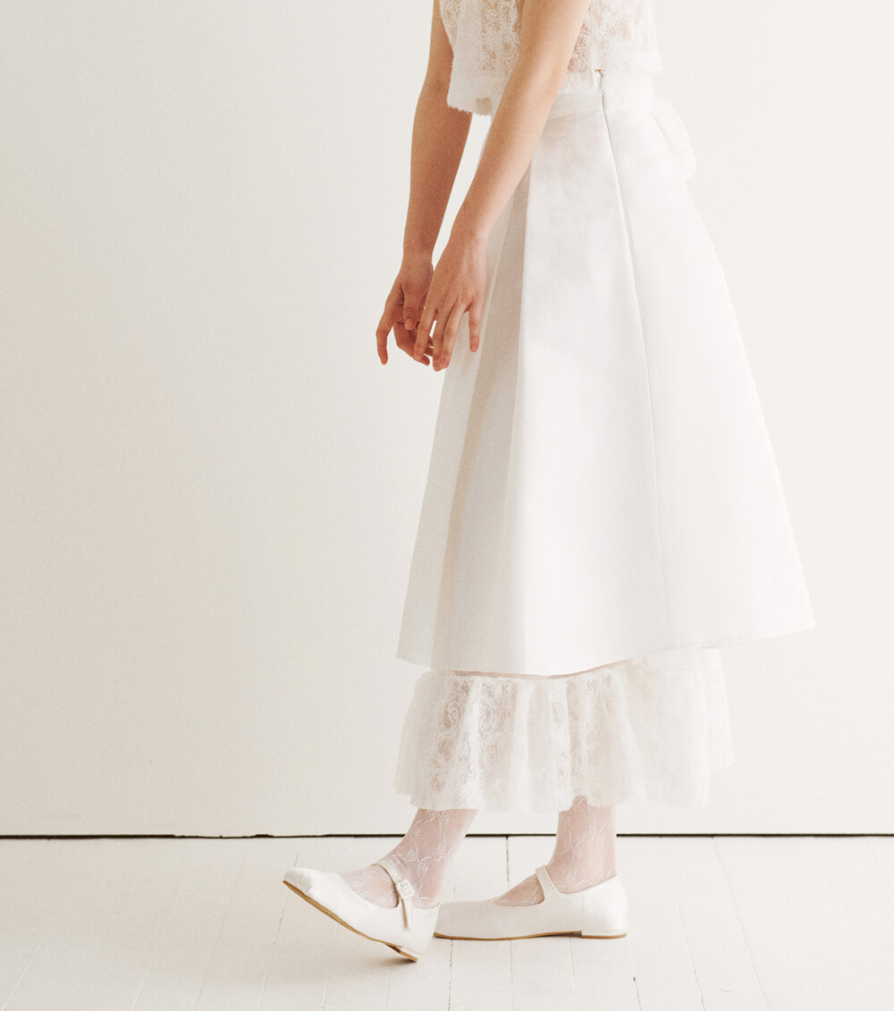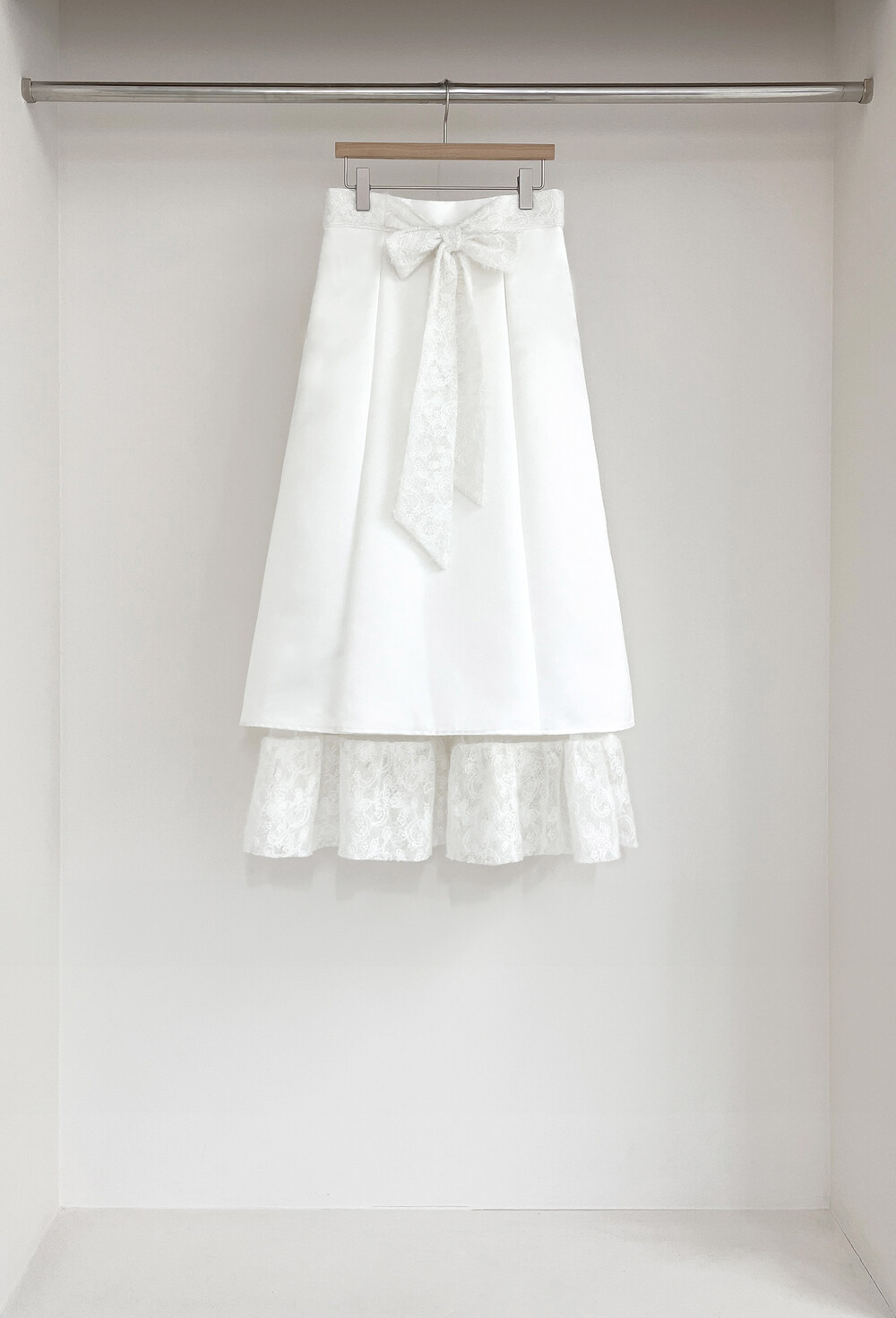 스커트 안감에 사용된 레이스 망이 움직일 때 마다 치마단 니트 레이스 배색 위로 살짝 노출되는 디자인이 로맨틱한 무드를 더합니다.