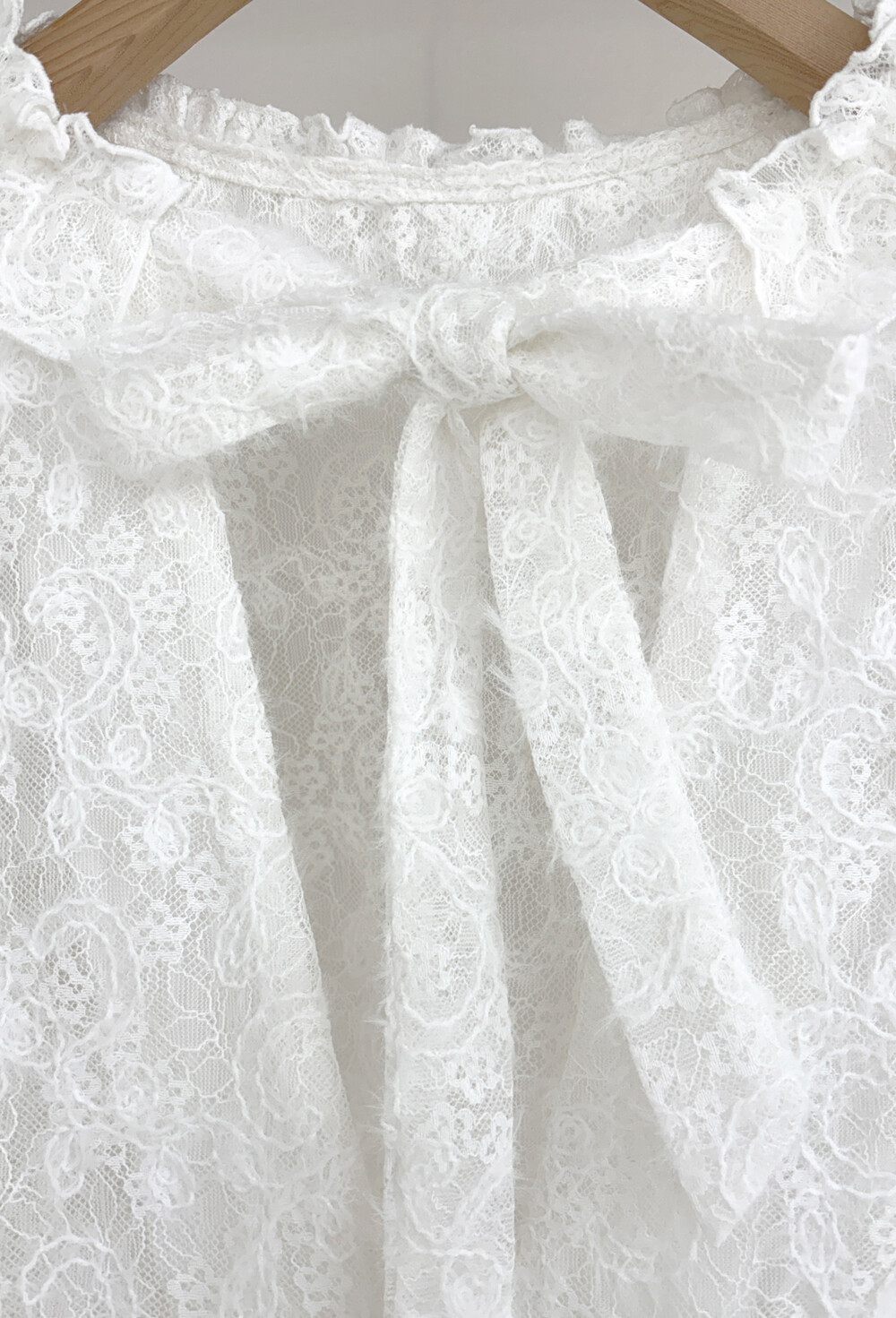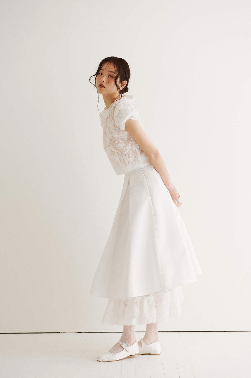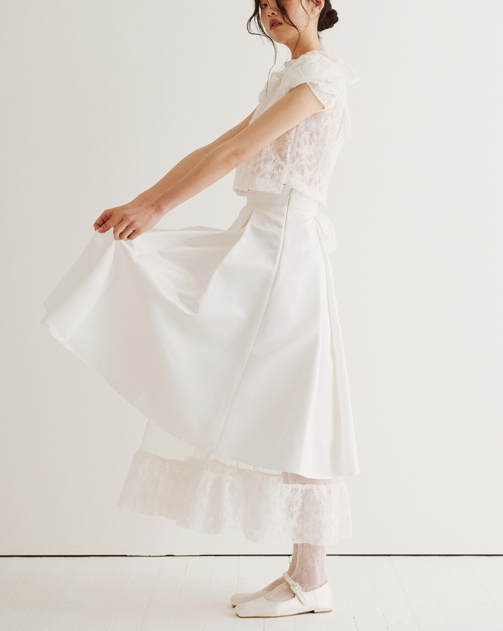 스커트 안감에 사용된 레이스 망이 움직일 때 마다 치마단 니트 레이스 배색 위로 살짝 노출되는 디자인이 로맨틱한 무드를 더합니다.