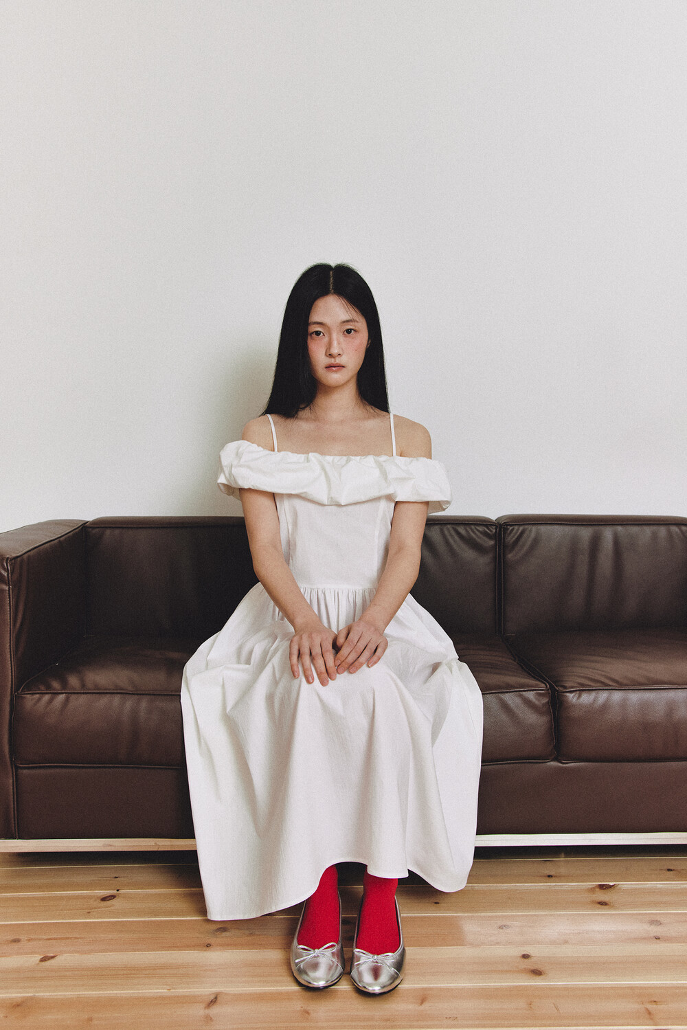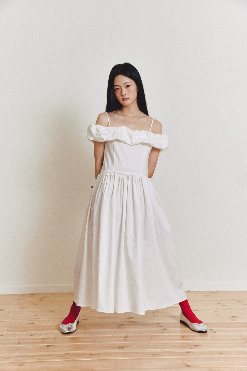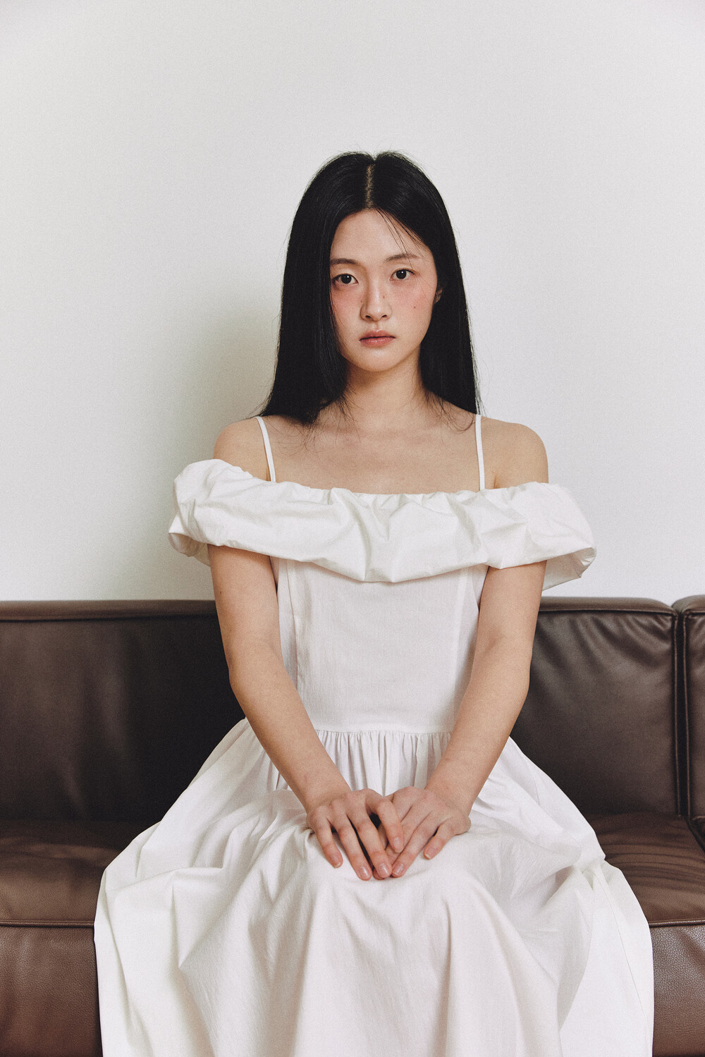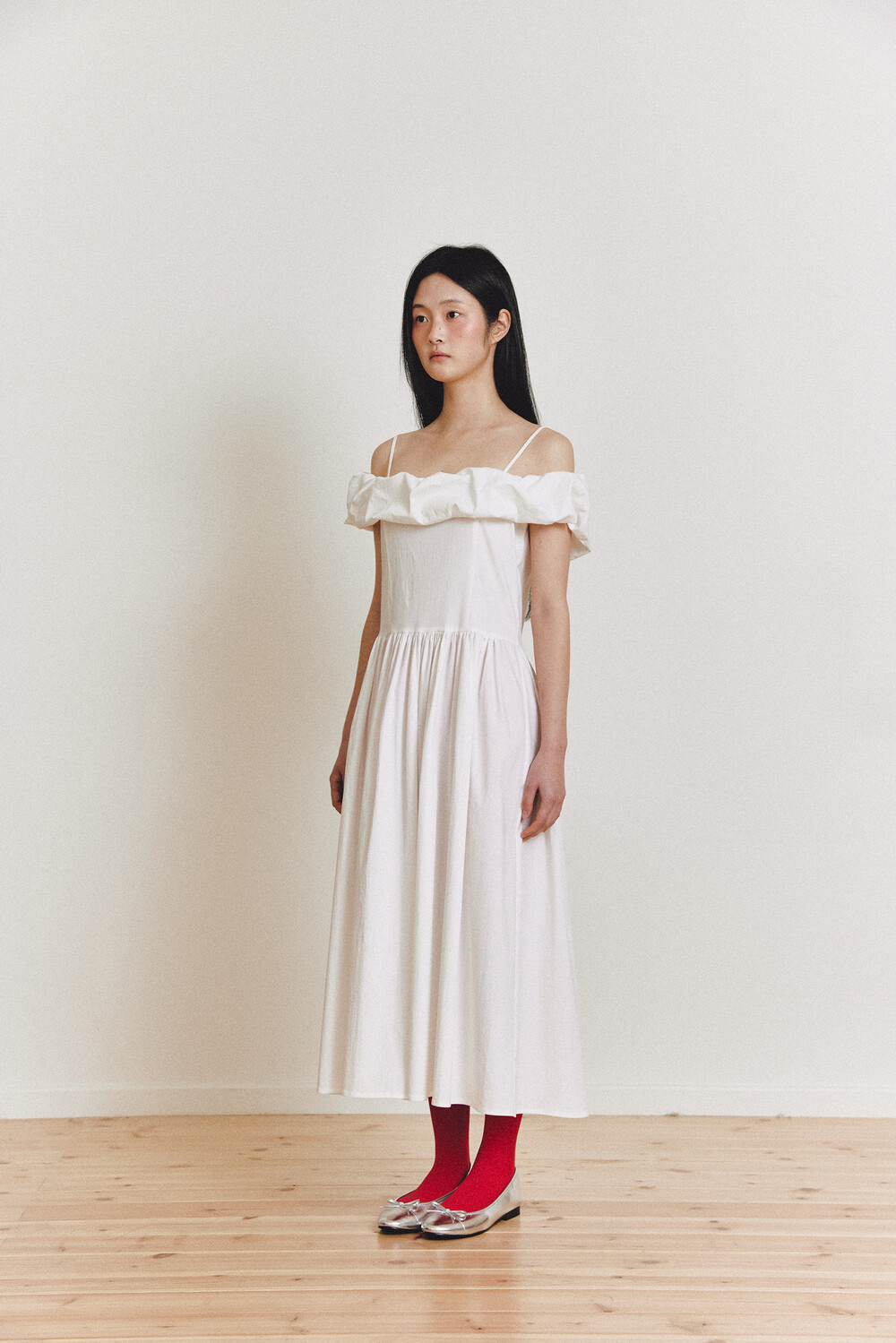 네크라인을 따라 풍성하게 달린 퍼프가 어깨를 감싸는 디테일이 매력적인 아이템입니다.