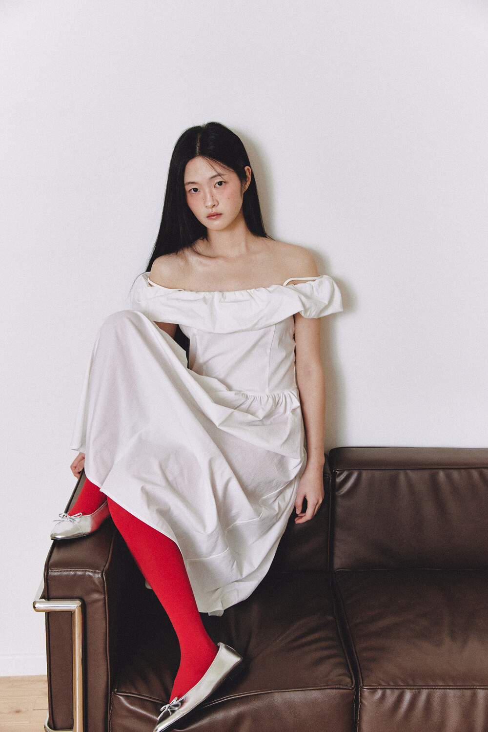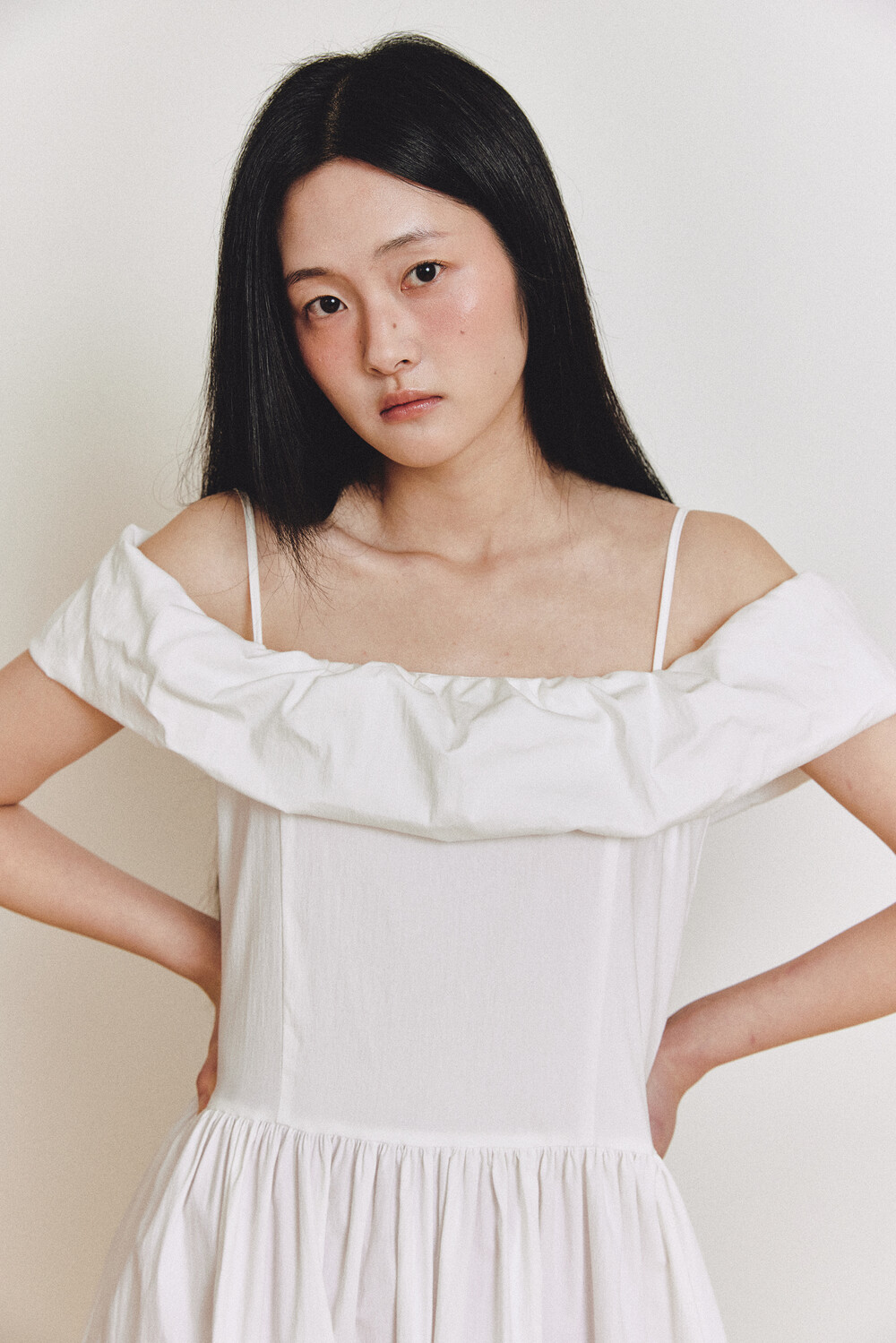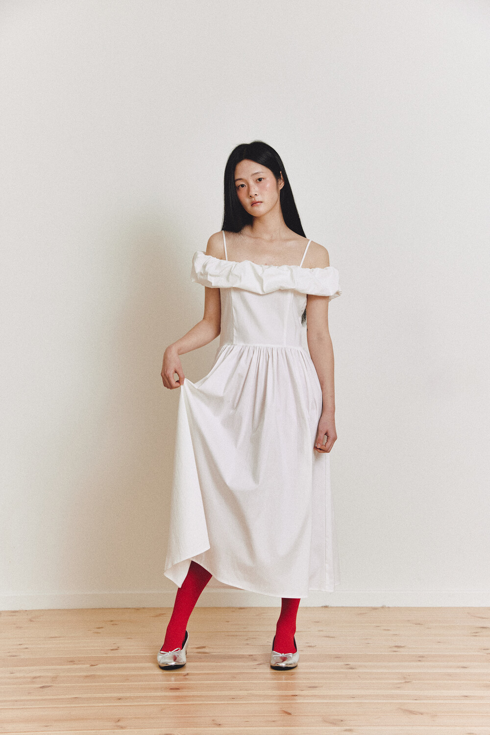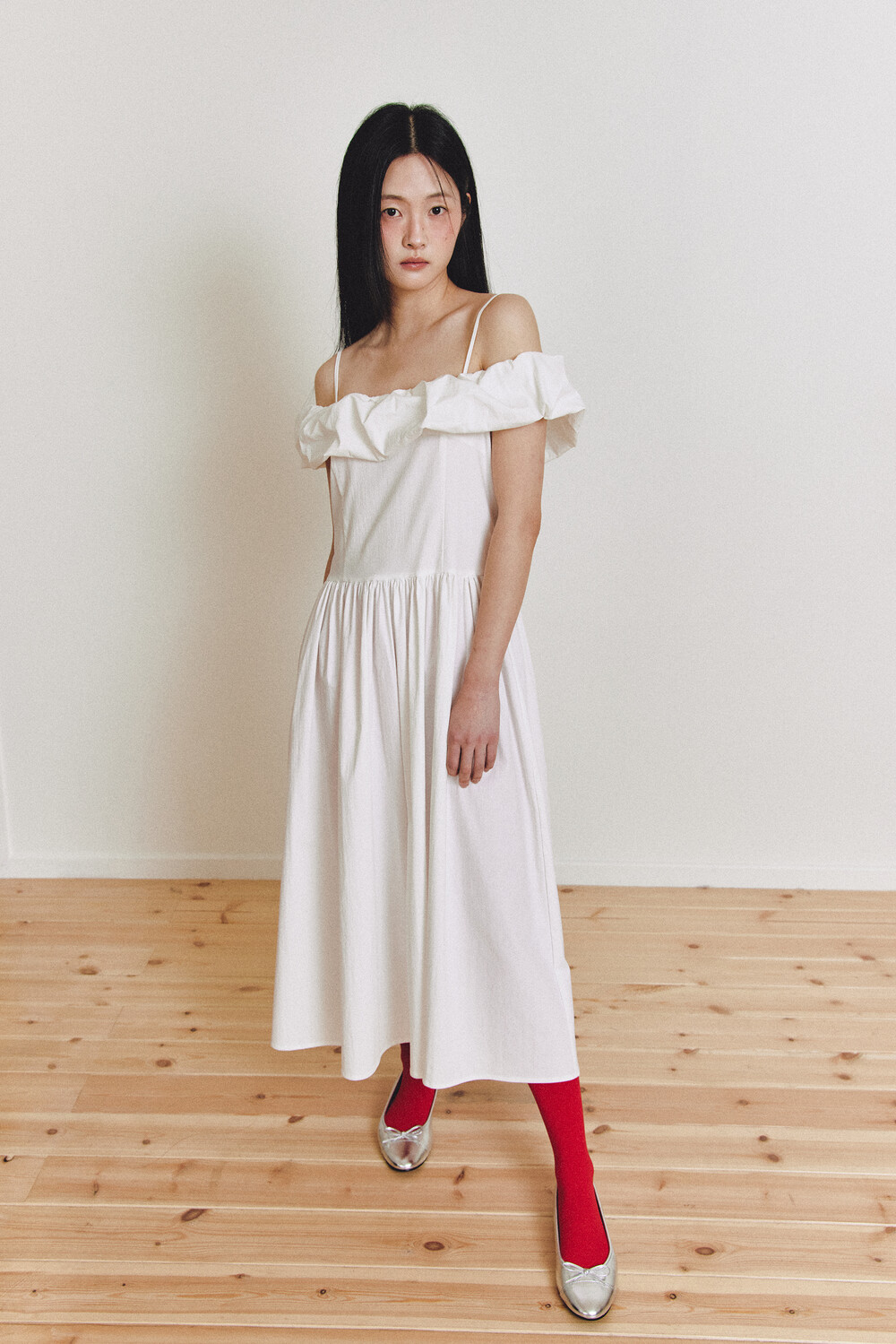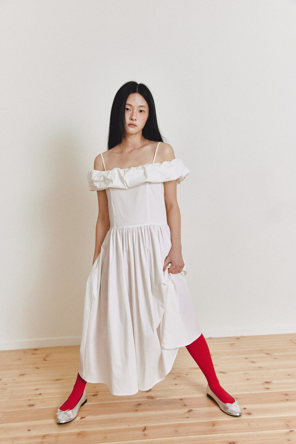 네크라인을 따라 풍성하게 달린 퍼프가 어깨를 감싸는 디테일이 매력적인 아이템입니다.