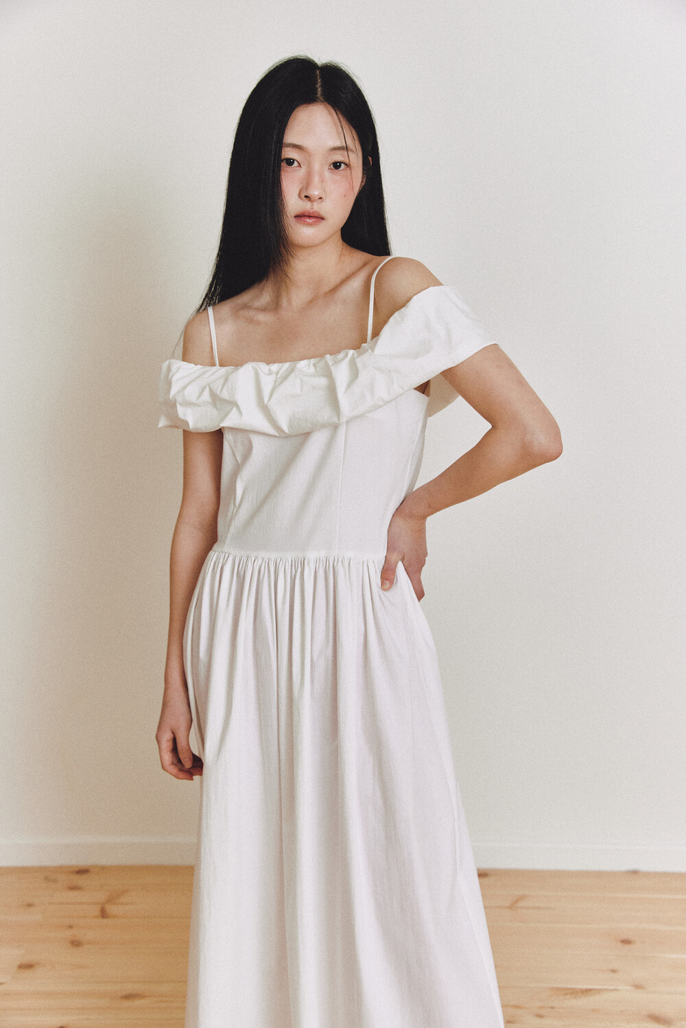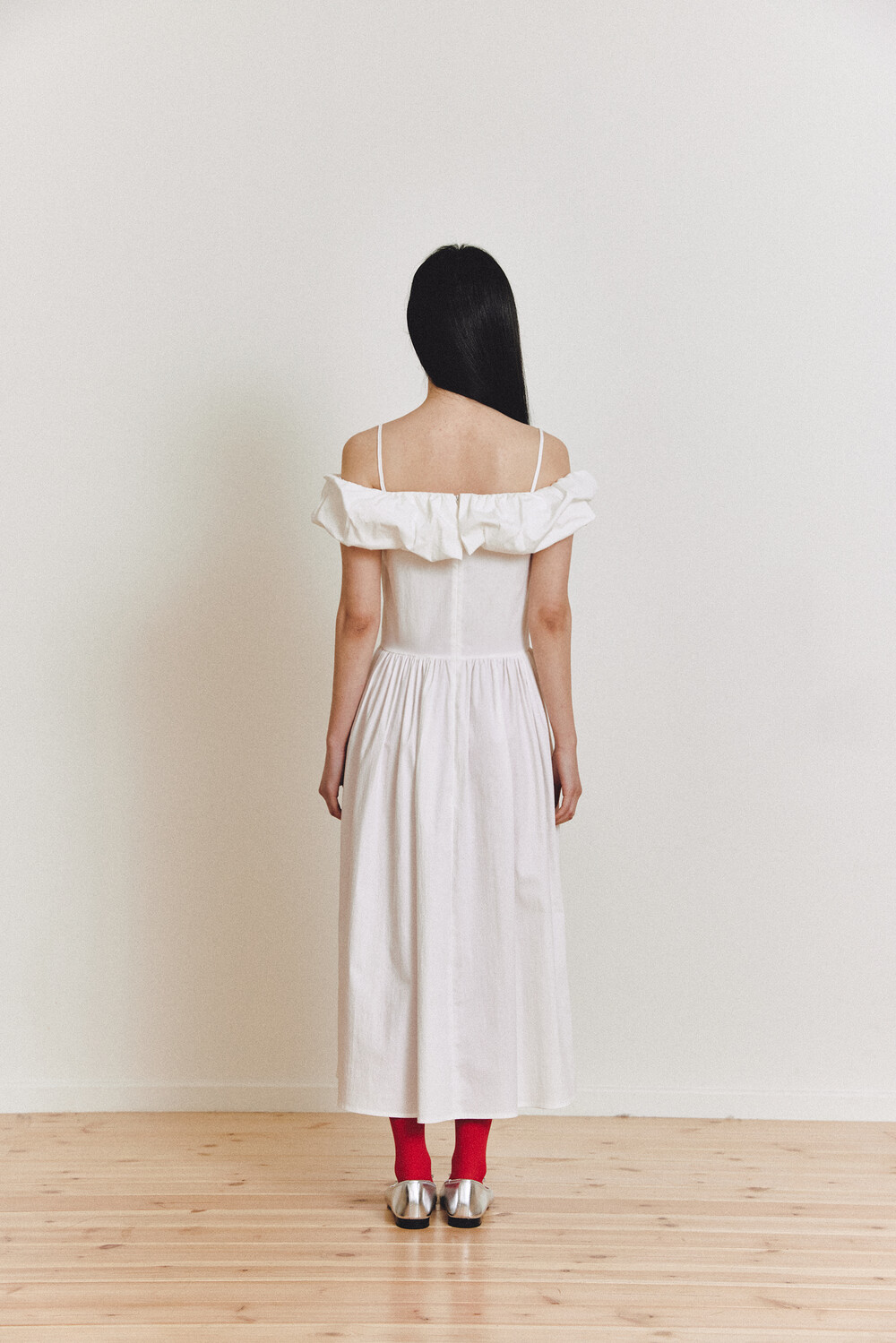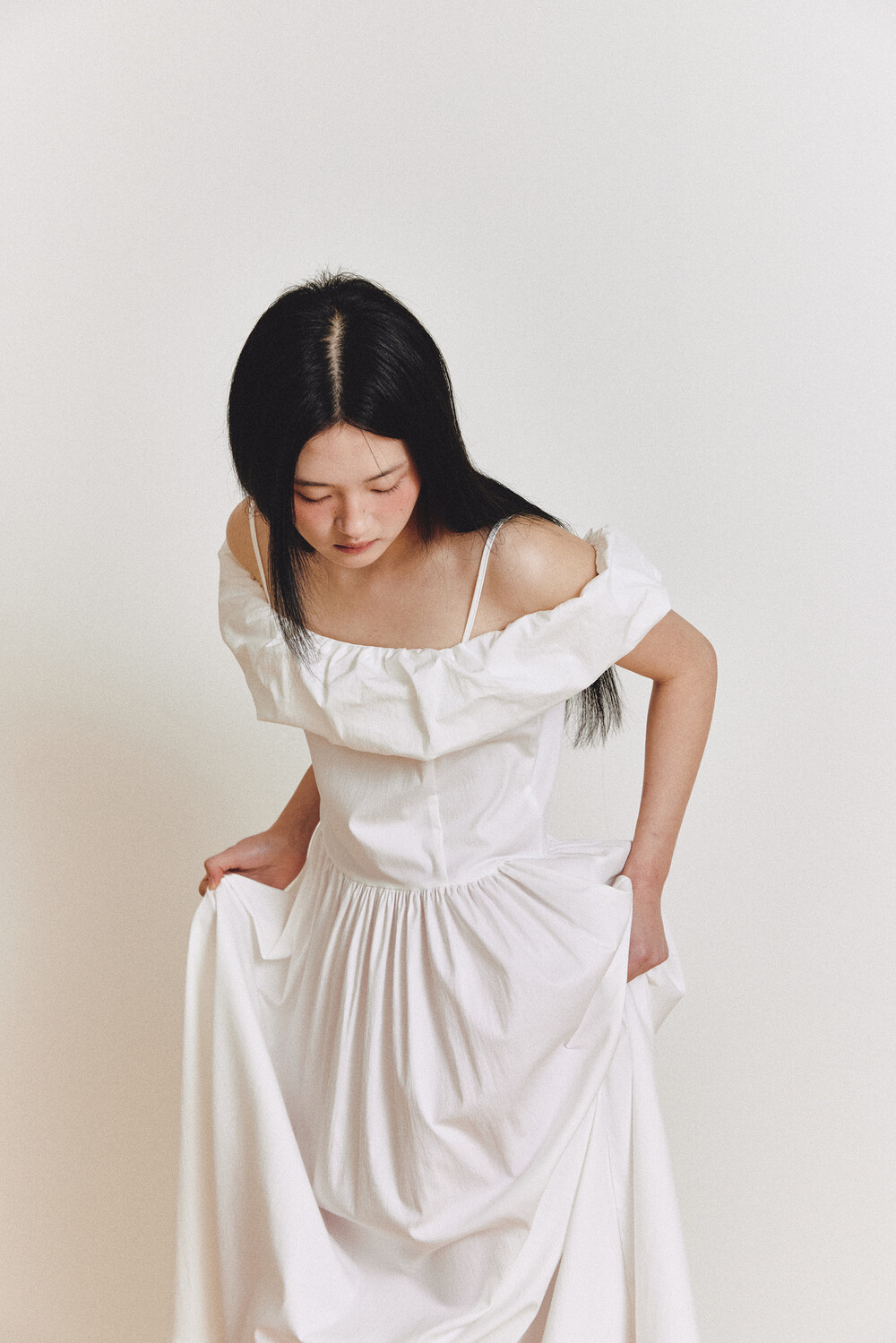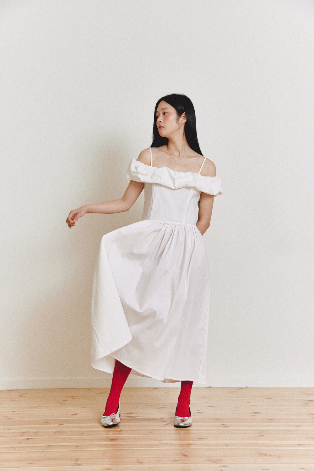 네크라인을 따라 풍성하게 달린 퍼프가 어깨를 감싸는 디테일이 매력적인 아이템입니다.