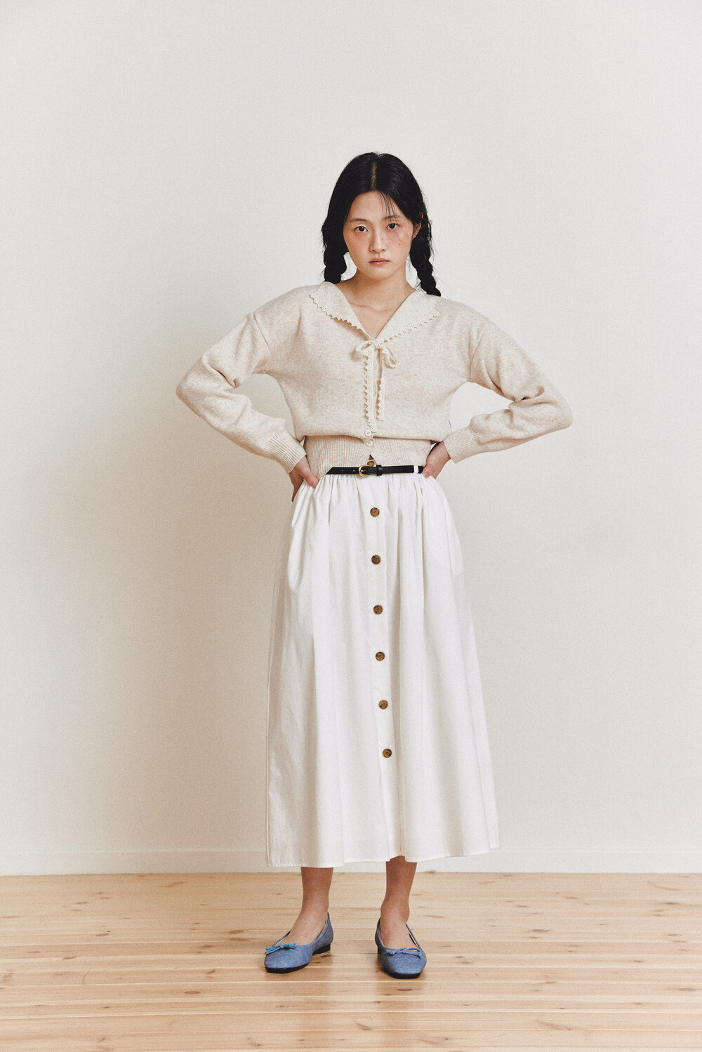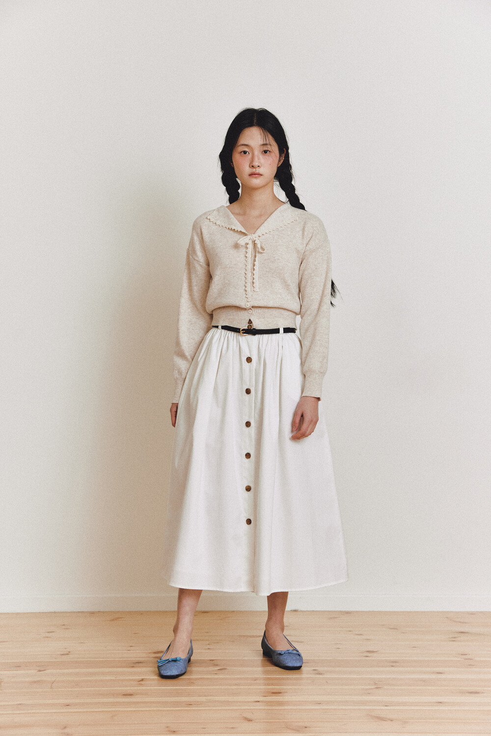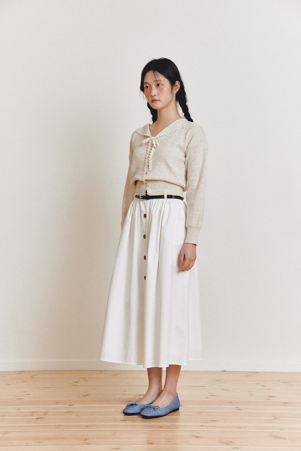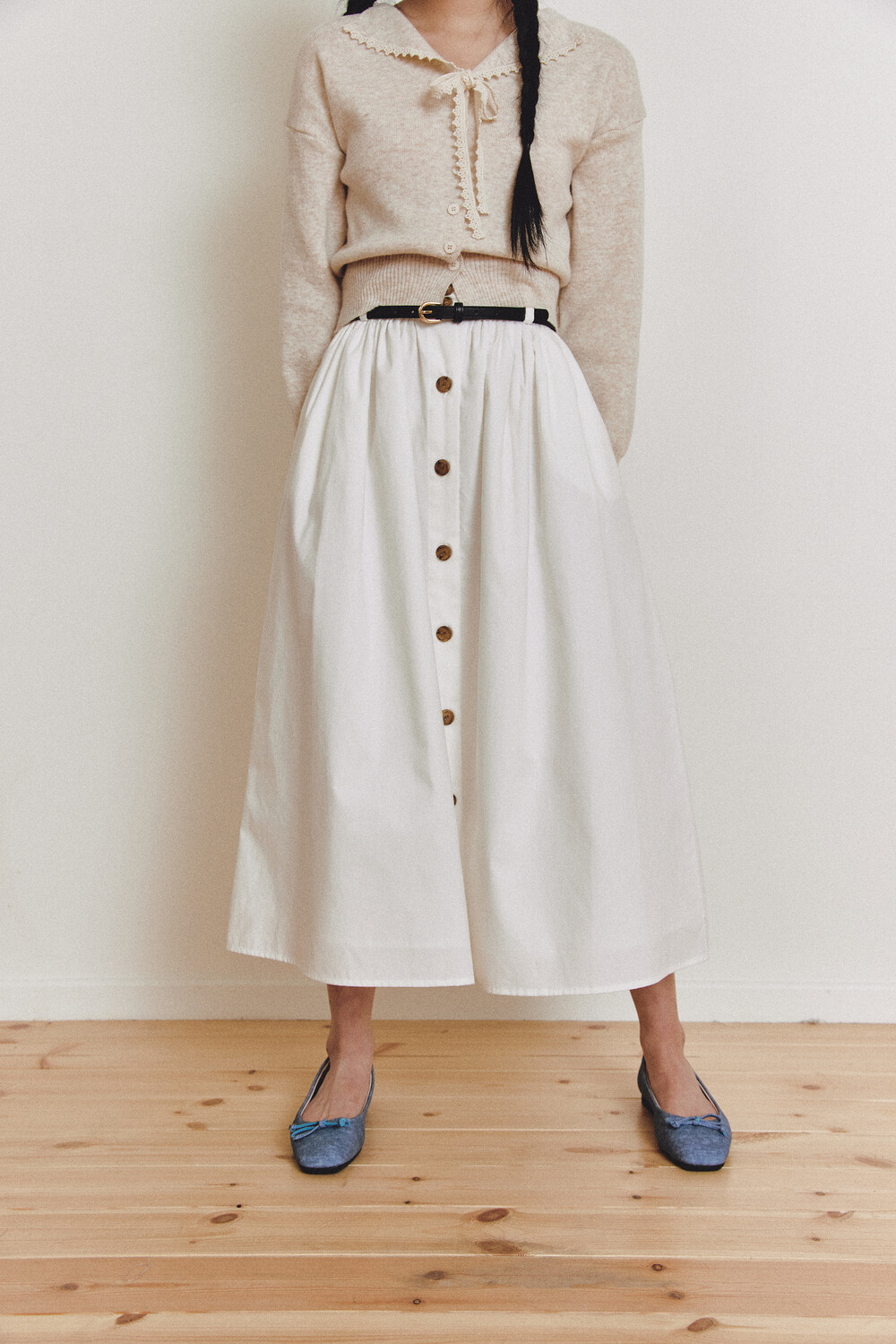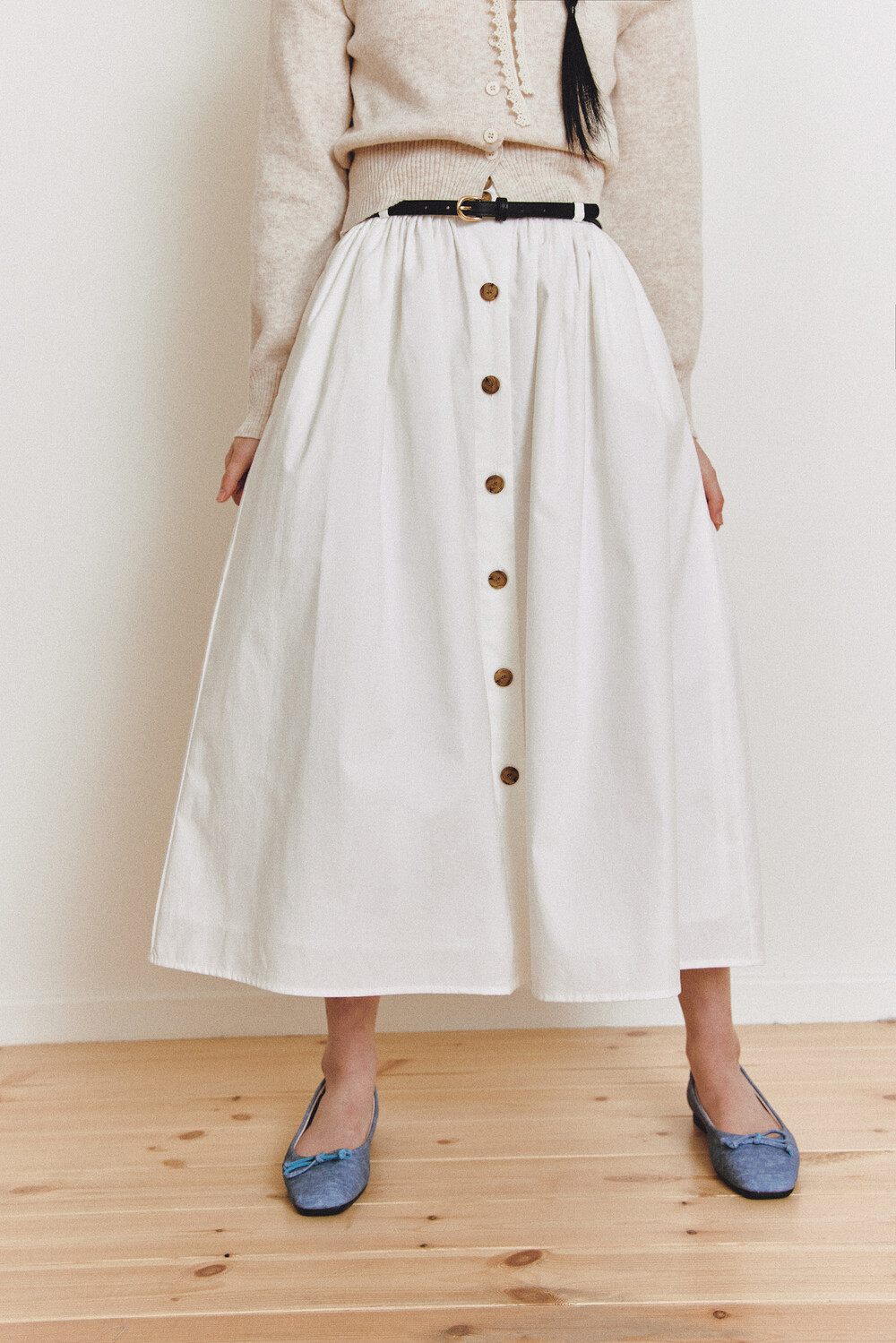 탄탄한 40수 옥스퍼드 원단으로 제작된 롱 스커트입니다.
