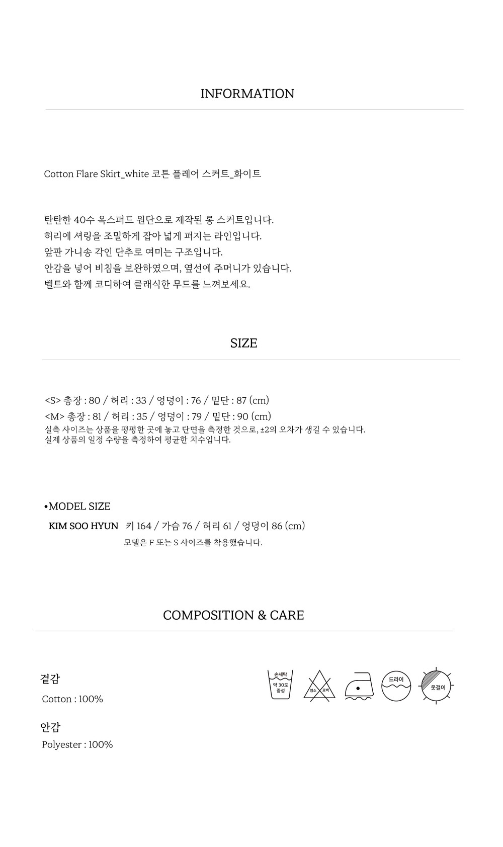 S 총장 : 80 / 허리 : 33 / 엉덩이 : 76 / 밑단 : 87 (cm)
