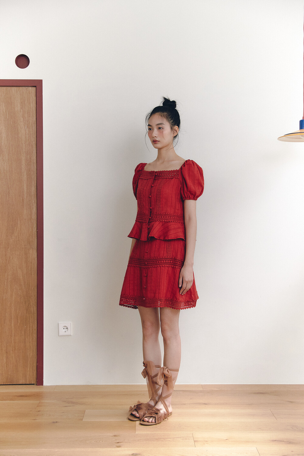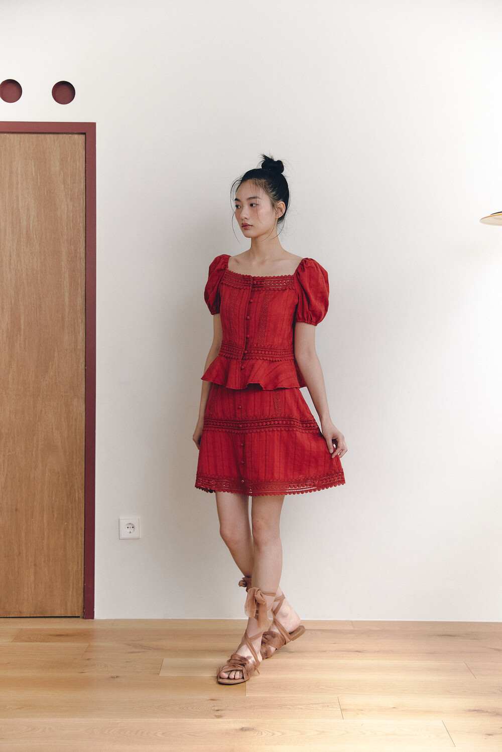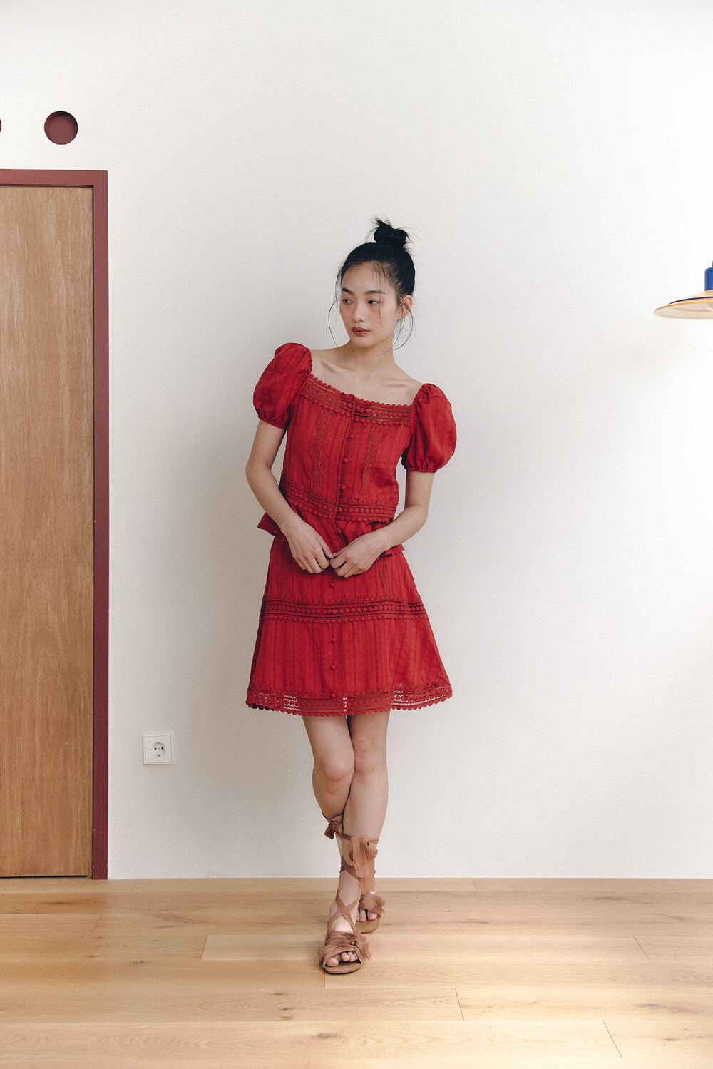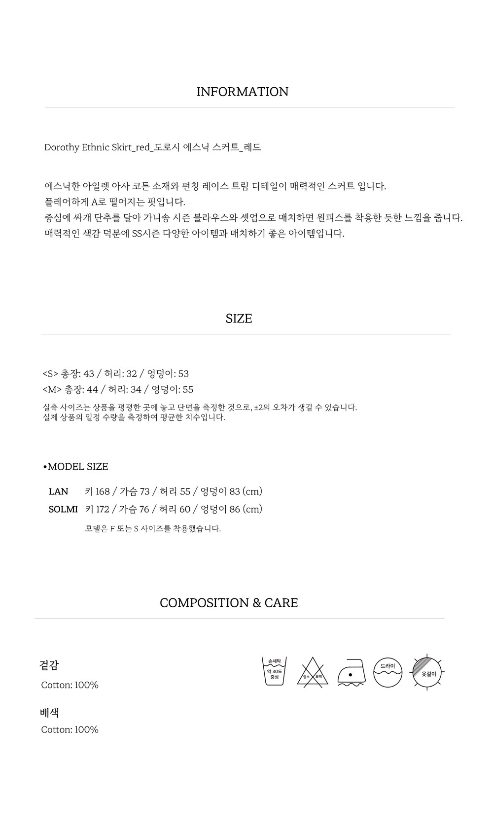 에스닉한 아일렛 아사 코튼 소재와 펀칭 레이스 트림 디테일이 매력적인 스커트 입니다. 플레어하게 A로 떨어지는 핏입니다. 중심에 싸개 단추를 달아 가니송 시즌 블라우스와 셋업으로 매치하면 원피스를 착용한 듯한 느낌을 줍니다. 매력적인 색감 덕분에 SS시즌 다양한 아이템과 매치하기 좋은 아이템입니다.