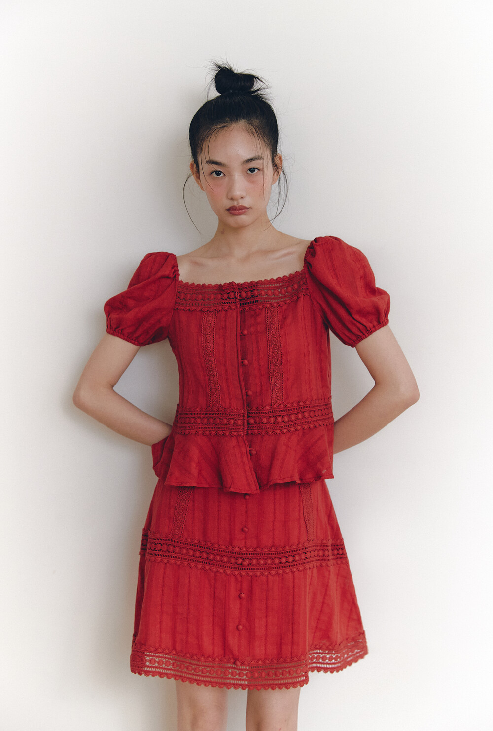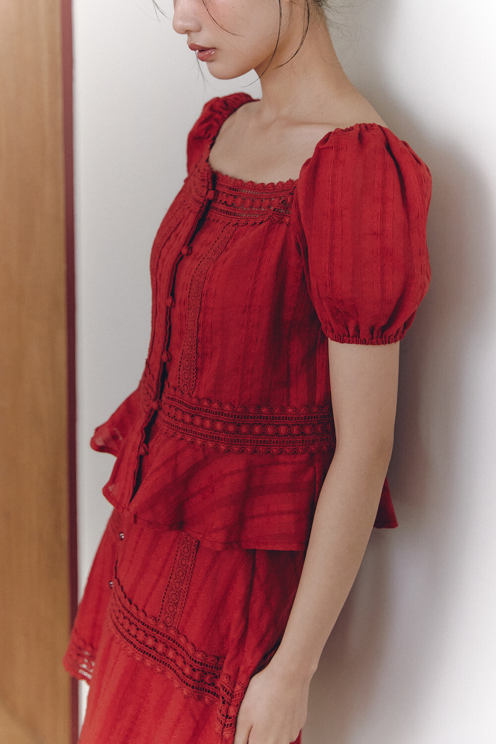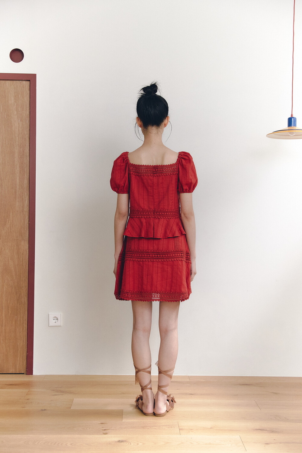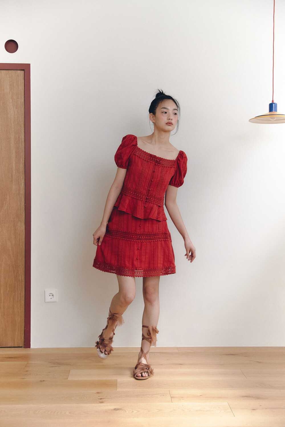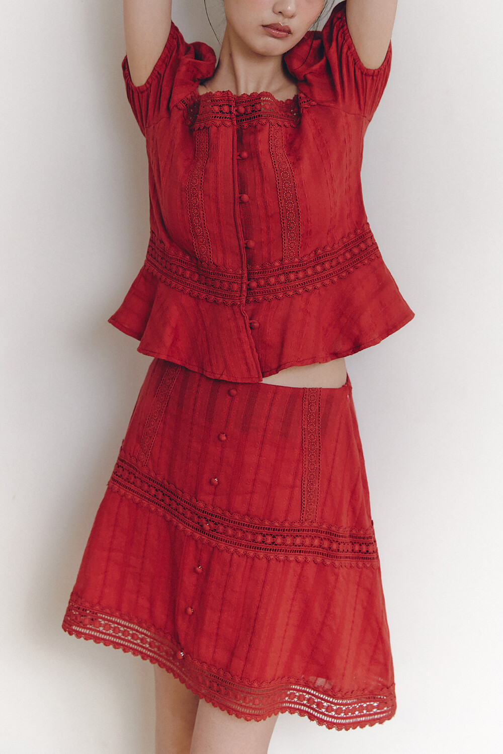 에스닉한 아일렛 아사 코튼 소재와 펀칭 레이스 트림 디테일이 매력적인 스커트 입니다. 플레어하게 A로 떨어지는 핏입니다. 중심에 싸개 단추를 달아 가니송 시즌 블라우스와 셋업으로 매치하면 원피스를 착용한 듯한 느낌을 줍니다. 매력적인 색감 덕분에 SS시즌 다양한 아이템과 매치하기 좋은 아이템입니다.