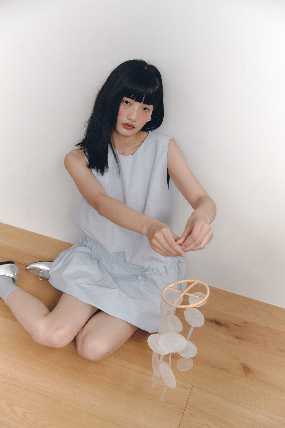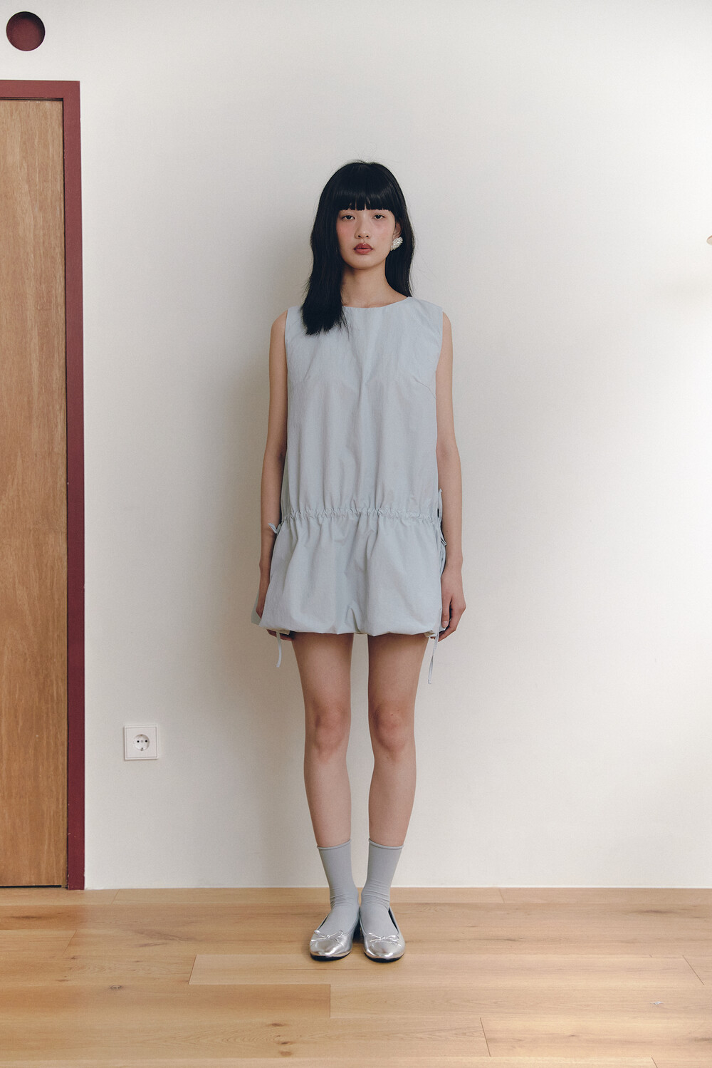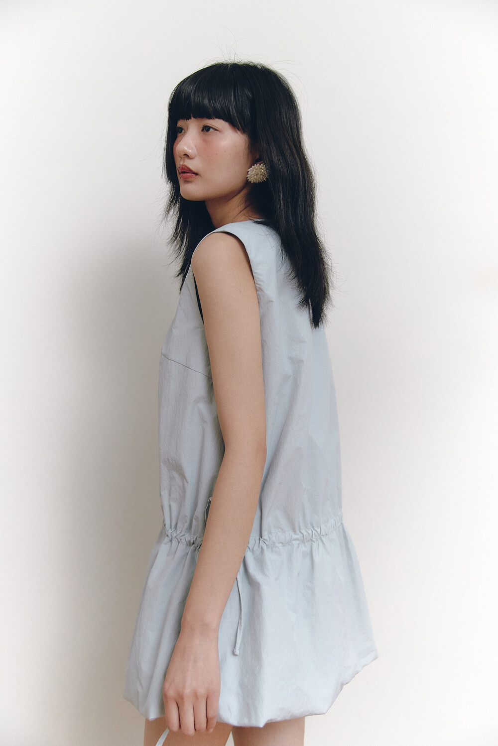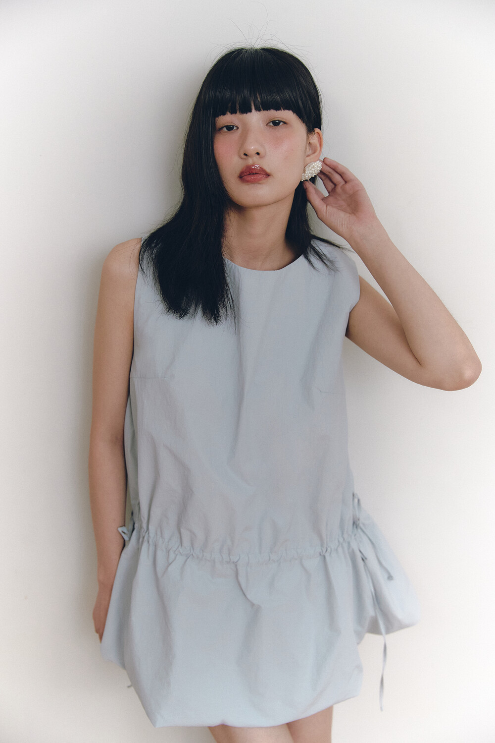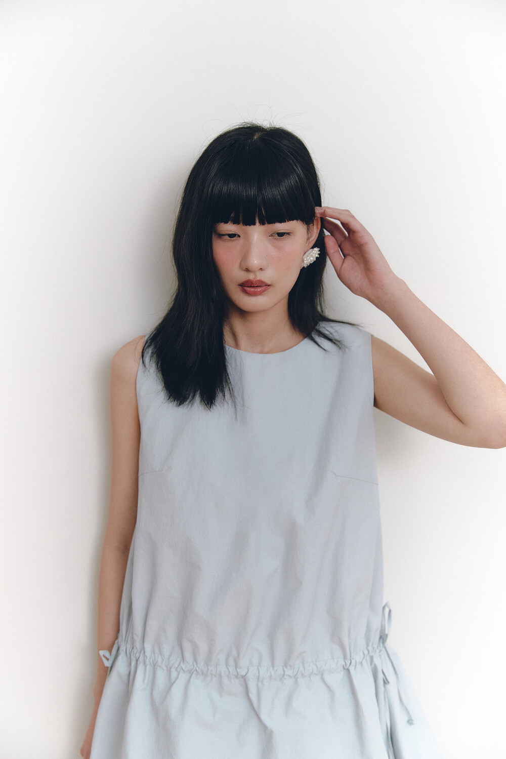 미스티 블루 컬러가 매력적인 슬리브리스 원피스입니다. 리본으로 셔링을 잡아 밑단을 풍성하게 연출할 수 있는 구조입니다. 뒤판 트임 단추 여밈 구조로 편안하게 착탈의가 가능합니다. 시원하고 바삭한 터치감의 면-나일론 혼방 소재를 사용했습니다. 무릎 위 기장감으로 단독으로 혹은 팬츠와 매치해 연출해보세요.