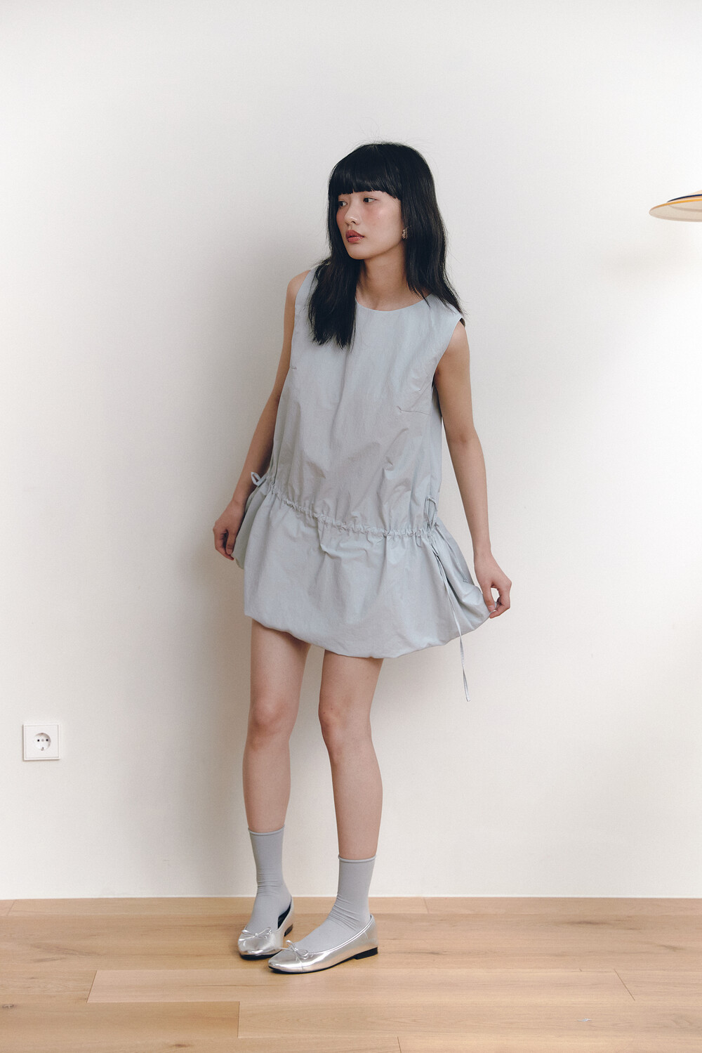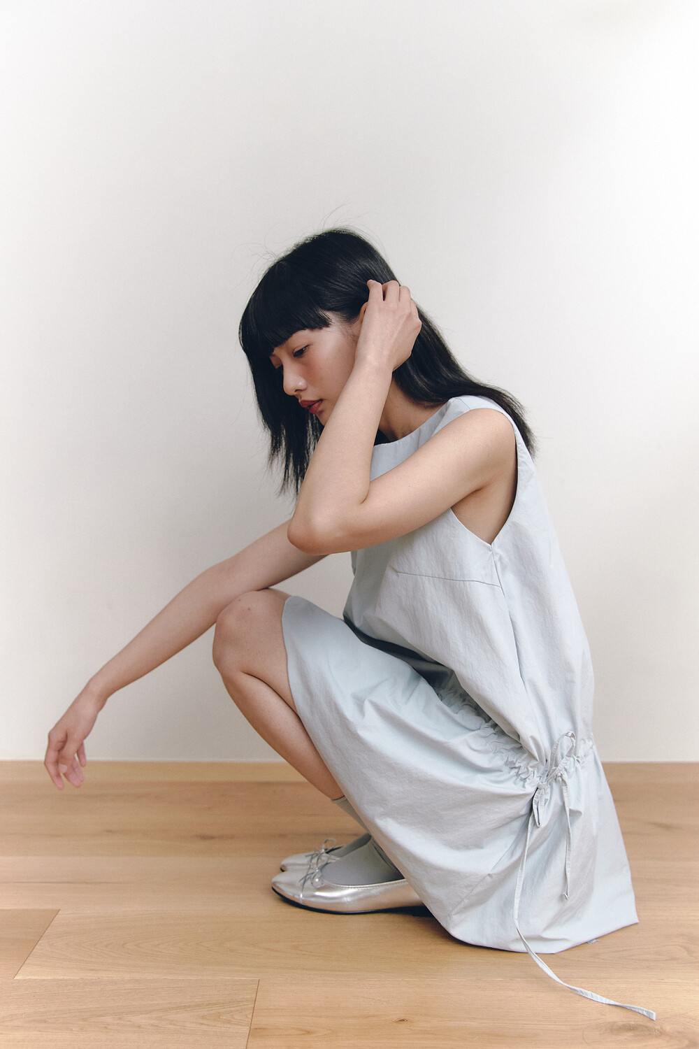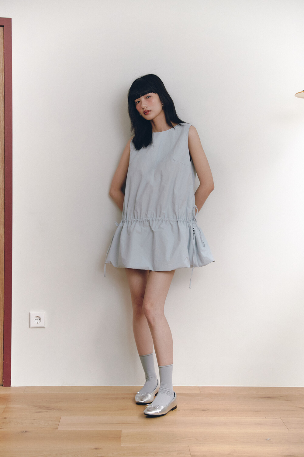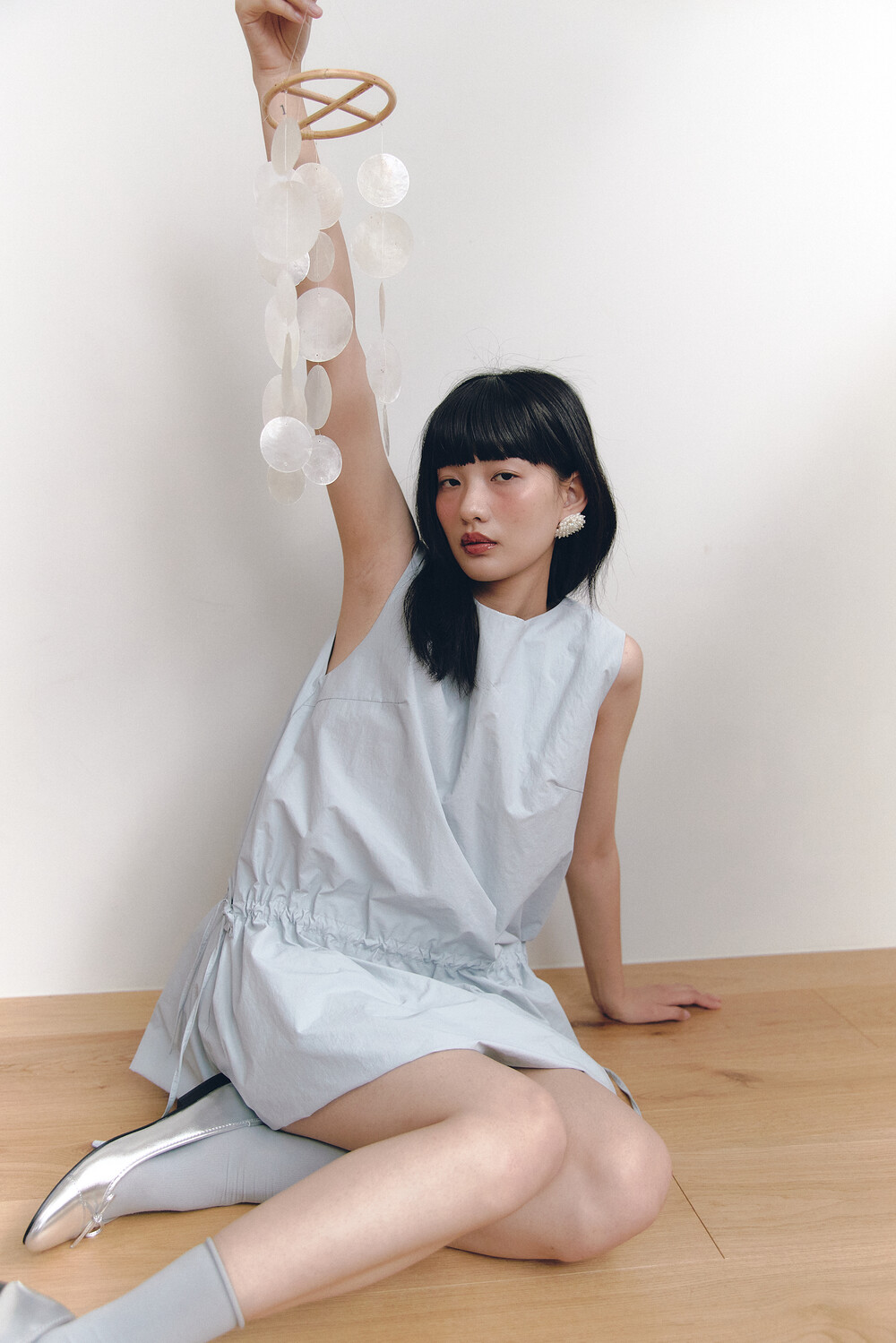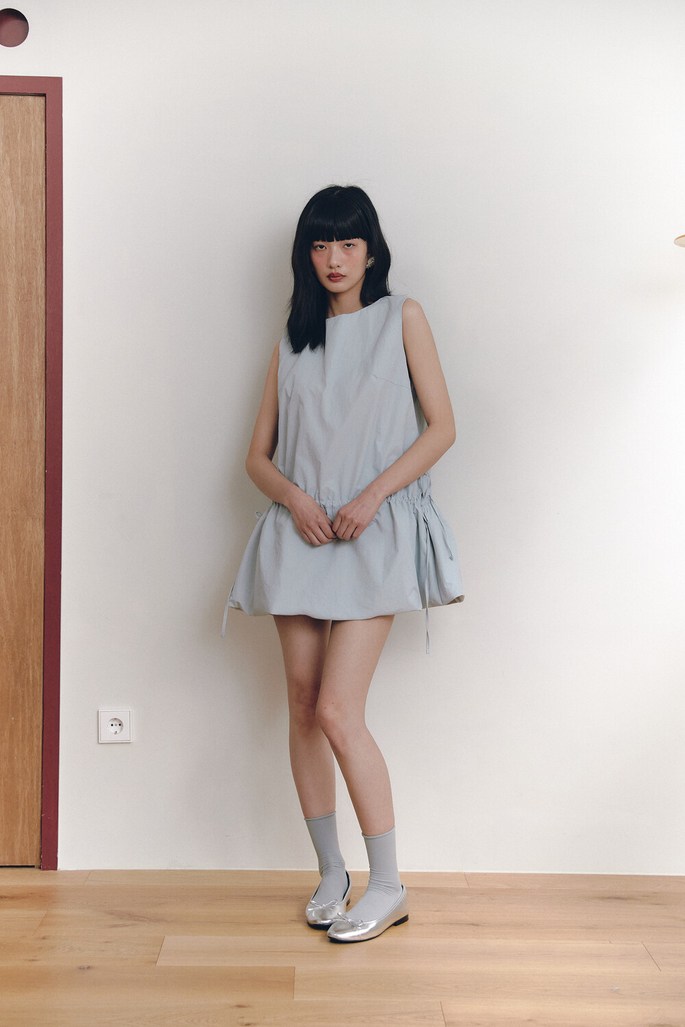 미스티 블루 컬러가 매력적인 슬리브리스 원피스입니다. 리본으로 셔링을 잡아 밑단을 풍성하게 연출할 수 있는 구조입니다. 뒤판 트임 단추 여밈 구조로 편안하게 착탈의가 가능합니다. 시원하고 바삭한 터치감의 면-나일론 혼방 소재를 사용했습니다. 무릎 위 기장감으로 단독으로 혹은 팬츠와 매치해 연출해보세요.