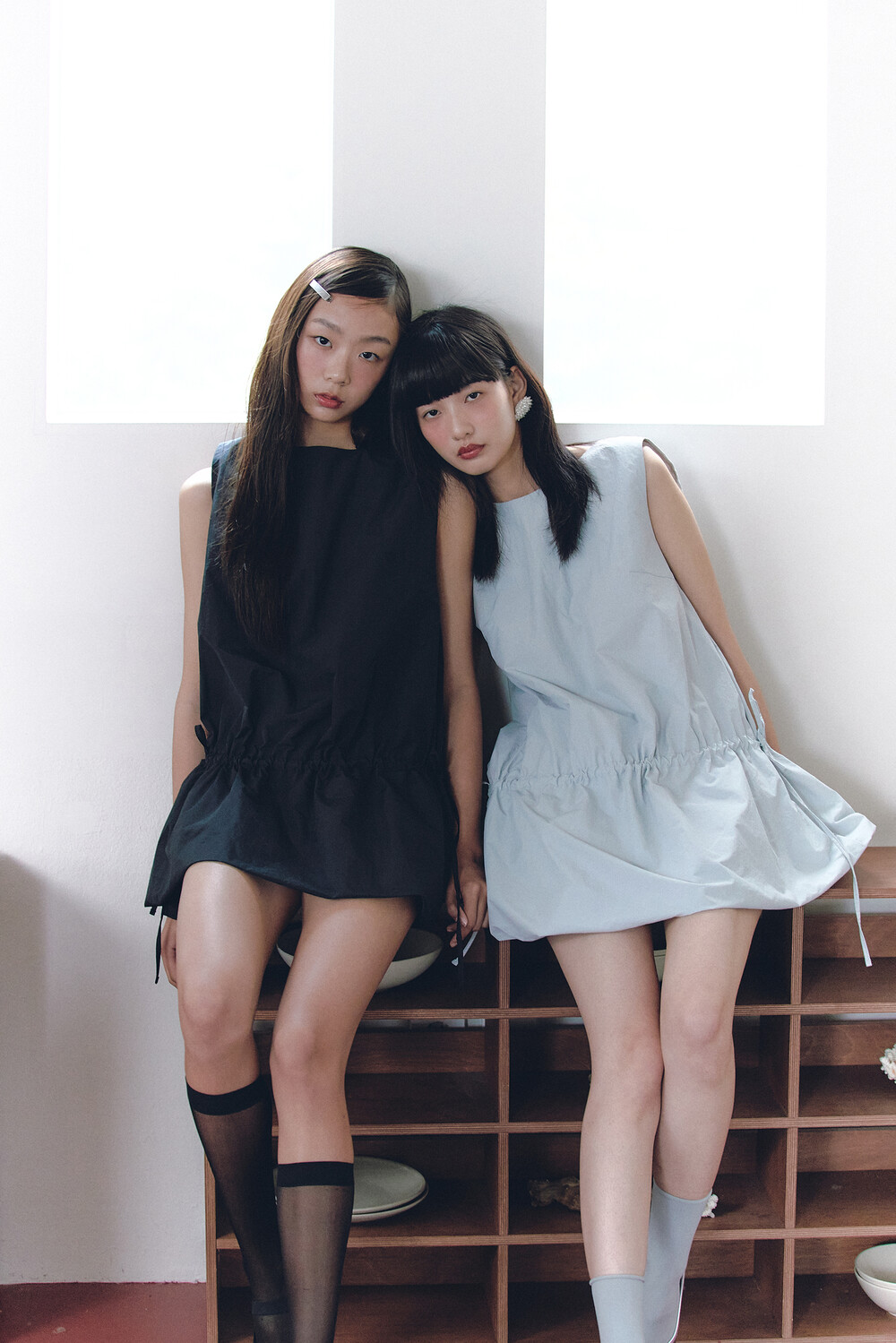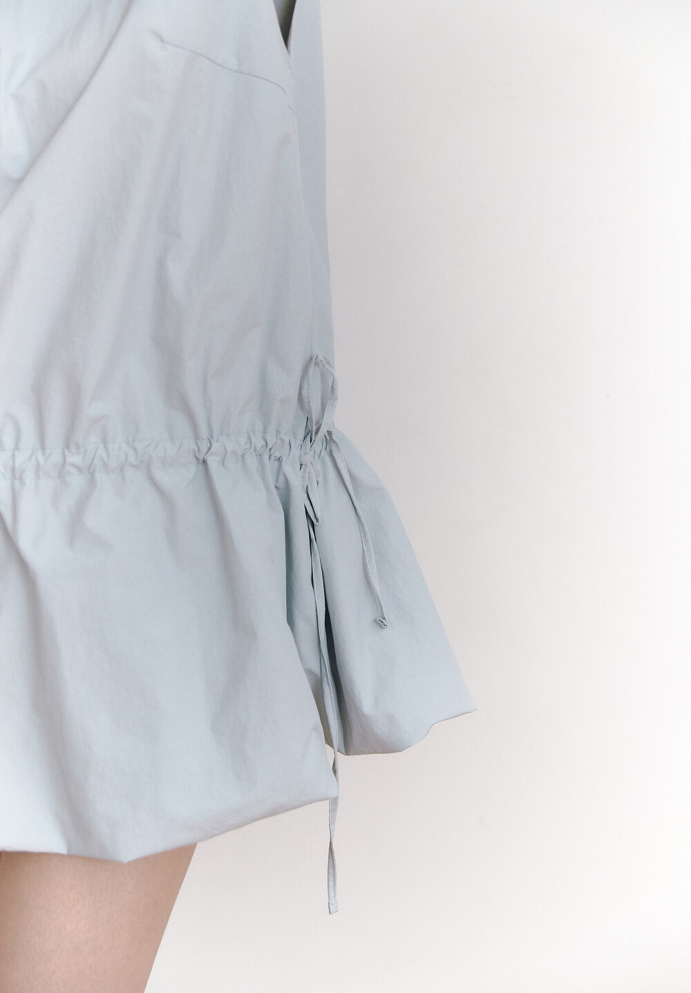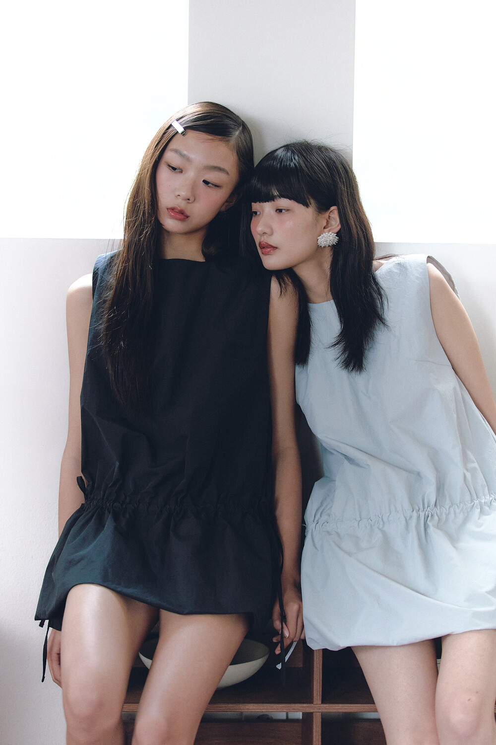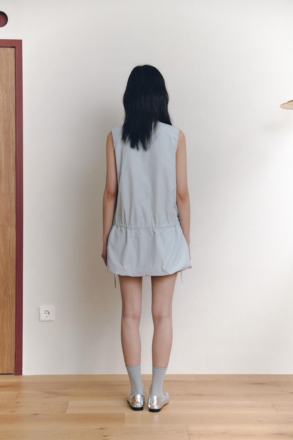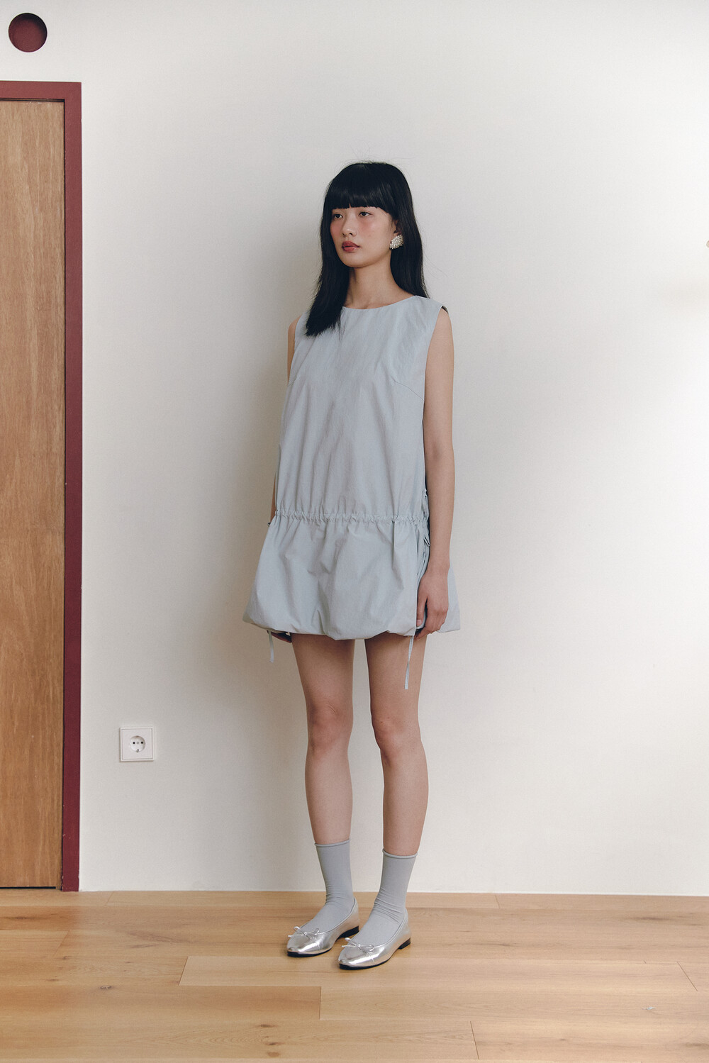 미스티 블루 컬러가 매력적인 슬리브리스 원피스입니다. 리본으로 셔링을 잡아 밑단을 풍성하게 연출할 수 있는 구조입니다. 뒤판 트임 단추 여밈 구조로 편안하게 착탈의가 가능합니다. 시원하고 바삭한 터치감의 면-나일론 혼방 소재를 사용했습니다. 무릎 위 기장감으로 단독으로 혹은 팬츠와 매치해 연출해보세요.