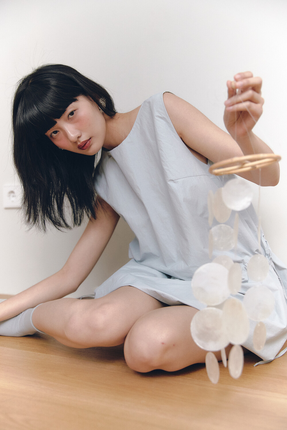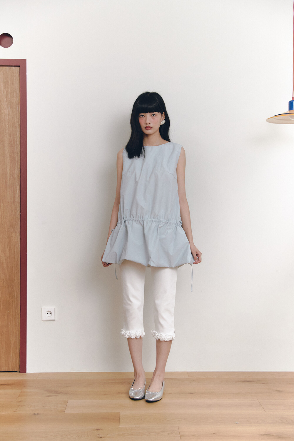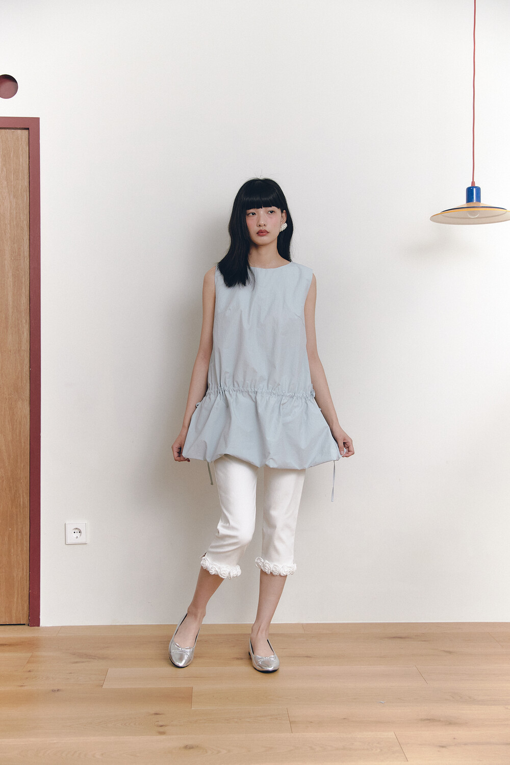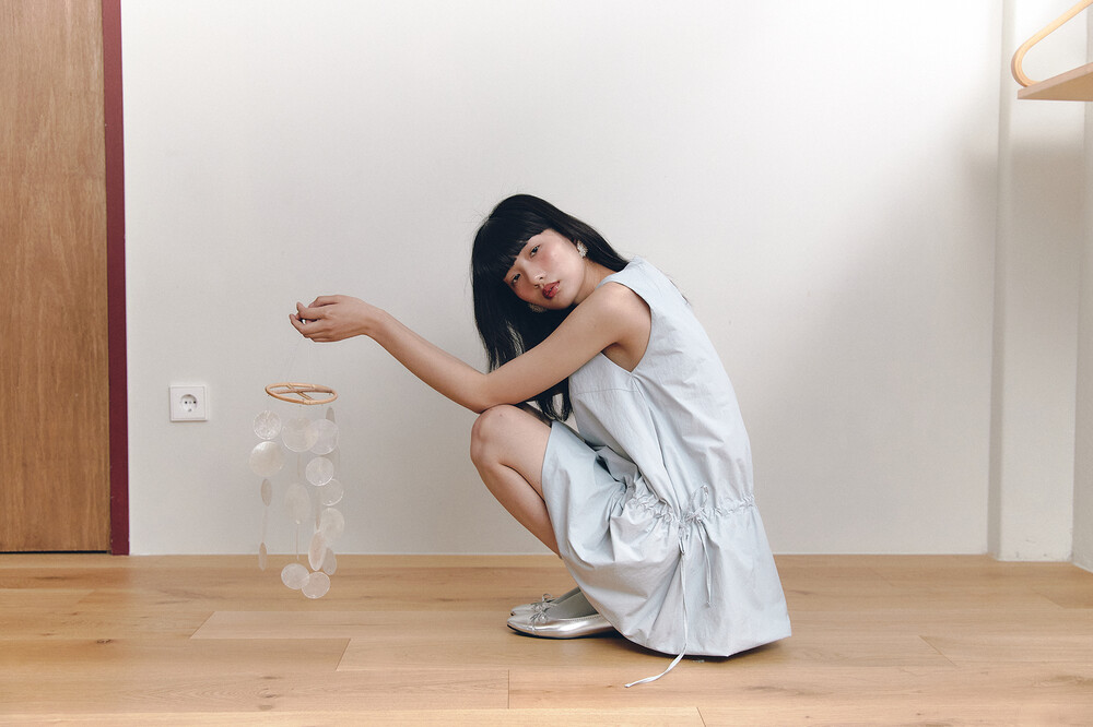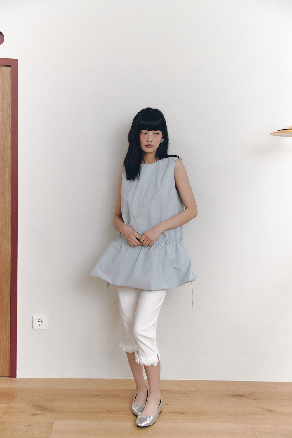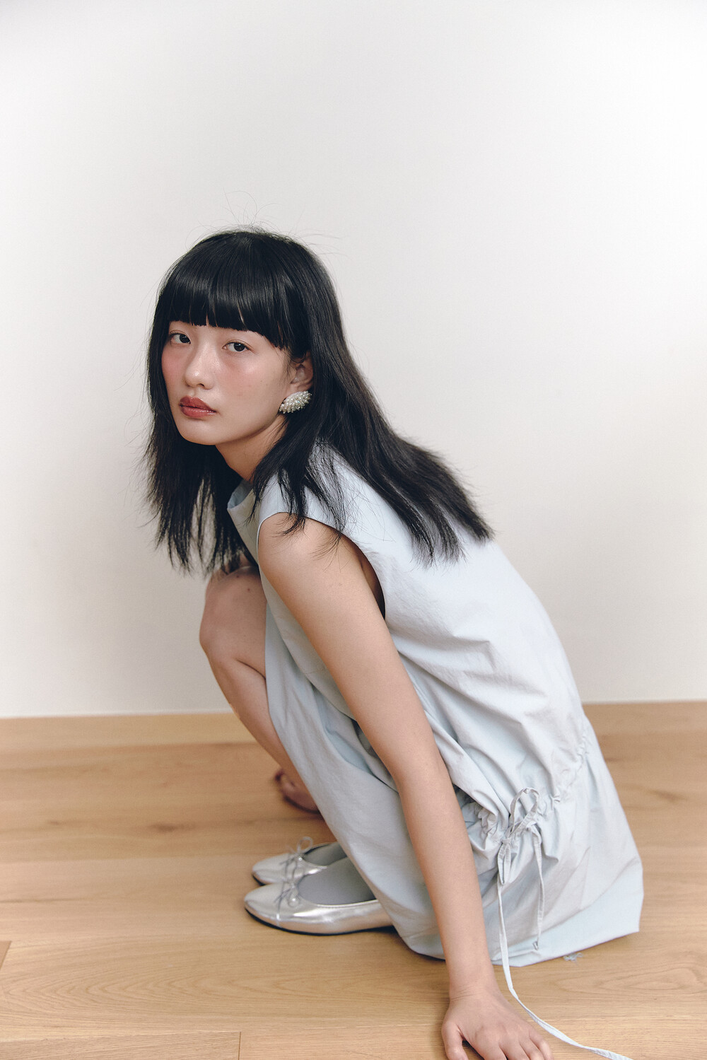 미스티 블루 컬러가 매력적인 슬리브리스 원피스입니다. 리본으로 셔링을 잡아 밑단을 풍성하게 연출할 수 있는 구조입니다. 뒤판 트임 단추 여밈 구조로 편안하게 착탈의가 가능합니다. 시원하고 바삭한 터치감의 면-나일론 혼방 소재를 사용했습니다. 무릎 위 기장감으로 단독으로 혹은 팬츠와 매치해 연출해보세요.