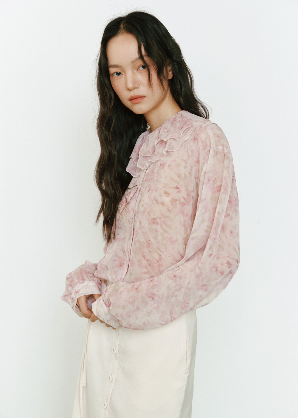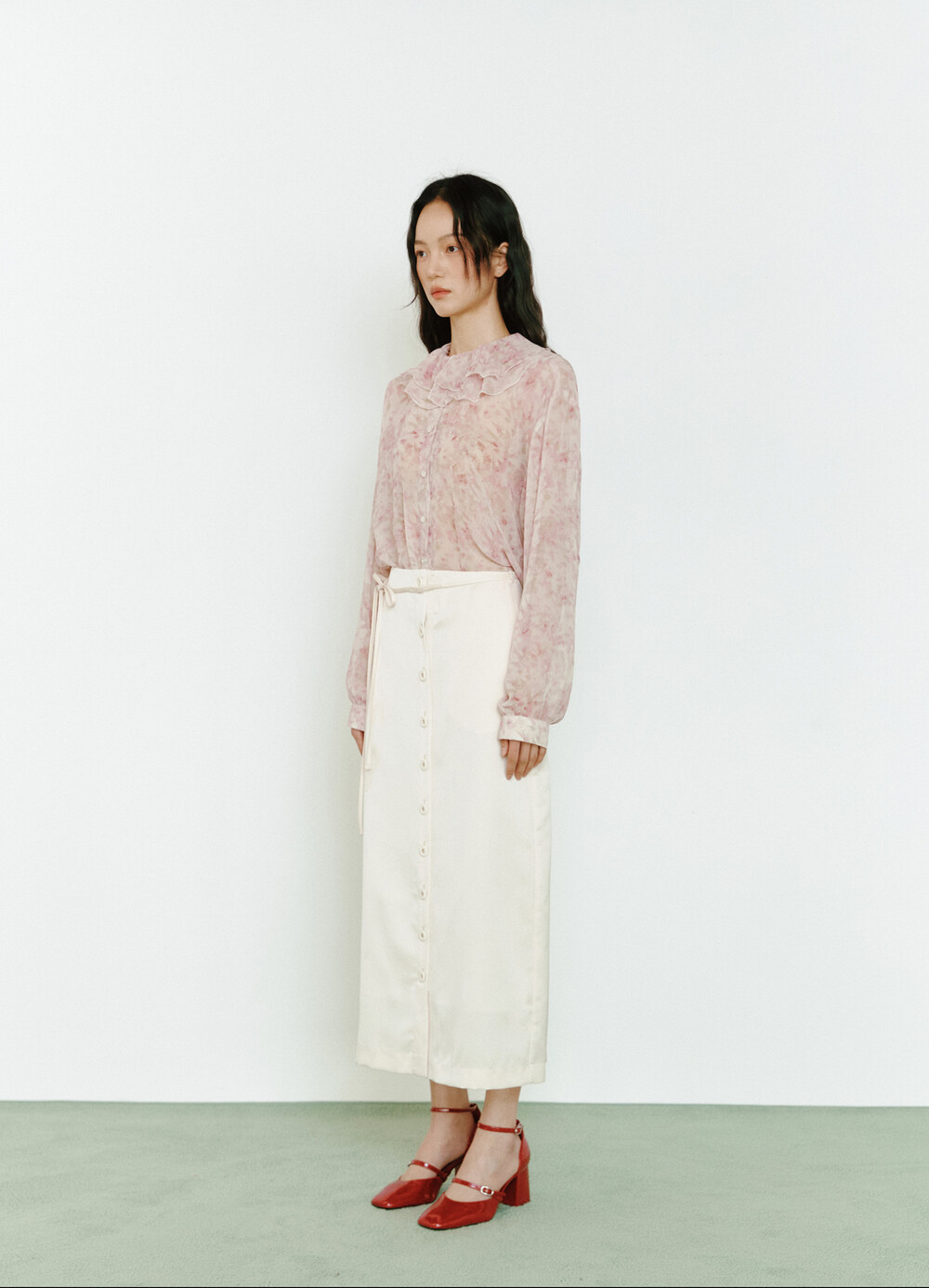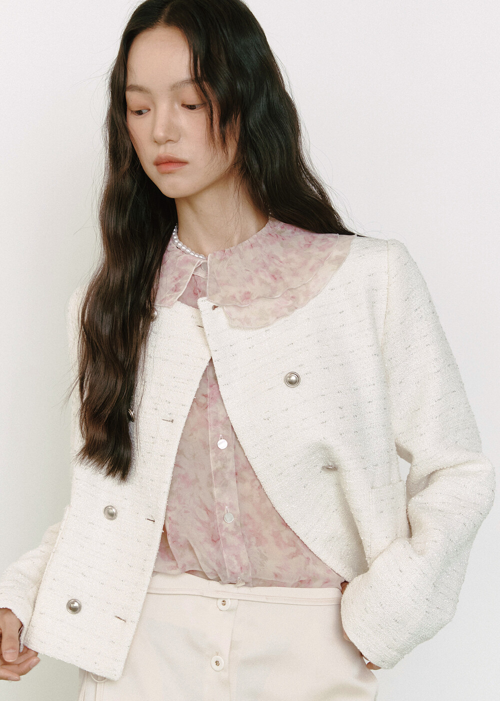 ㆍ카라 단과 밑단의 가볍게 마무리한 봉제 방식으로 여리여리한 무드를 연출