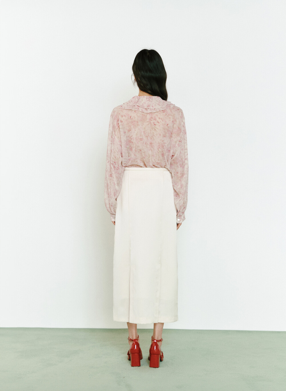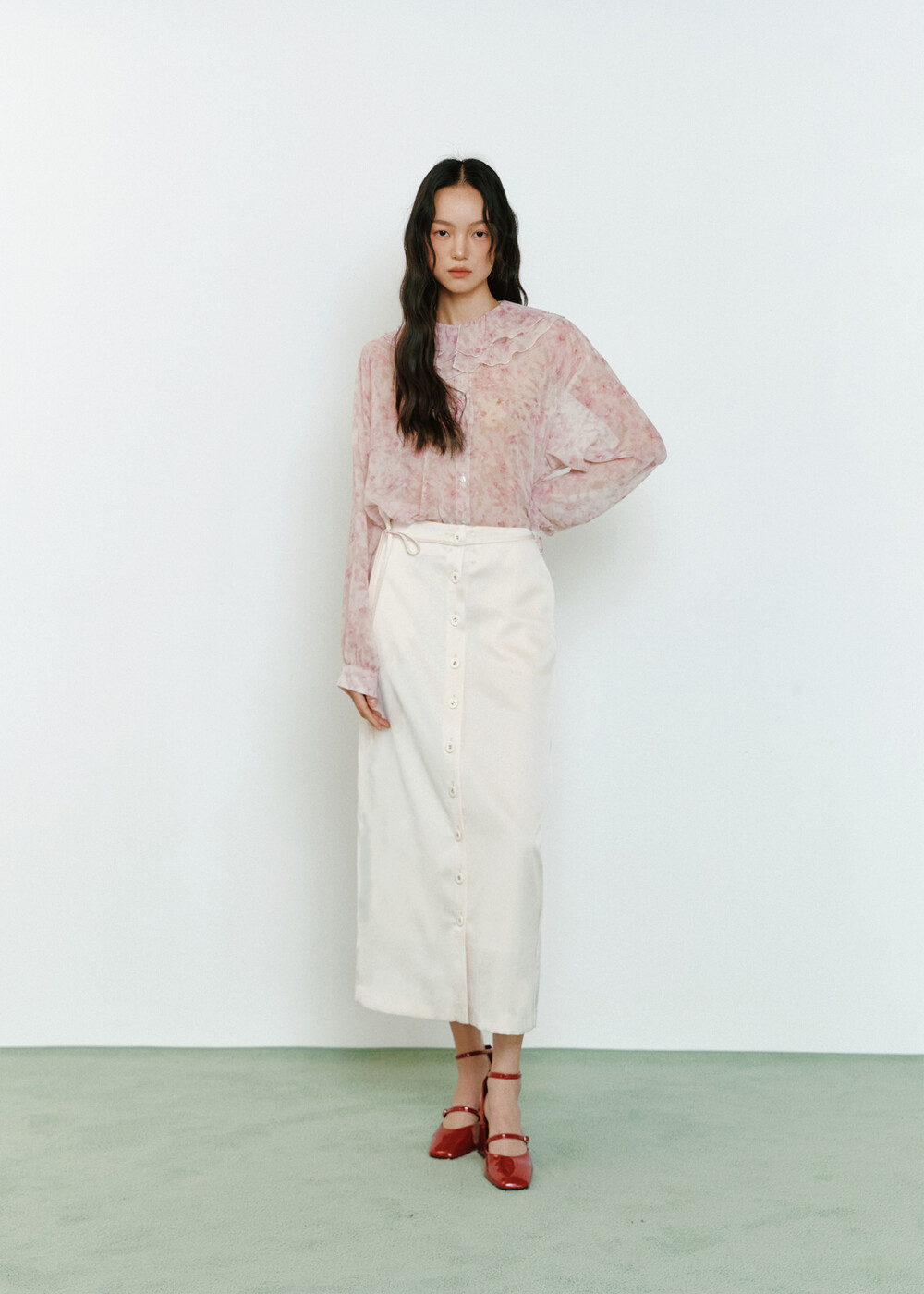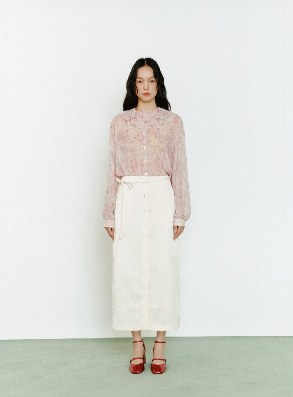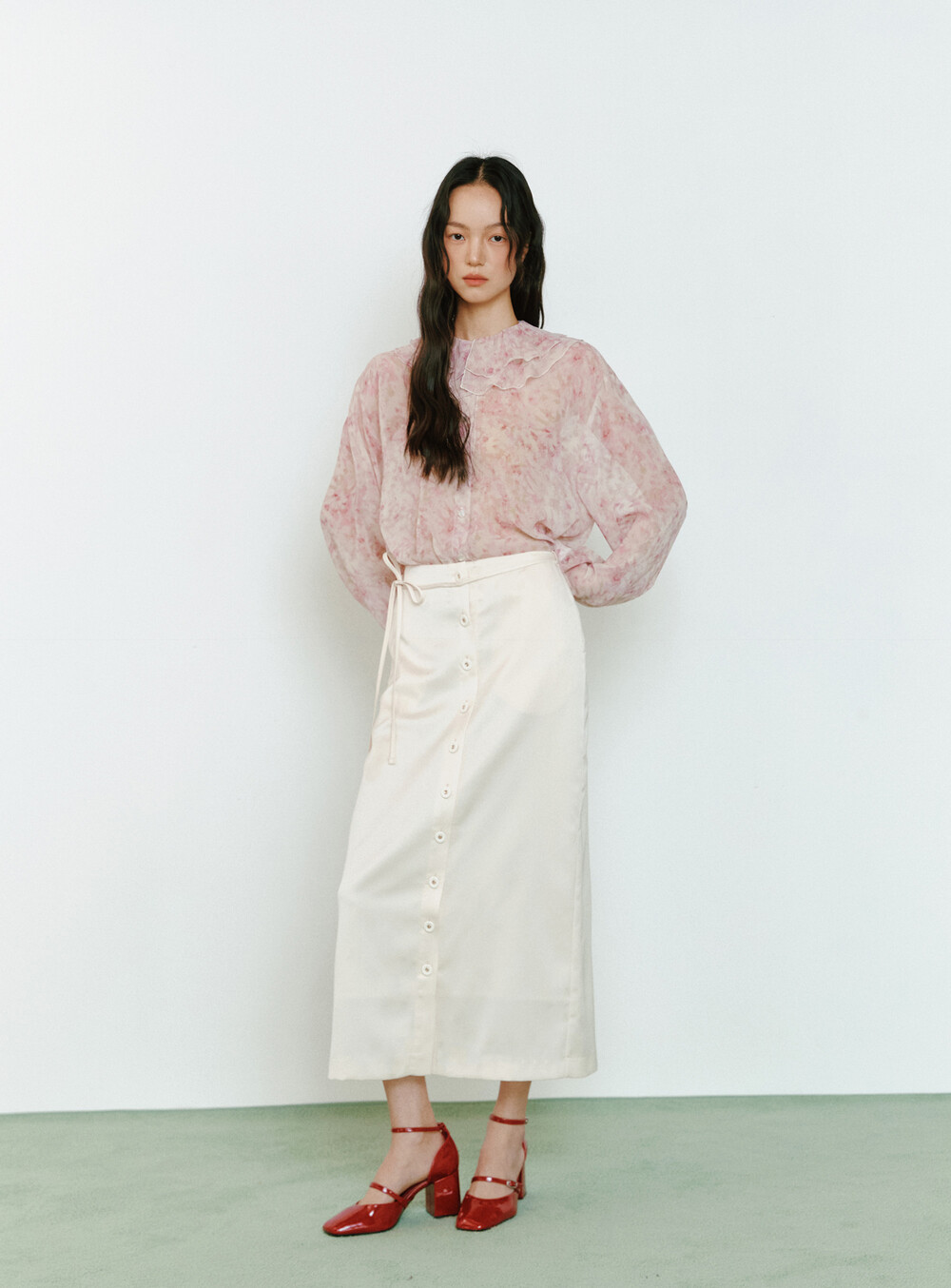 ㆍ카라 단과 밑단의 가볍게 마무리한 봉제 방식으로 여리여리한 무드를 연출