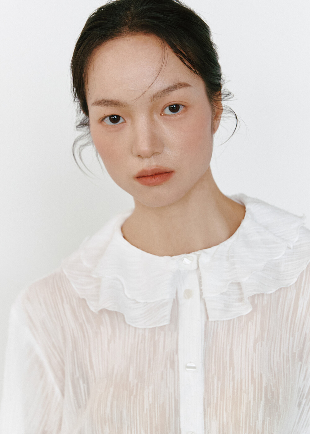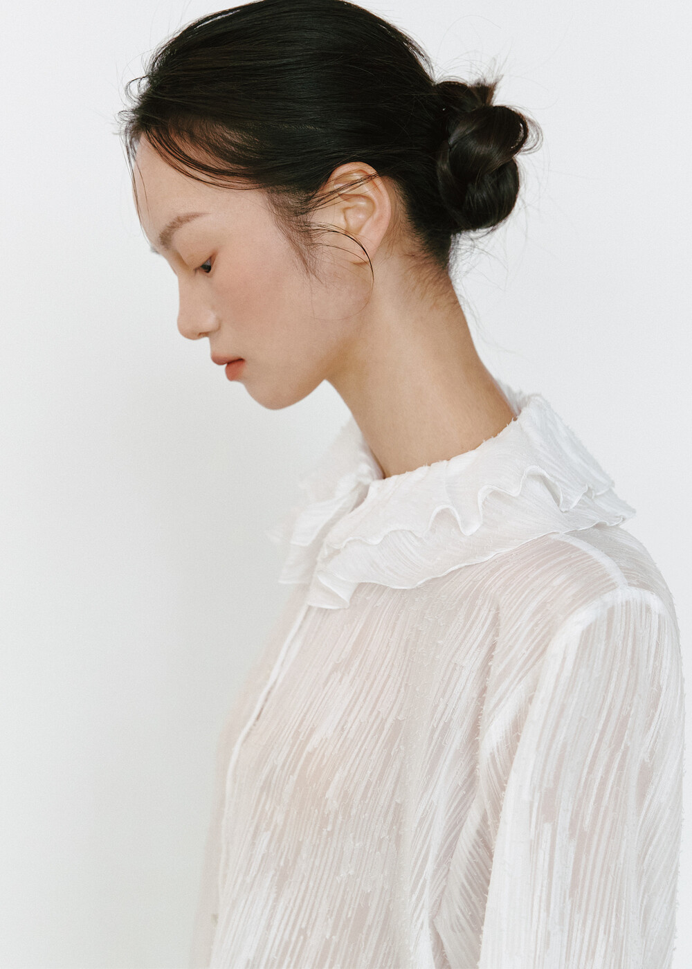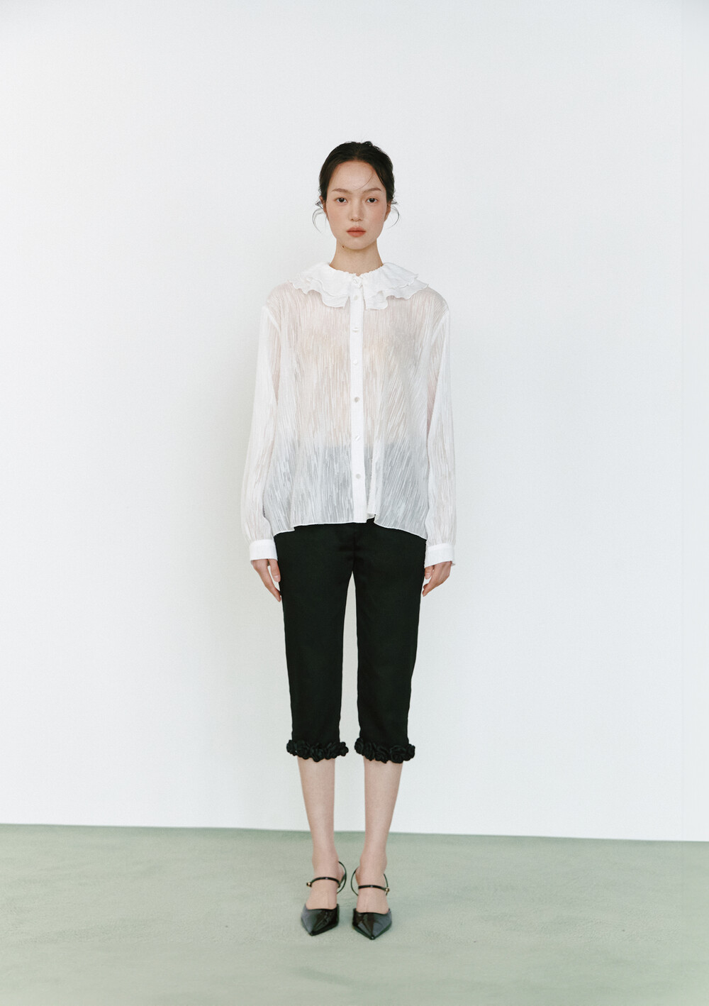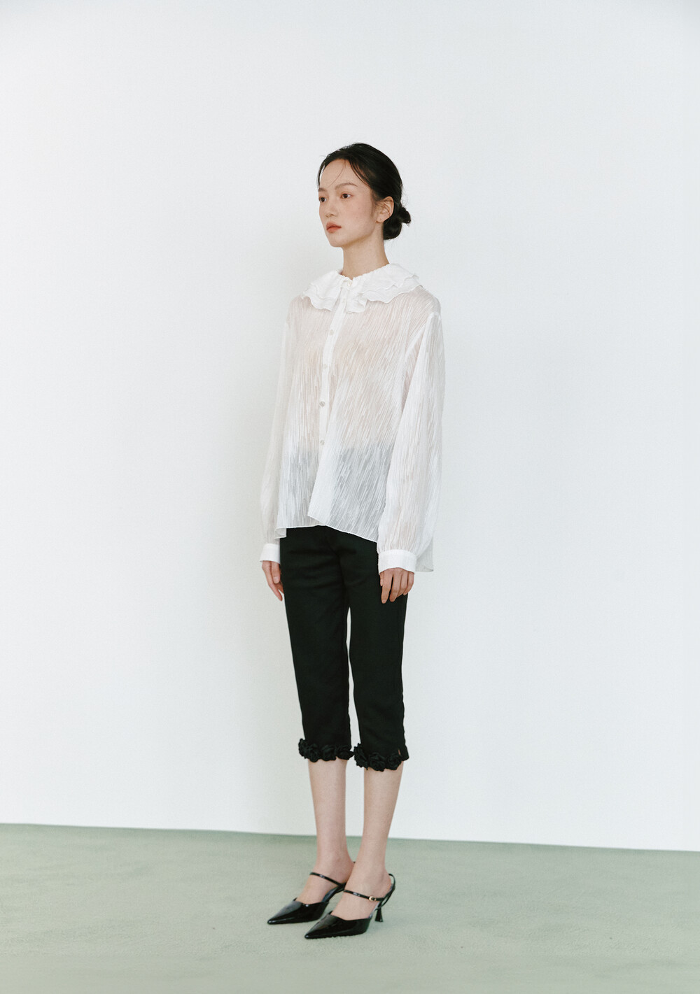ㆍ카라 단과 밑단의 가볍게 마무리한 봉제 방식으로 여리여리한 무드를 연출