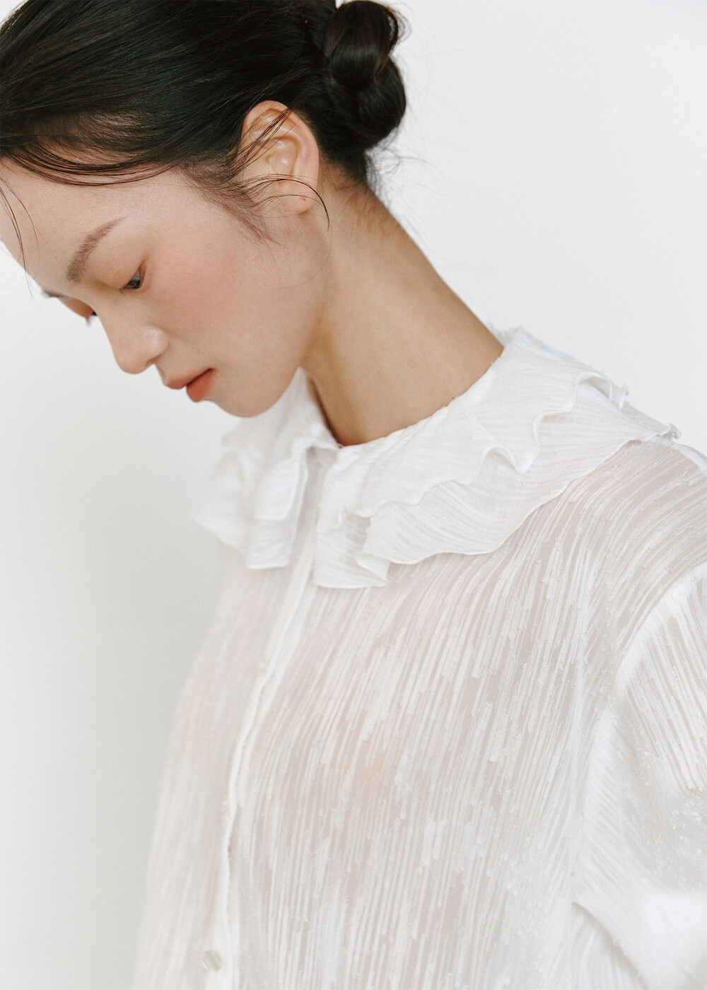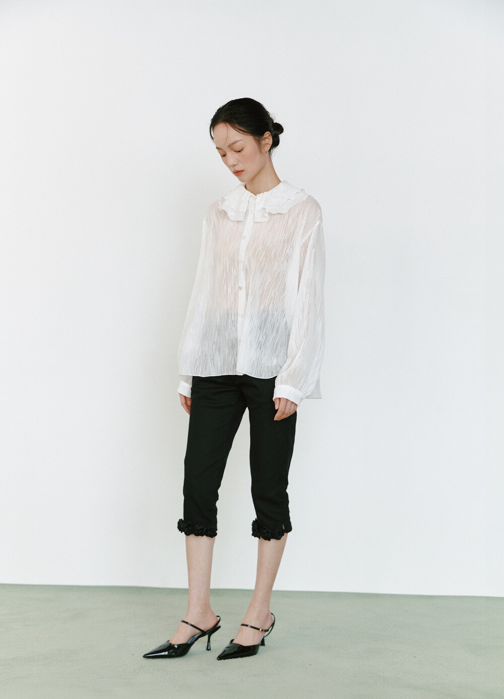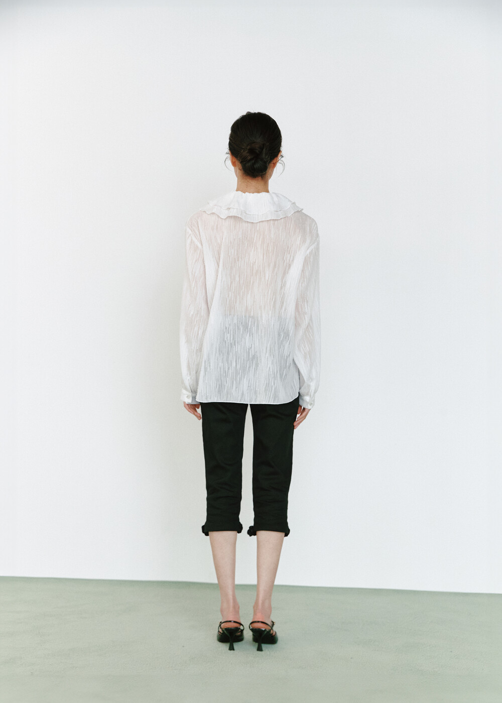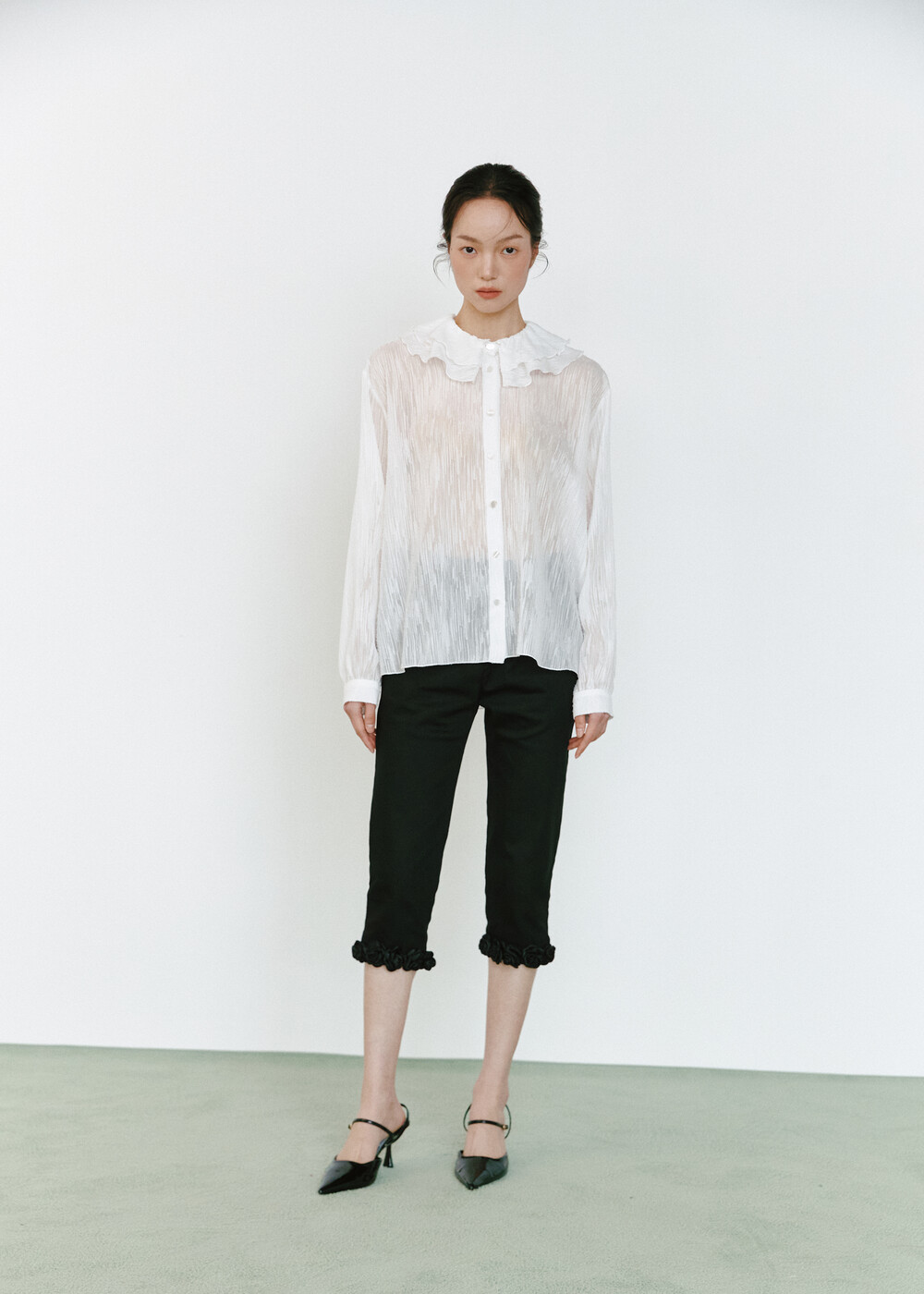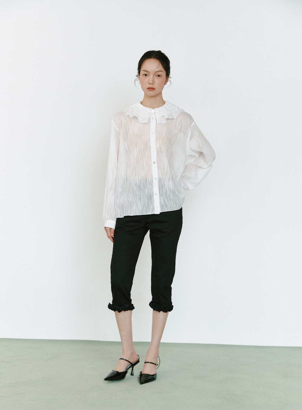 ㆍ카라 단과 밑단의 가볍게 마무리한 봉제 방식으로 여리여리한 무드를 연출