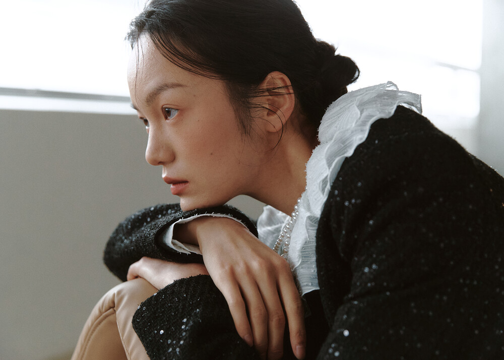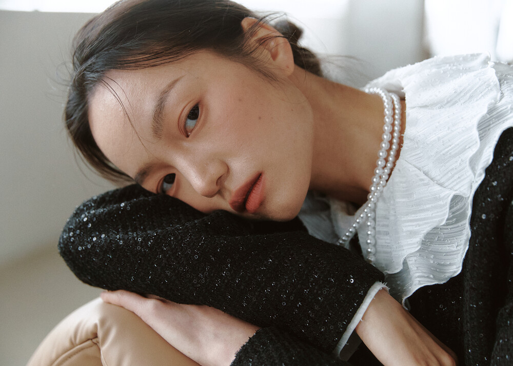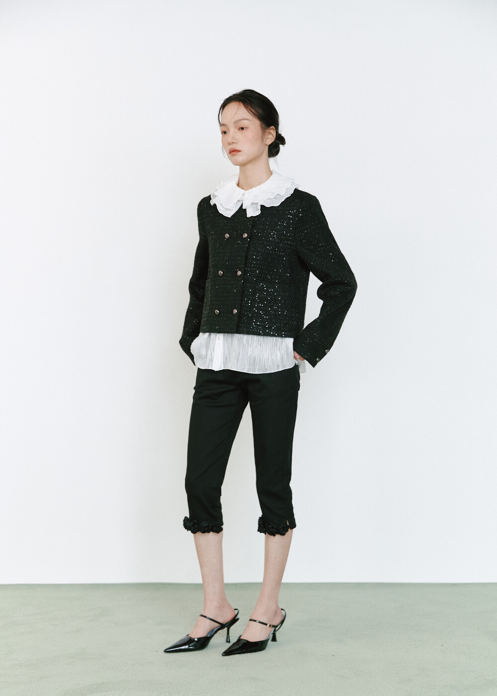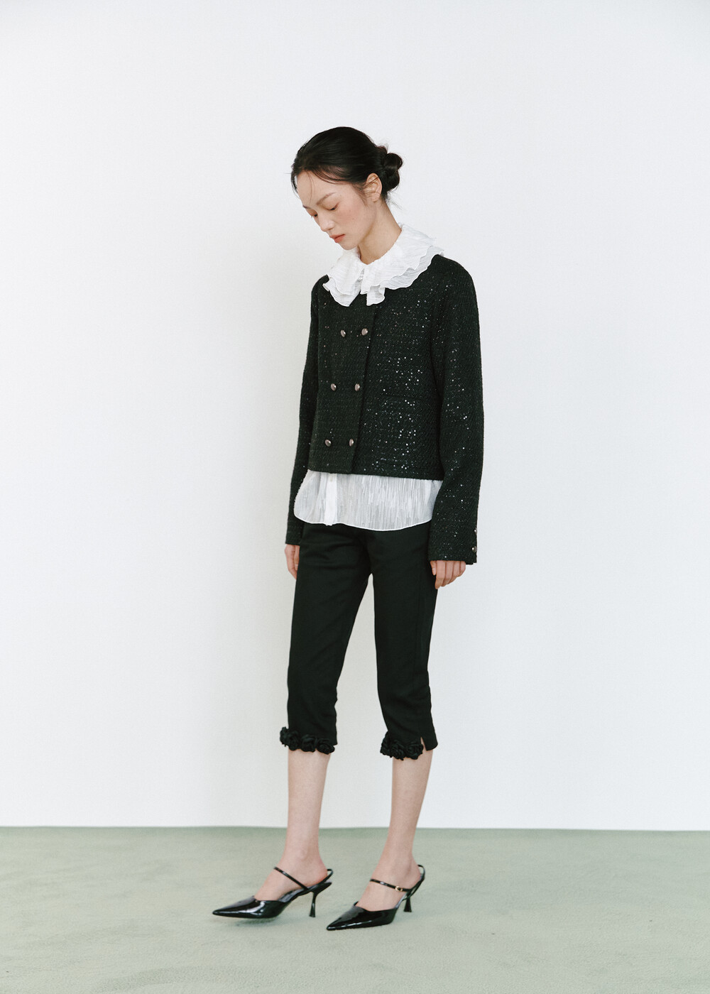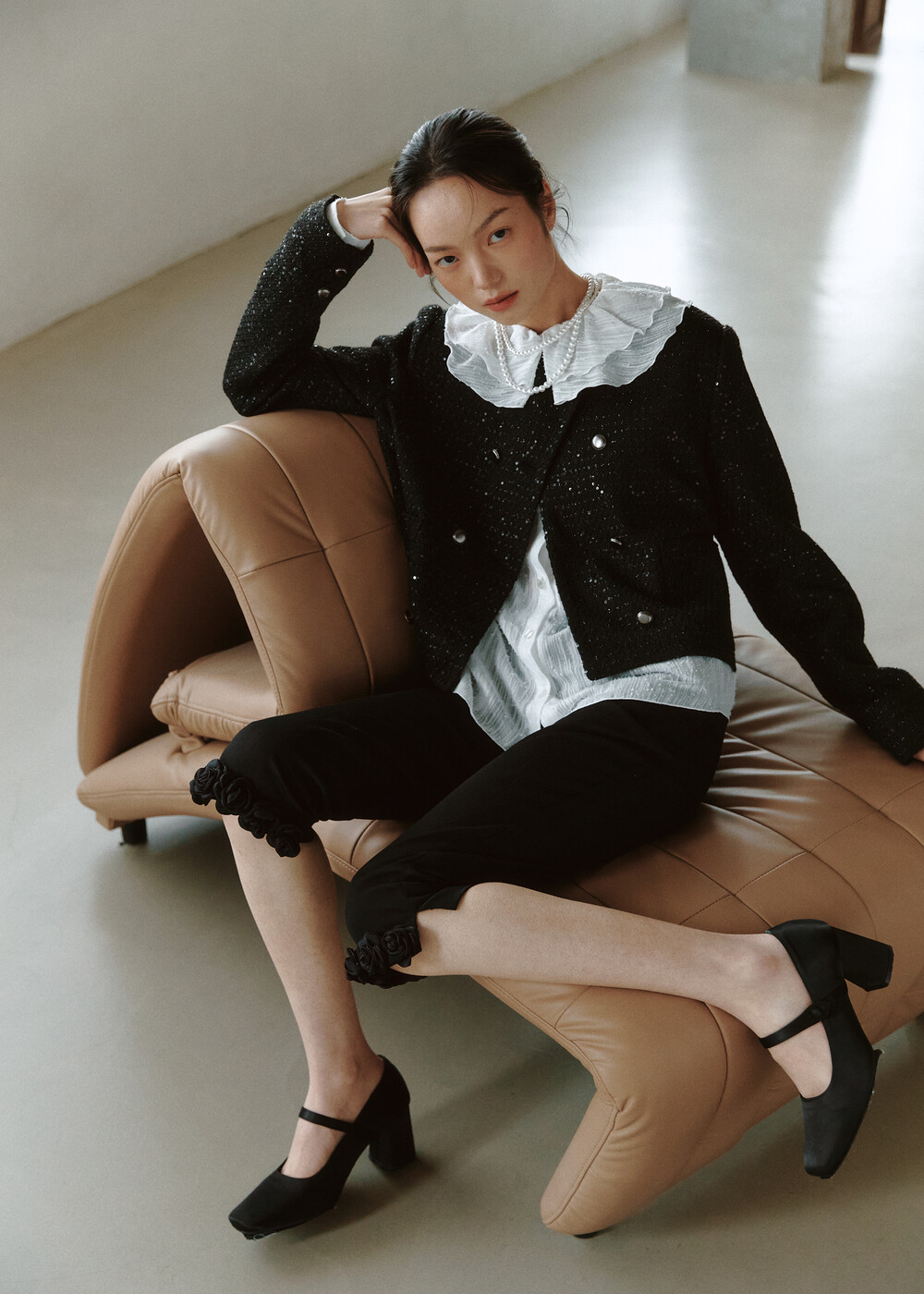 ㆍ카라 단과 밑단의 가볍게 마무리한 봉제 방식으로 여리여리한 무드를 연출